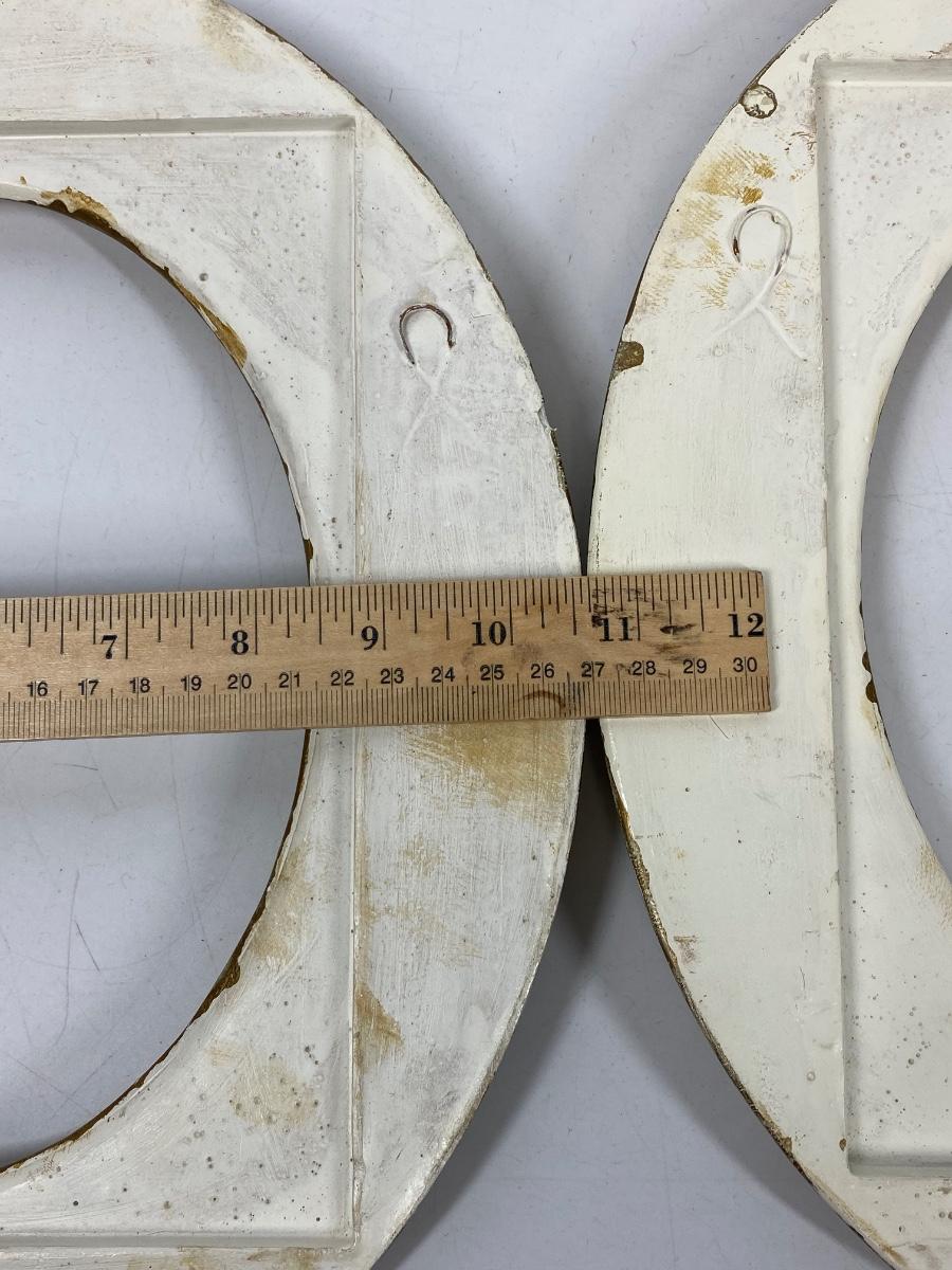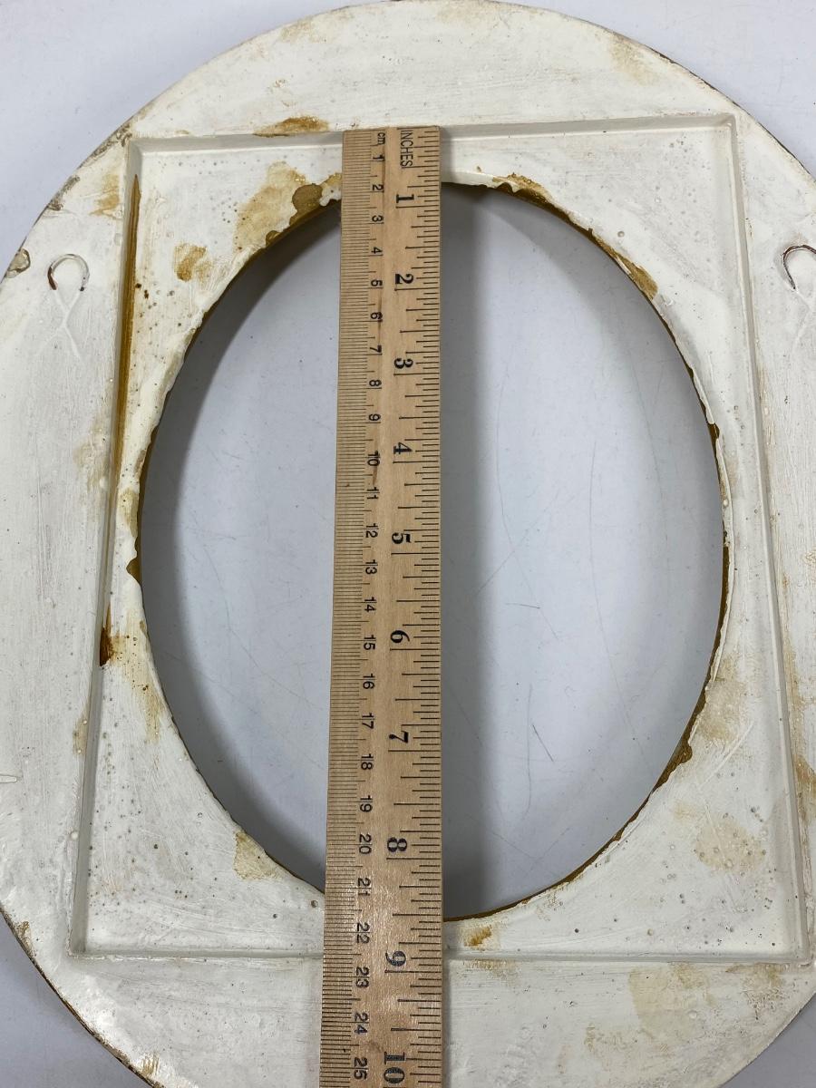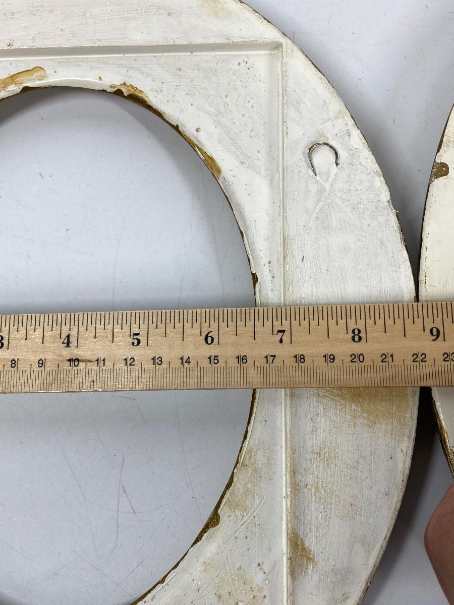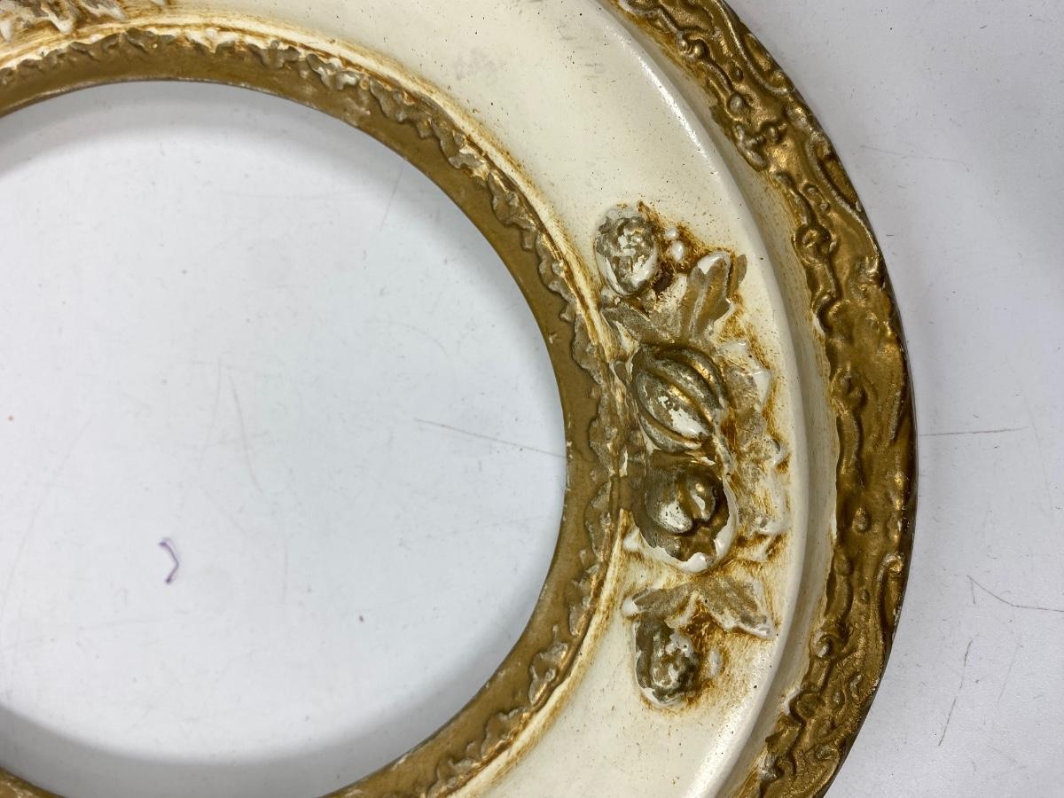 Pair of Vintage Antique Plaster Oval Frames Floral Details Gold Trim. In good, aged condition. No glass or backs. Worn look to the gold, can be repainted if desires. Has two metal loop brackets in the back for hanging. About 7x9 inside opening and 12x9 outside of frame. No maker marks.