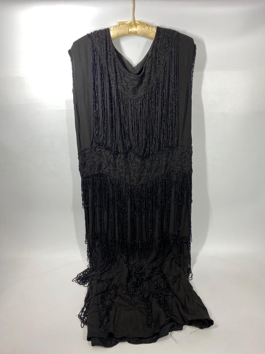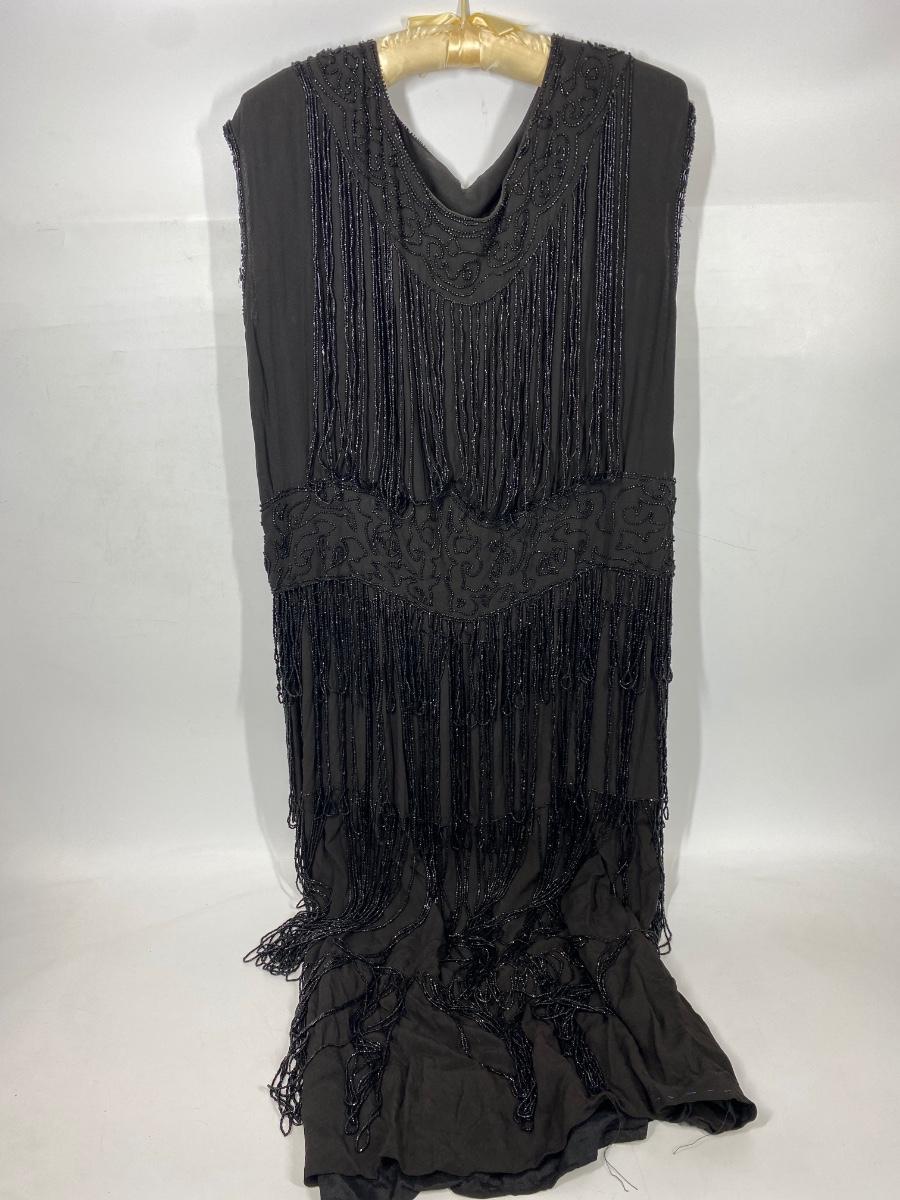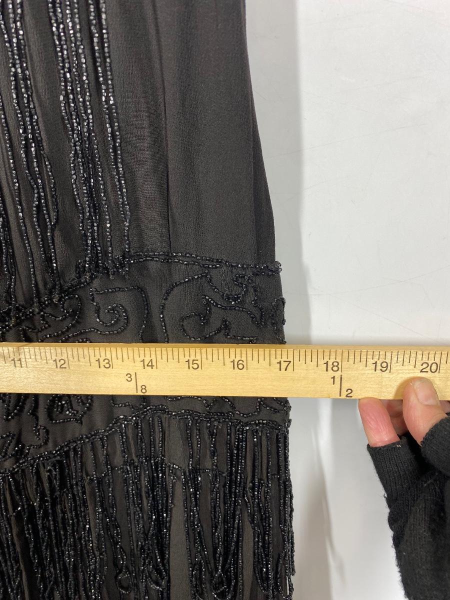 Vintage Black Beaded Fringed Flapper Style Sleeveless Dress. In good vintage condition. Bead work makes the dress heavy. Has snaps on one shoulder and under the armpit on the same side for easy wearing. Did not find any holes and the dress can probably be worn with care. Large than other clothes from this estate, waist measured about 17".