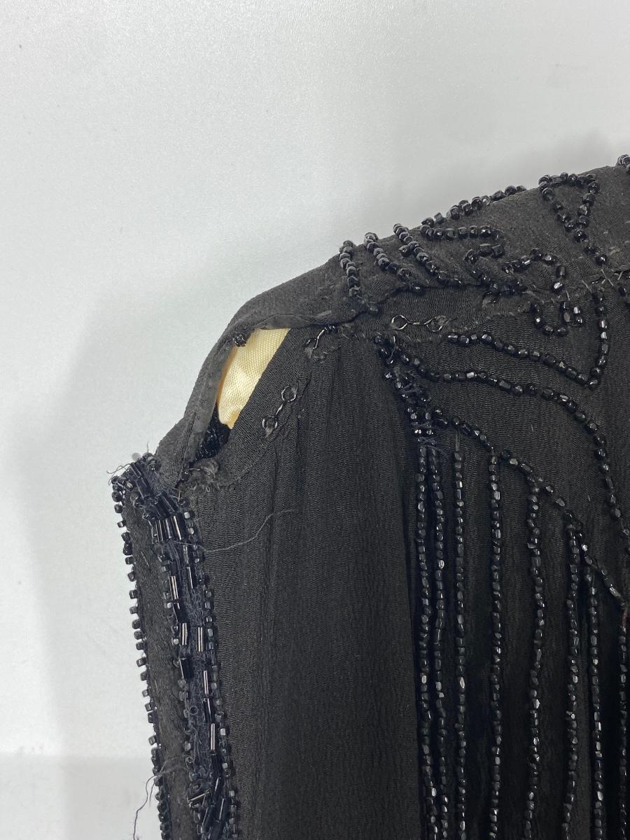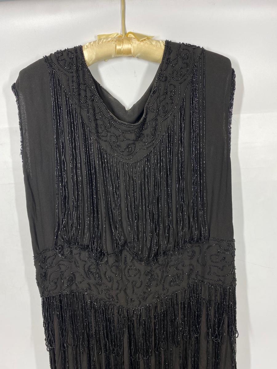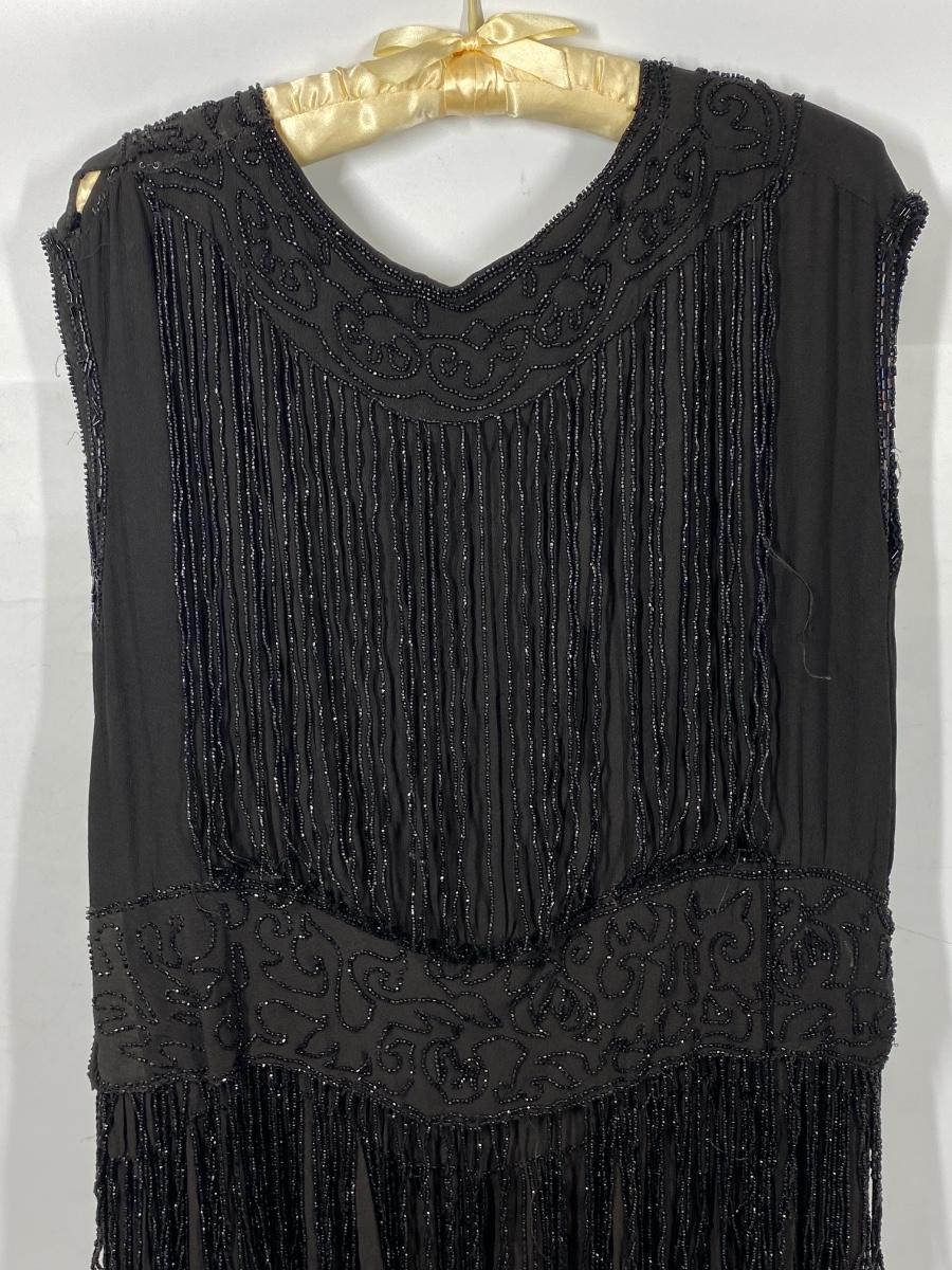 Vintage Black Beaded Fringed Flapper Style Sleeveless Dress. In good vintage condition. Bead work makes the dress heavy. Has snaps on one shoulder and under the armpit on the same side for easy wearing. Did not find any holes and the dress can probably be worn with care. Large than other clothes from this estate, waist measured about 17".