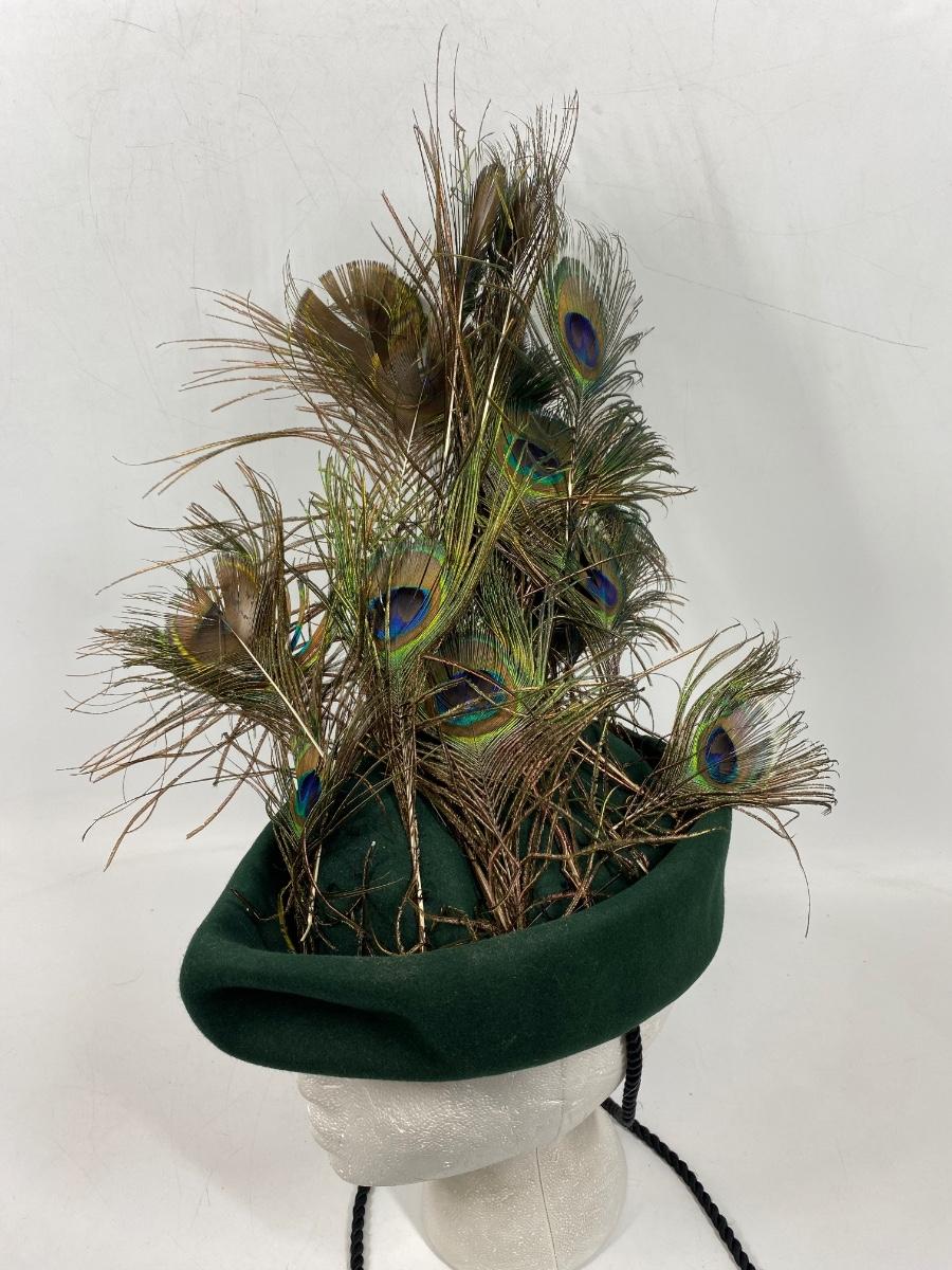 Vintage Green Peter Pan Style Hat with Peacock Feathers. In need of a little work, has potential.