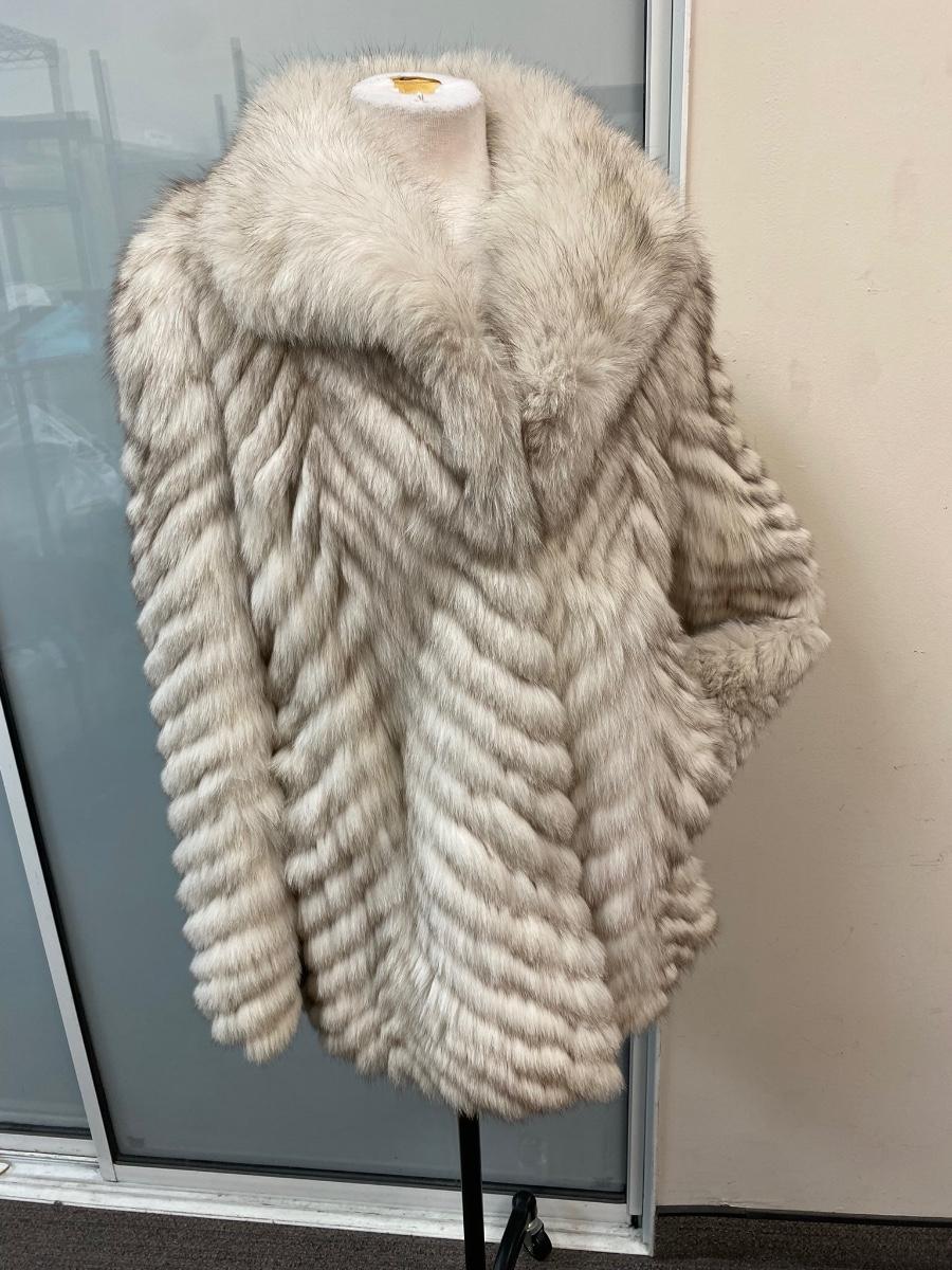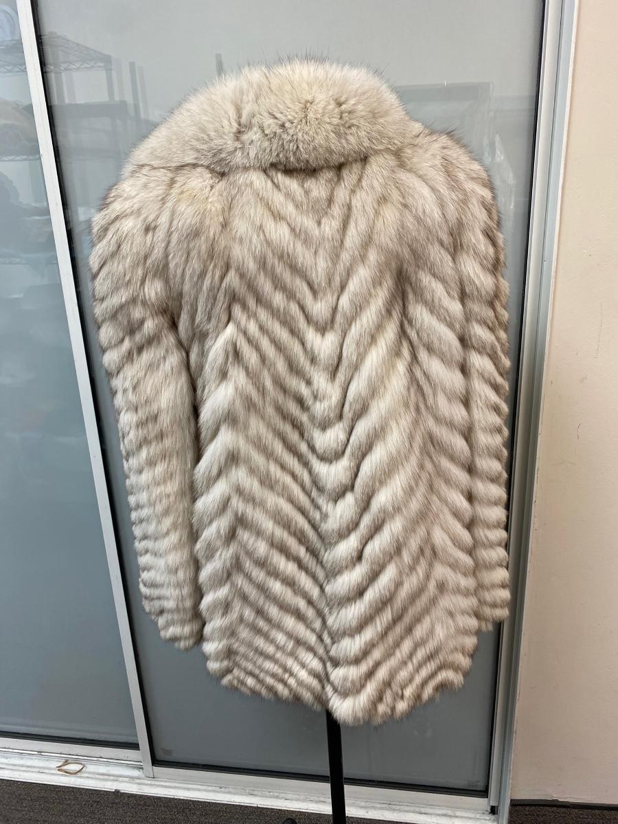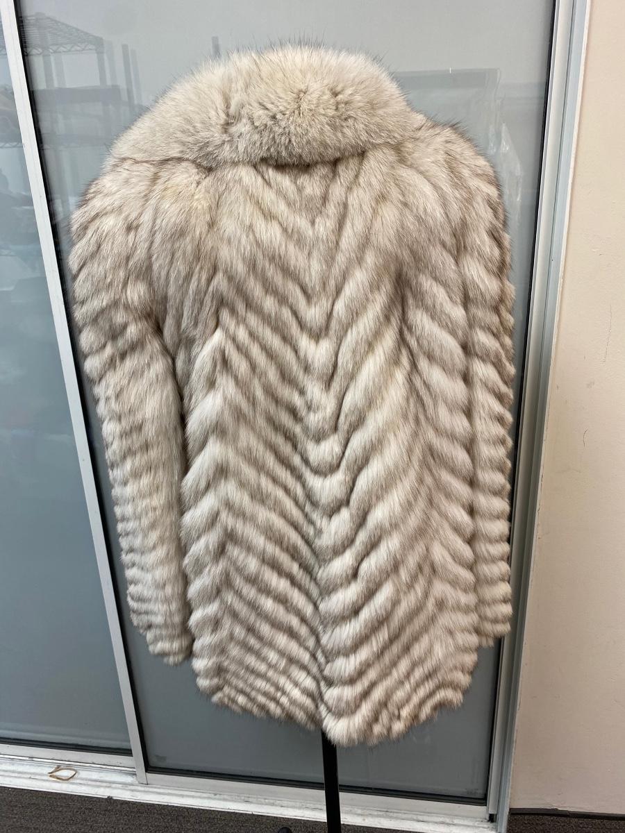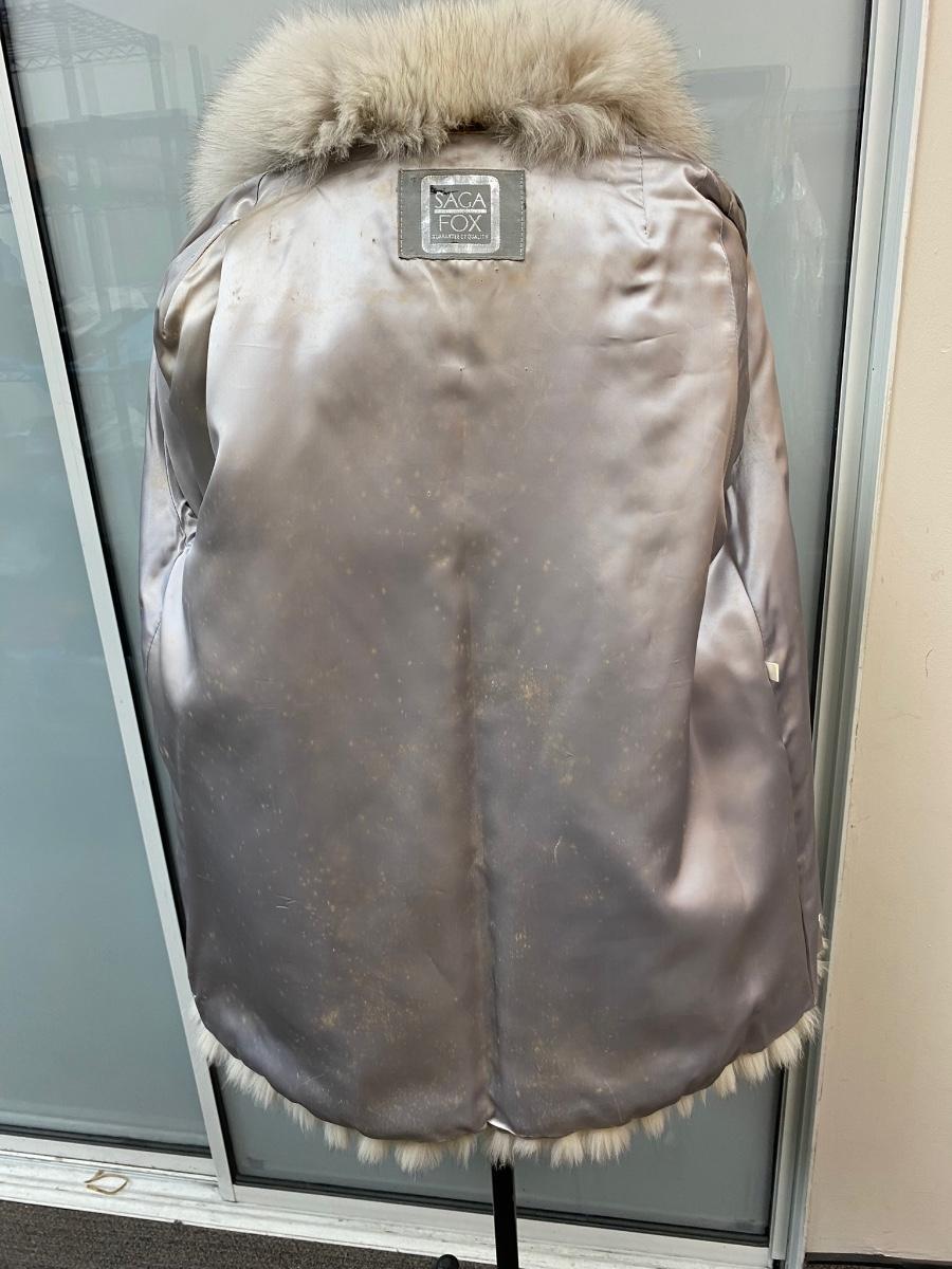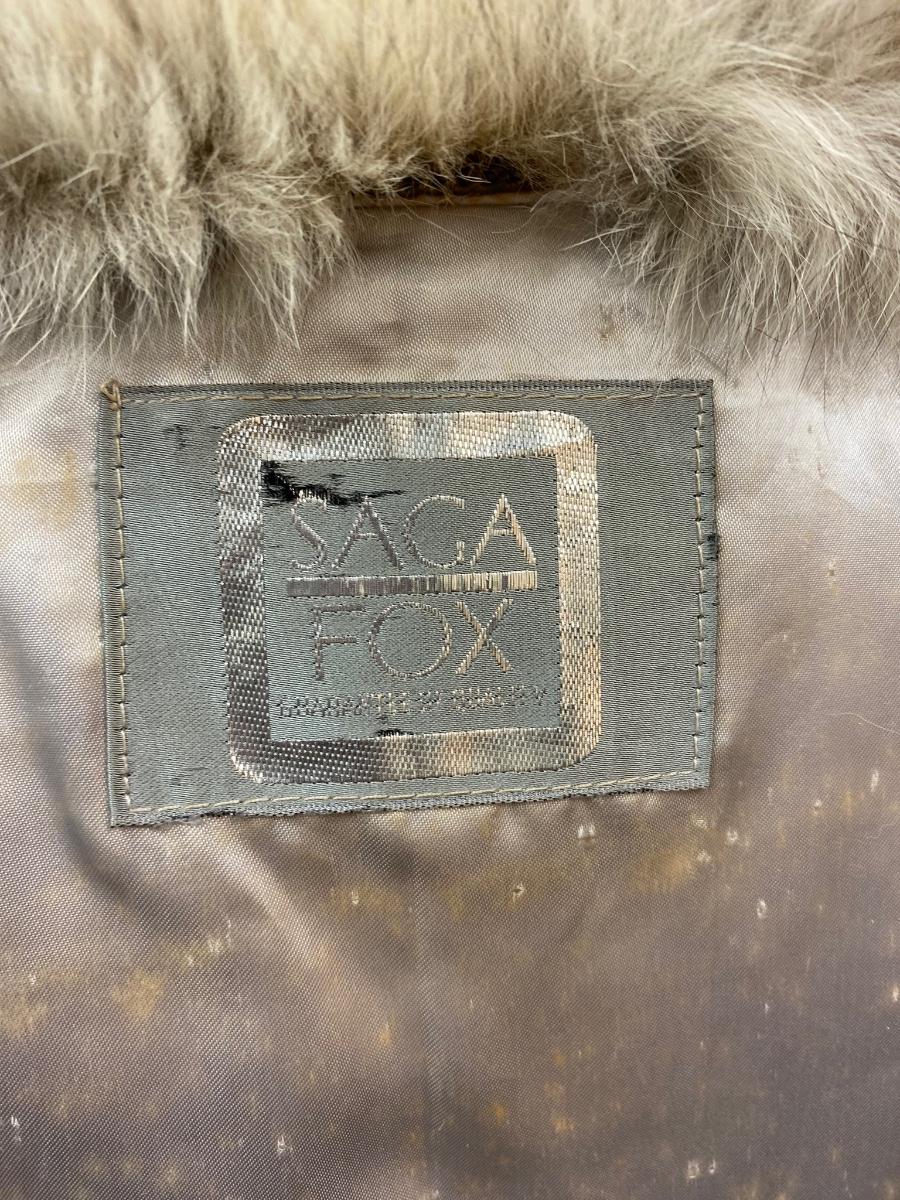 Vintage Silver White Grey Fur Coat Jacket Saga Fox Size 40. The fur is in good condition, very soft, no falling out spots. The lining is speckled, possibly from age and storage. No odors or smells. Great linear design cut to the fur. Fits like a medium. Has three hook closures in the front.