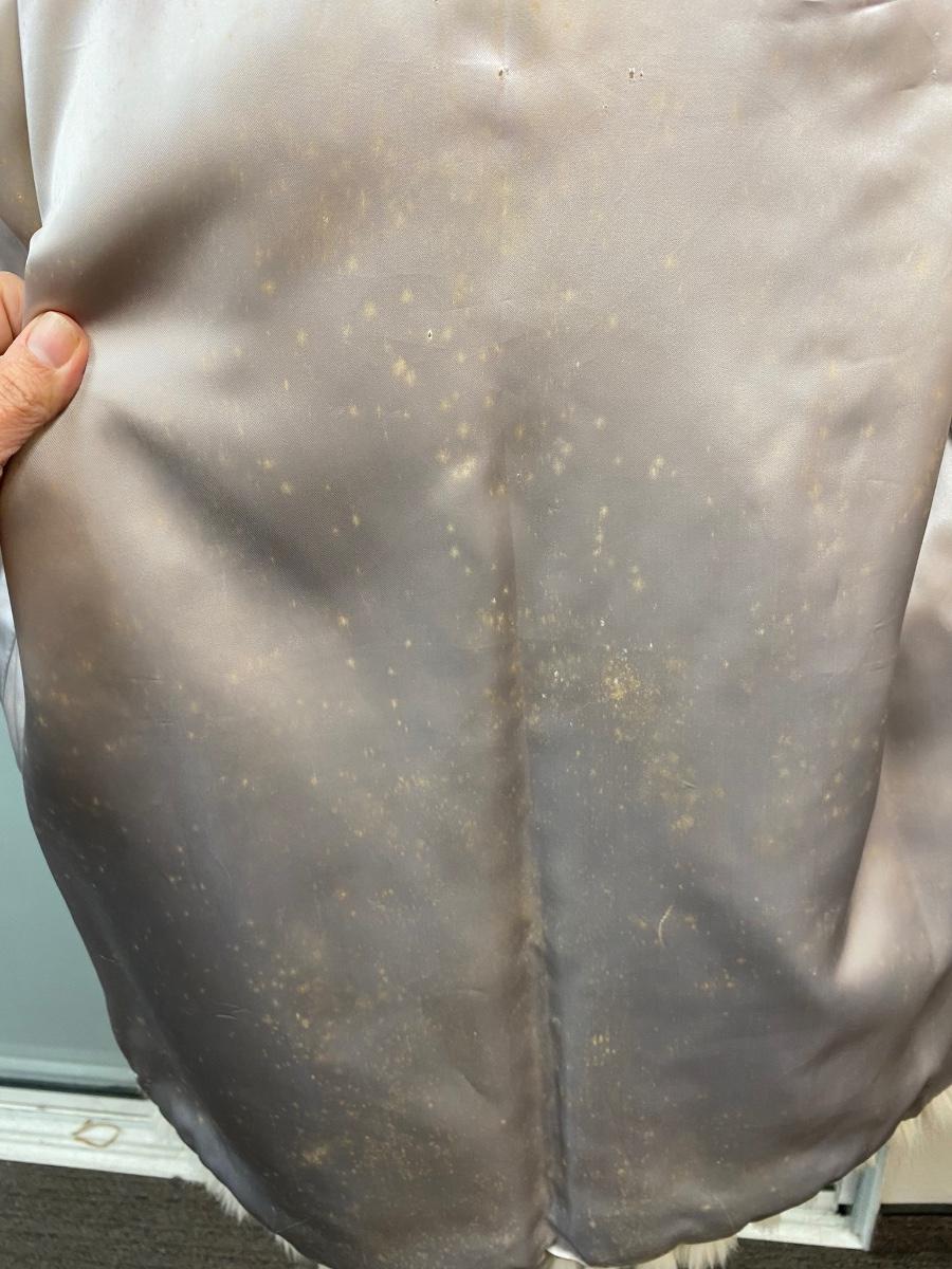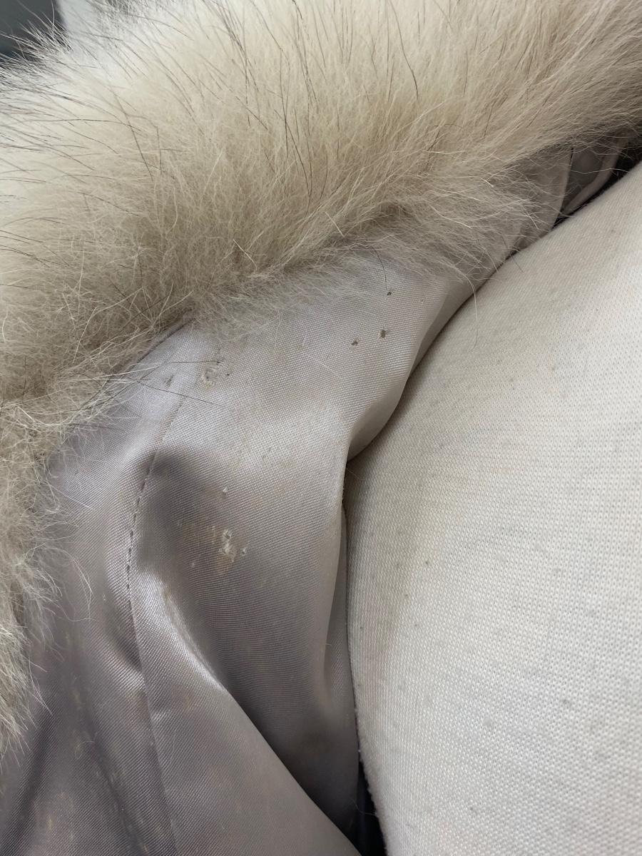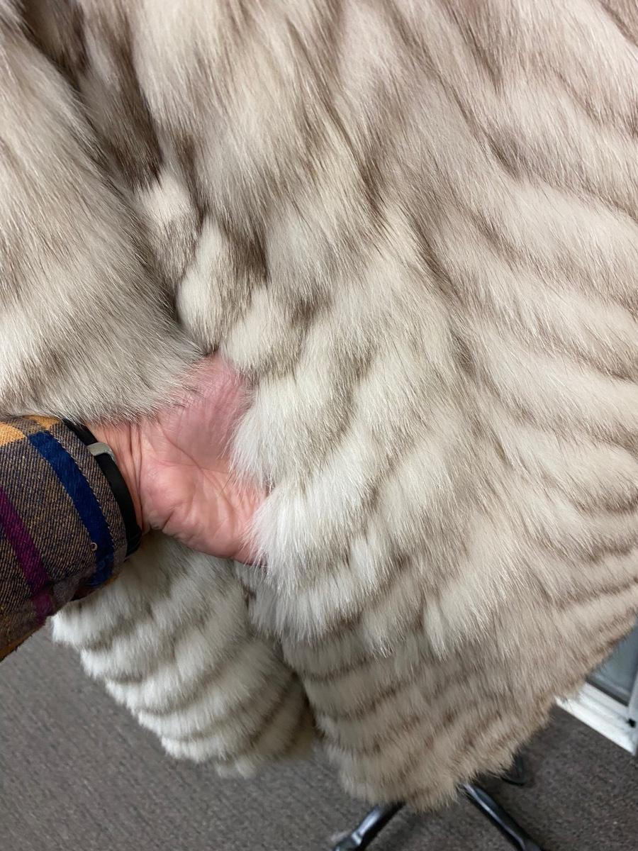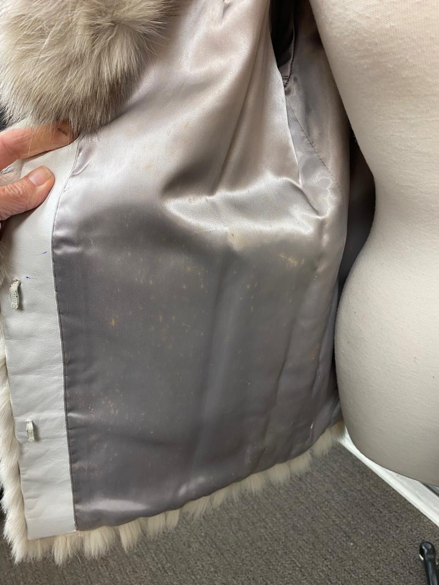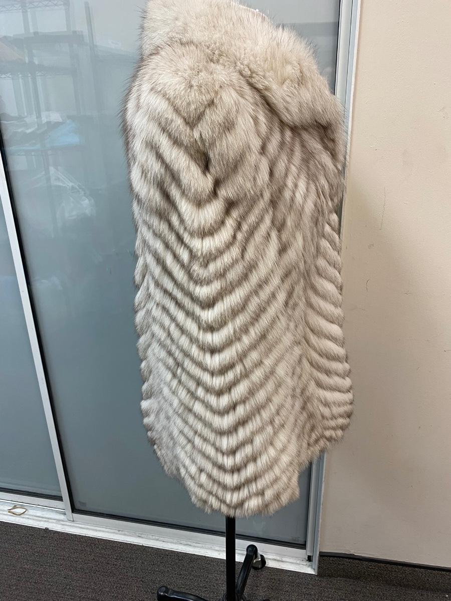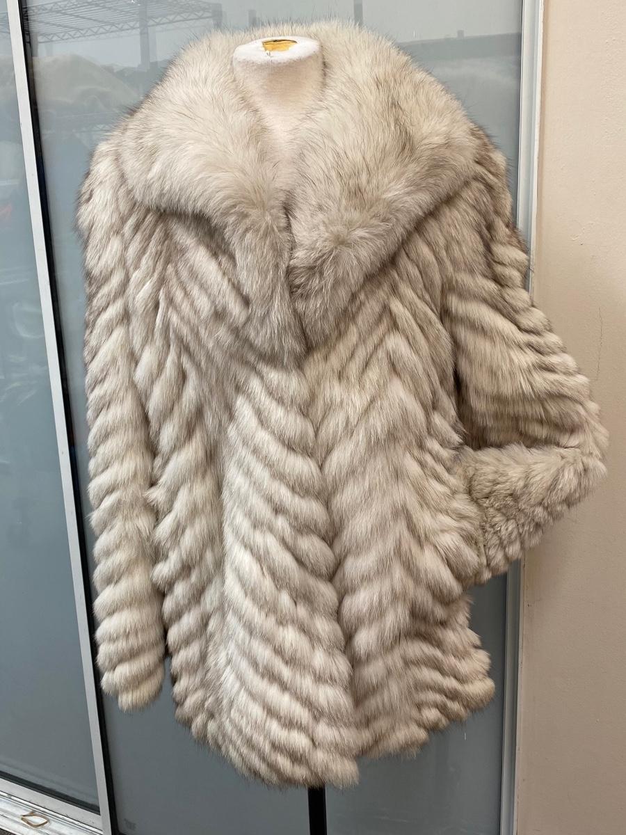 Vintage Silver White Grey Fur Coat Jacket Saga Fox Size 40. The fur is in good condition, very soft, no falling out spots. The lining is speckled, possibly from age and storage. No odors or smells. Great linear design cut to the fur. Fits like a medium. Has three hook closures in the front.