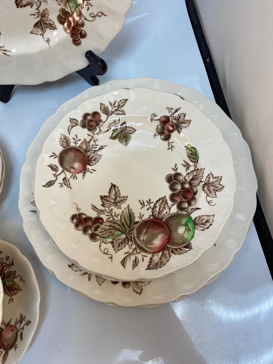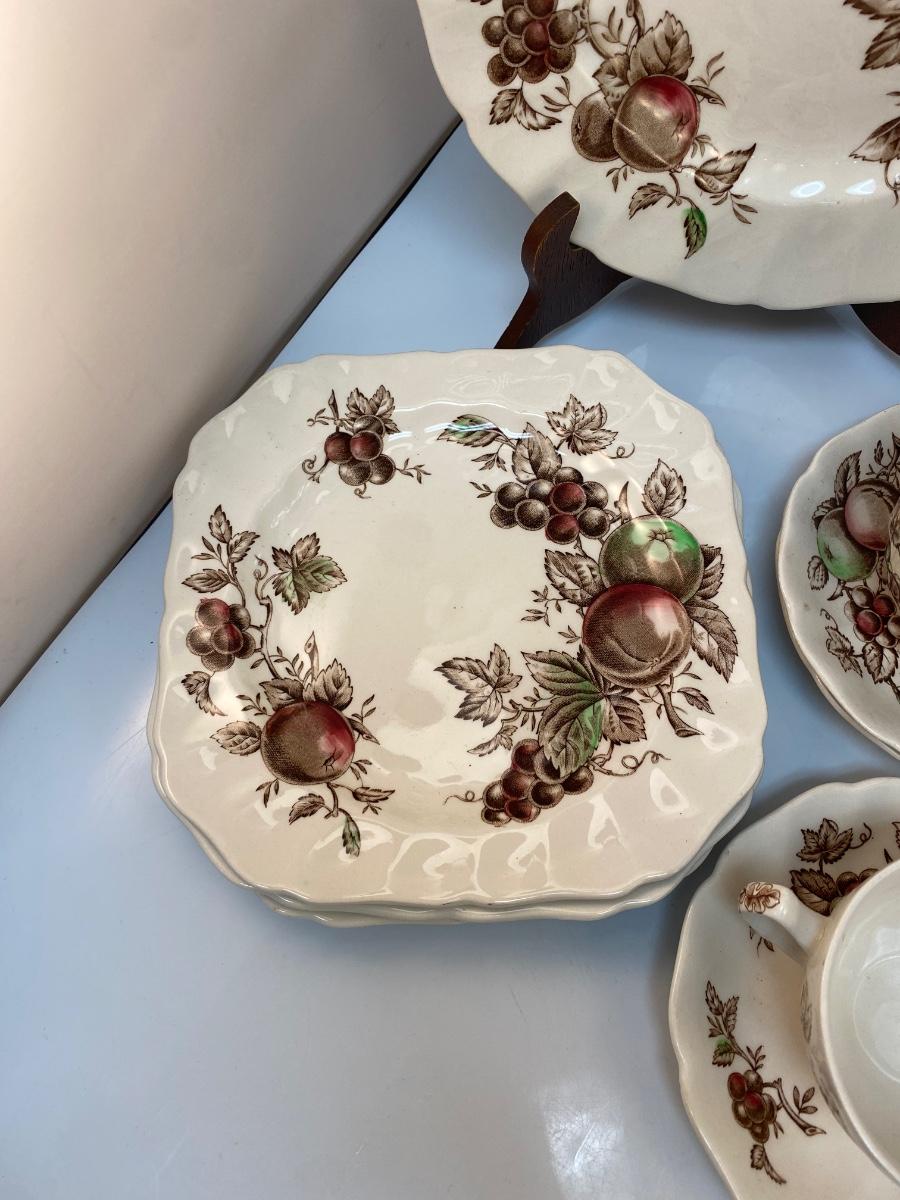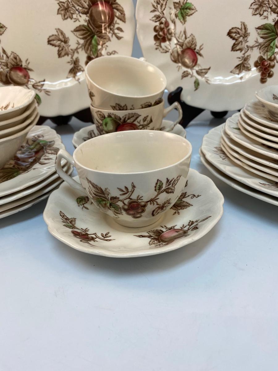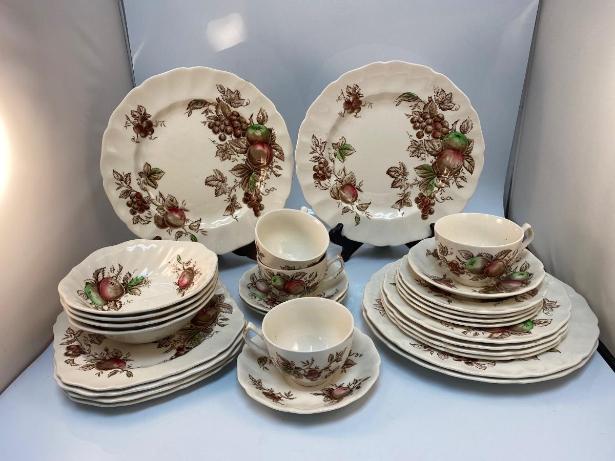28 Pieces Johnson Brothers Harvest Time Dishware Fruit Pattern China Service for 4. in good vintage condition, no chips, may have the start of light crazing in places. Includes 4 each - dinner plate, square salad plate, dessert plate, bread plate, teacup, saucer, and soup bowl.