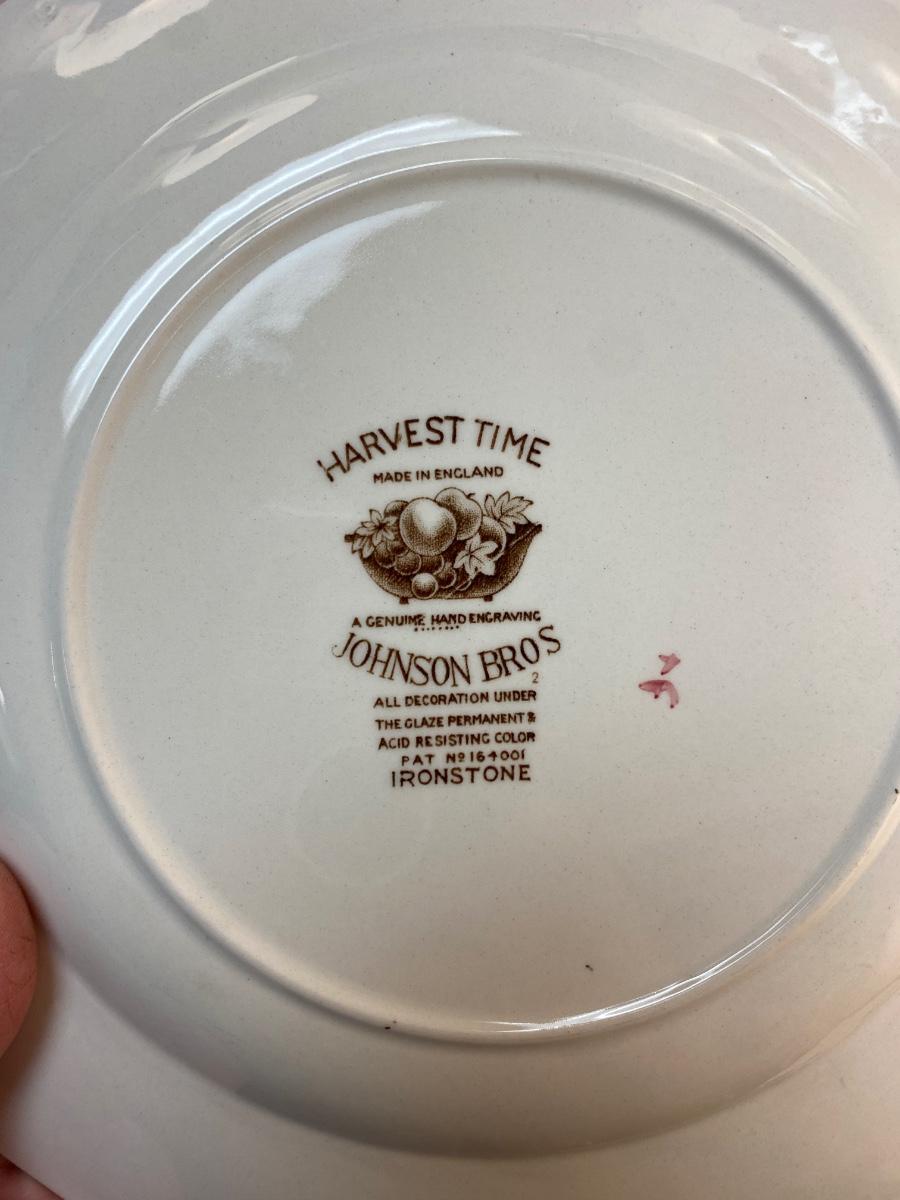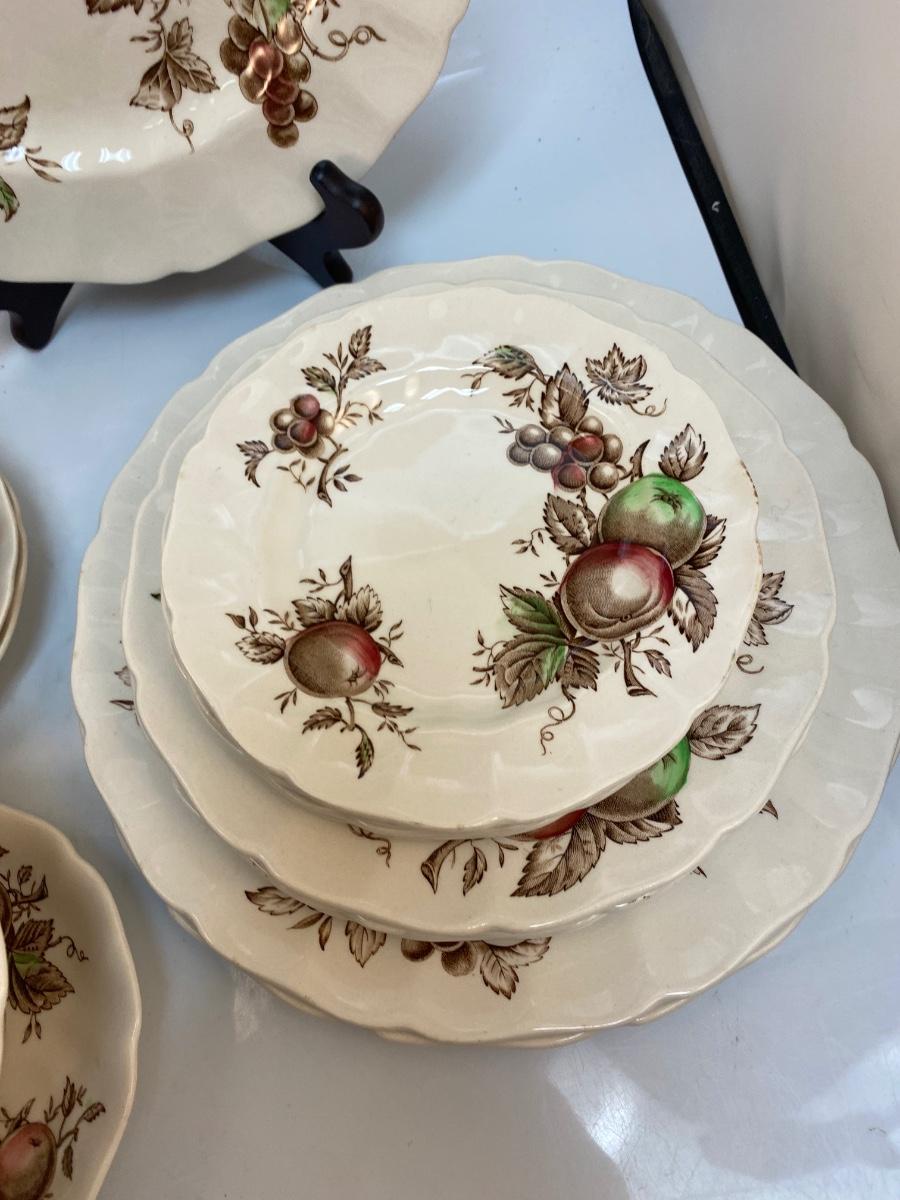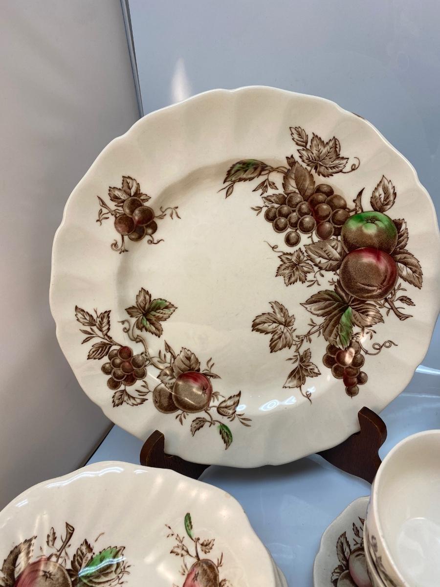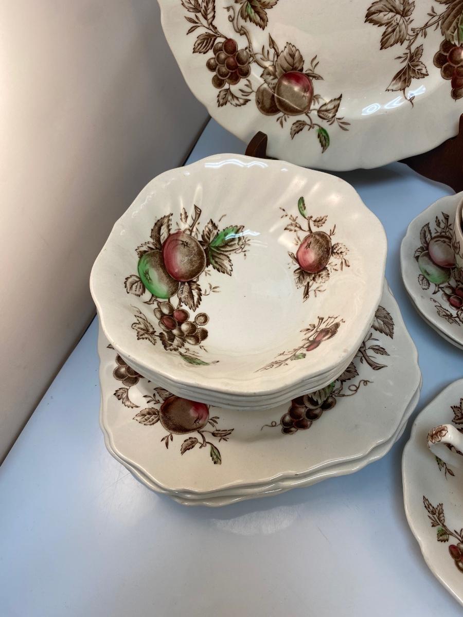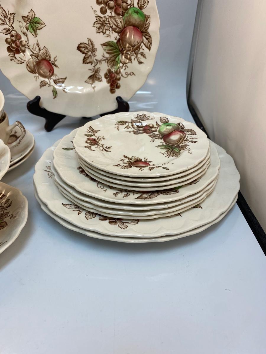 28 Pieces Johnson Brothers Harvest Time Dishware Fruit Pattern China Service for 4. in good vintage condition, no chips, may have the start of light crazing in places. Includes 4 each - dinner plate, square salad plate, dessert plate, bread plate, teacup, saucer, and soup bowl.