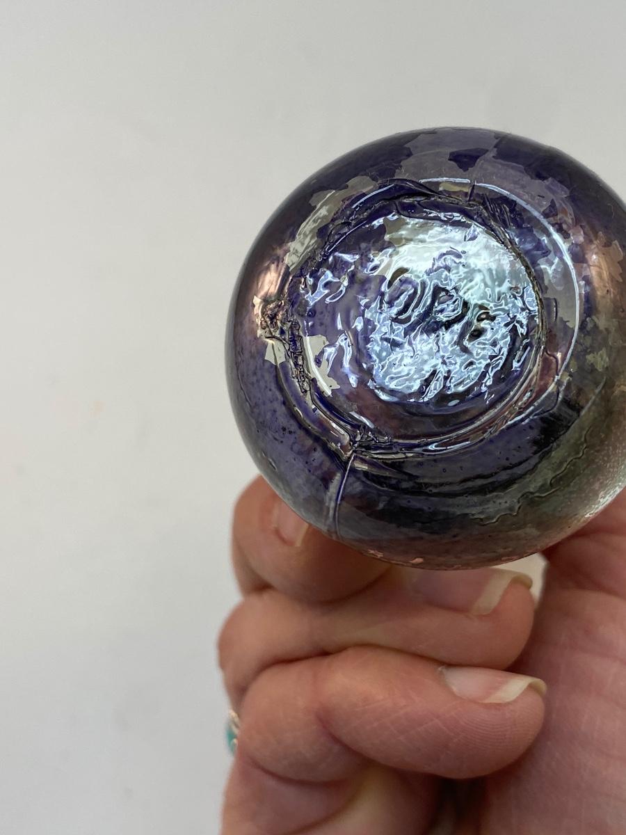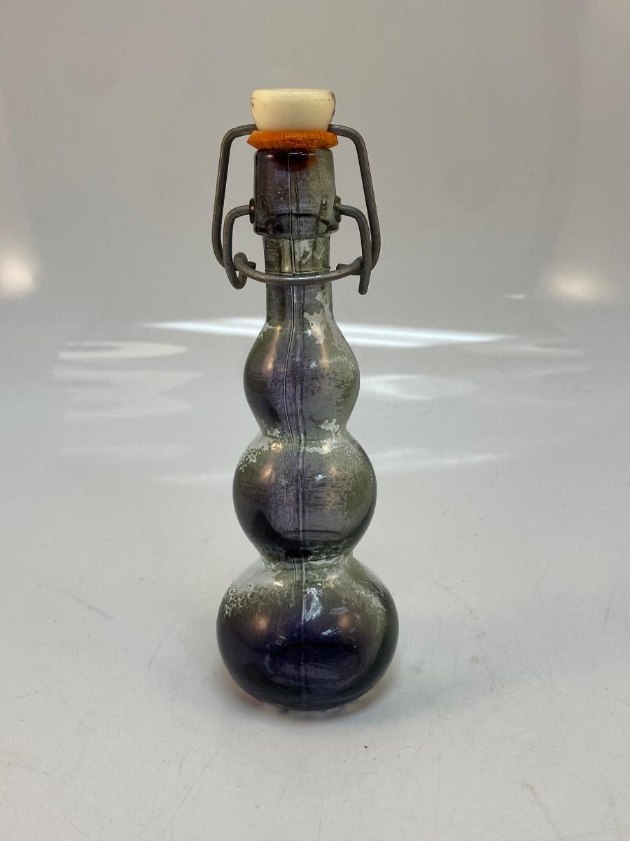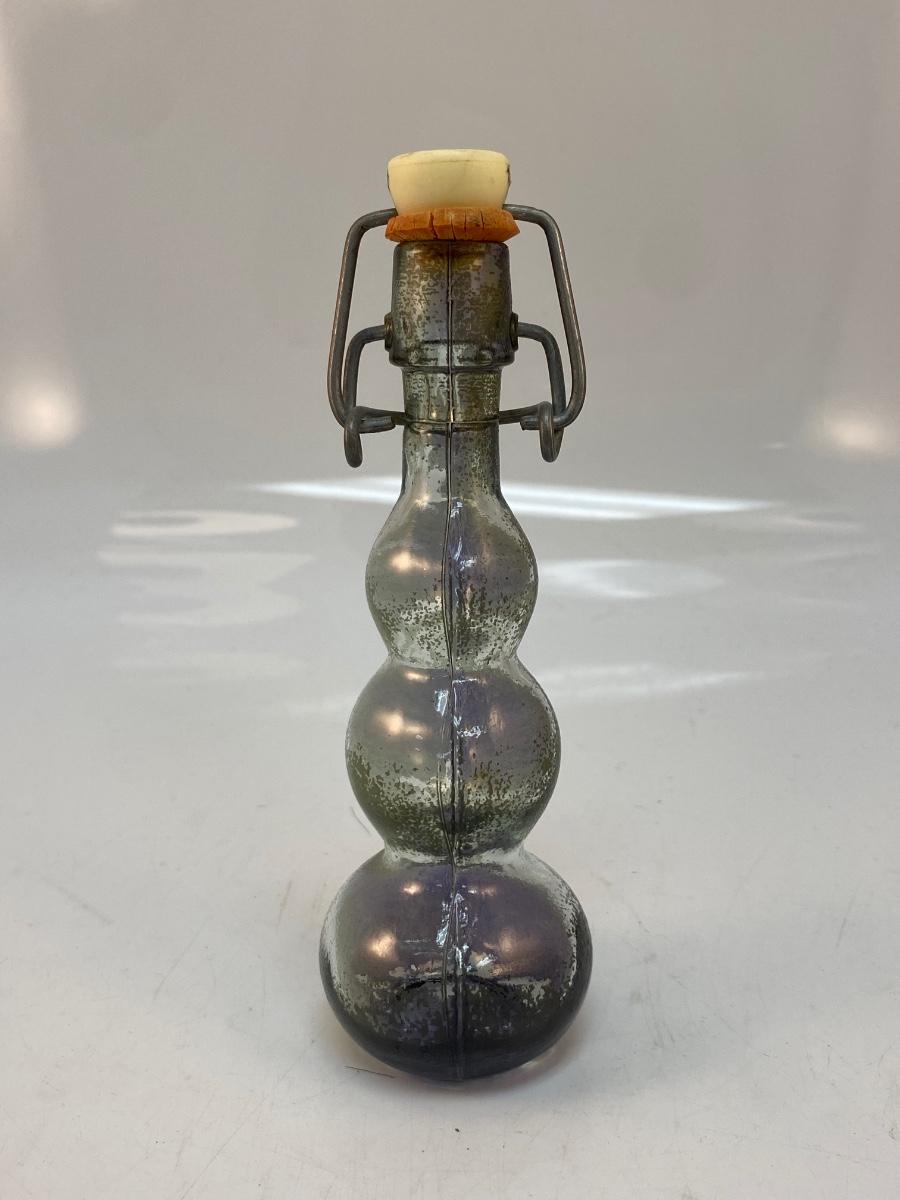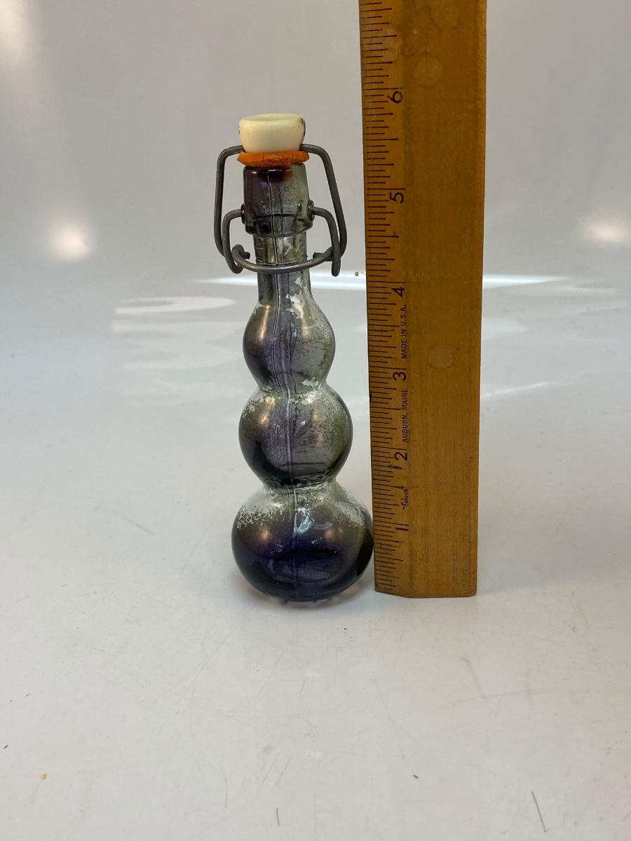 Small Miniature Triple Bulb Glass Bottle with Hinge Top Stopper. Bottle is in good condition except the paint film seems to be peeling off. Under 6" size