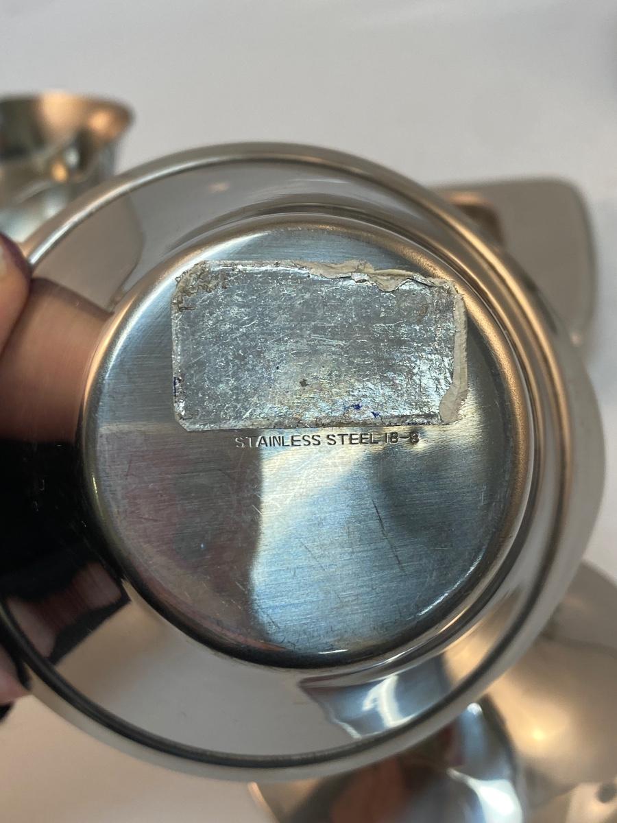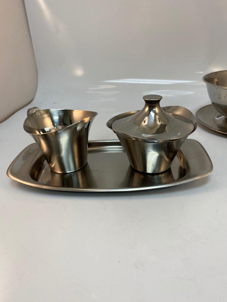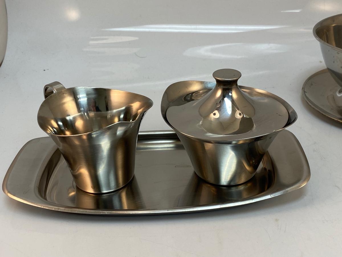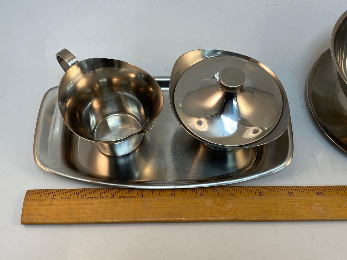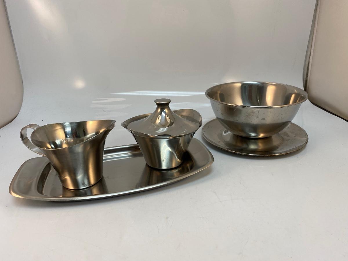 Vintage Stainless Steel Kitchenware Cream and Sugar Small Sauce Condiment Relish Bowl. In good condition. Includes cream pitcher, lidded sugar bowl, small rectangular tray, and a small bowl with attached drip plate. Remnants of stickers on the cream and sugar but can't make out name.