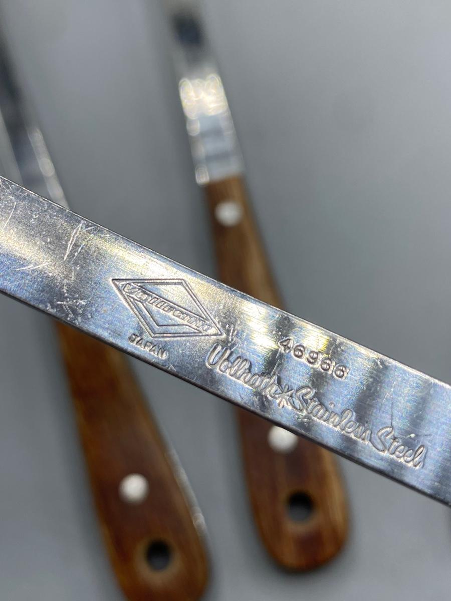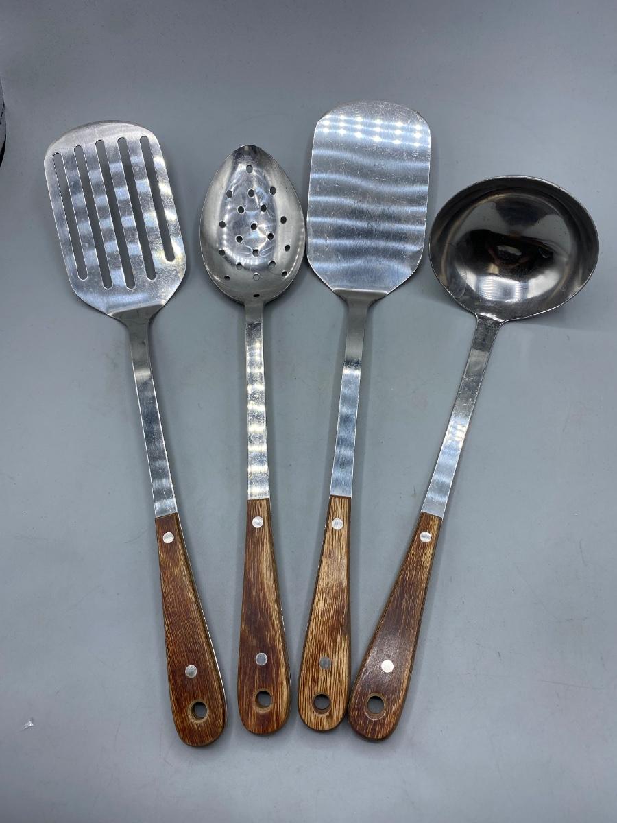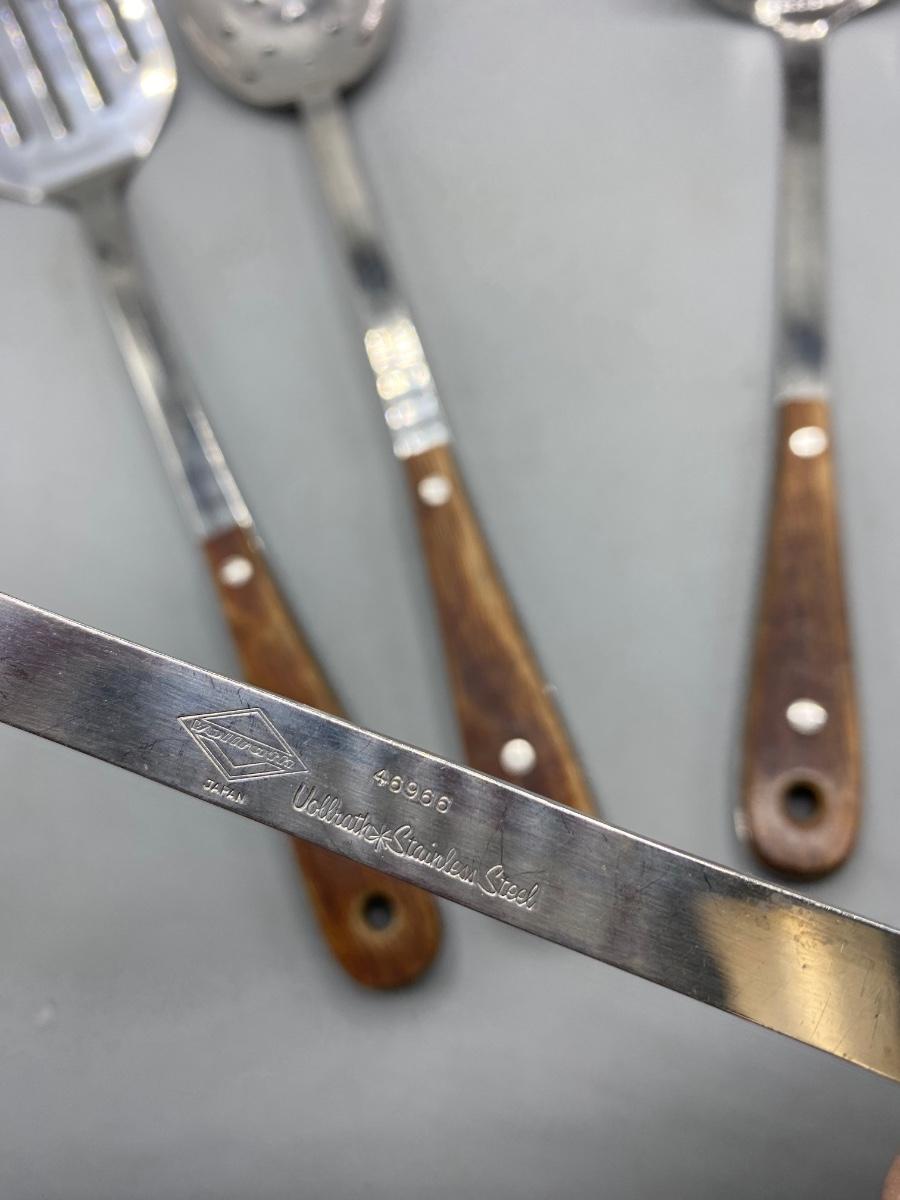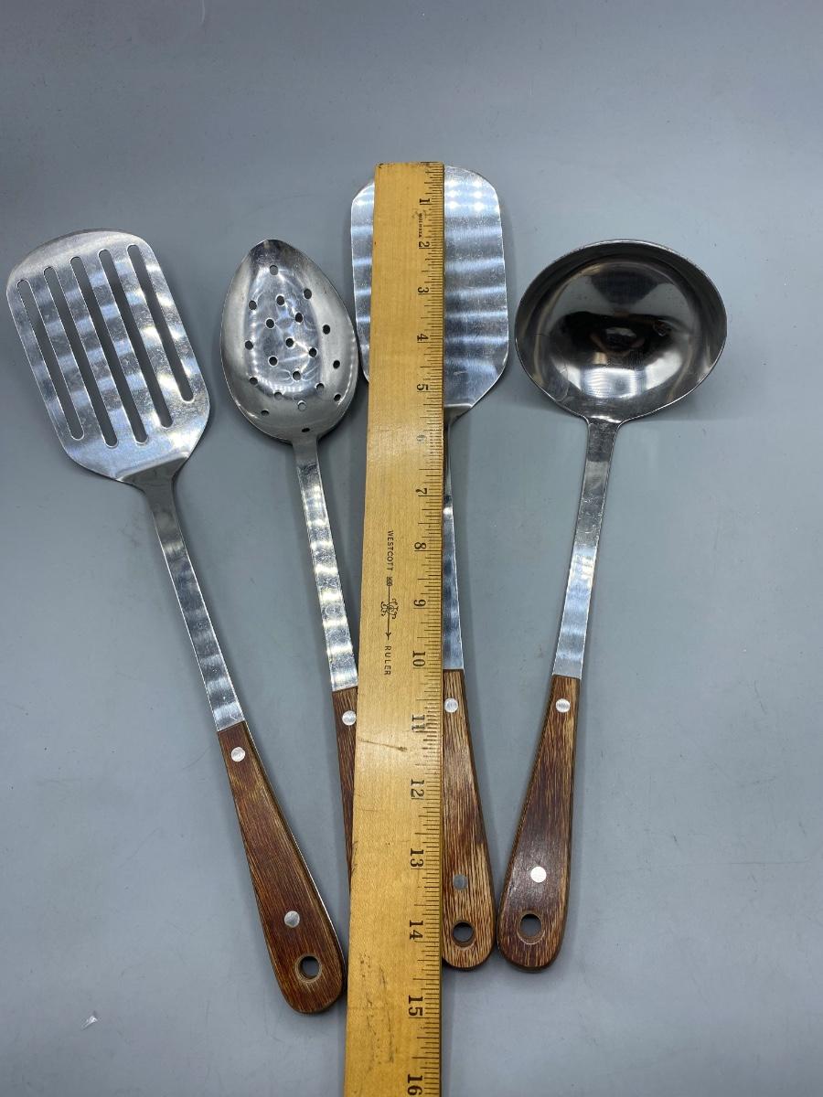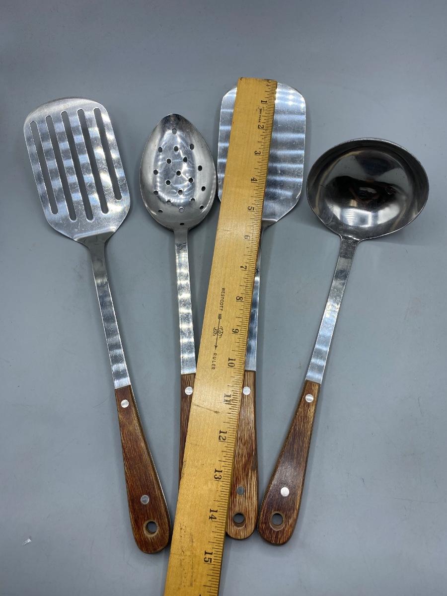 Vintage Vollrath Stainless Steel Large Long Handle Kitchen Utensils Cookware. Two spatulas, ladle, and a slotted spoon. Wood handles, about 15" size. Made in Japan.