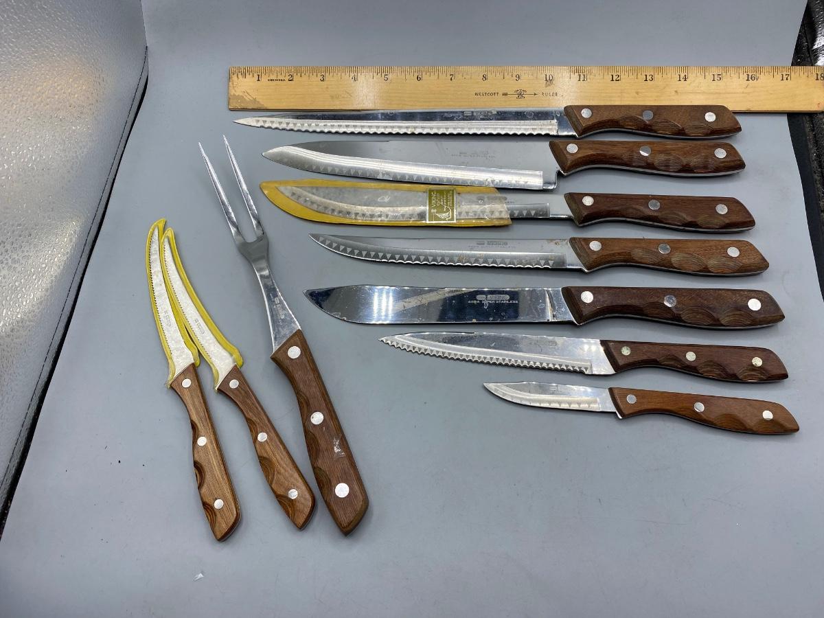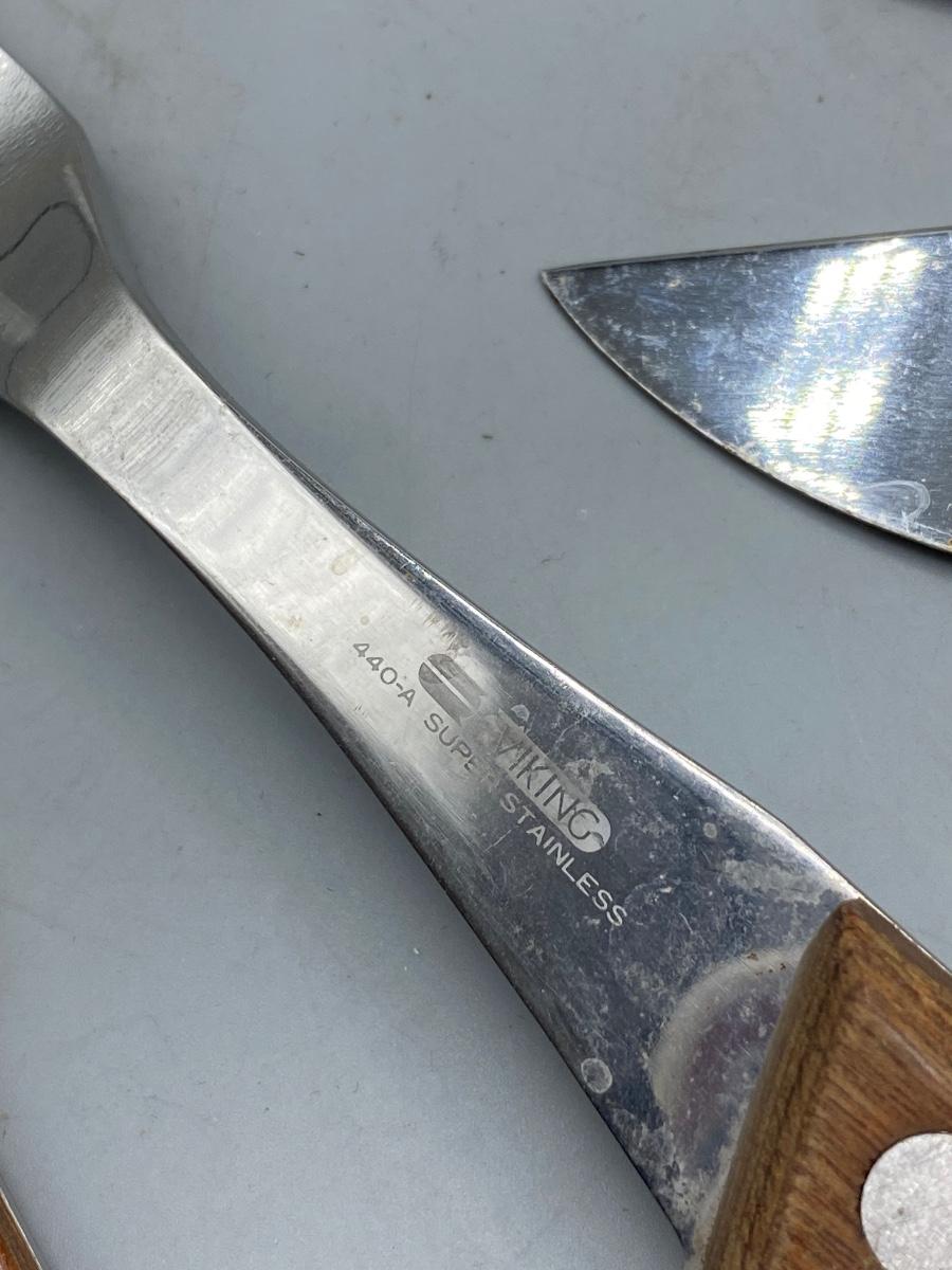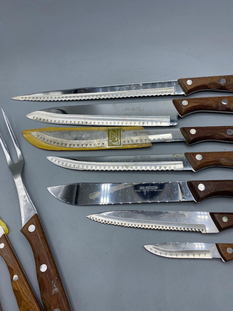 Viking 440-A Super Stainless Steel Kitchen Knife Cutlery Set Wood Handle. Set of 10. 8 different knives, two steak knives, and a meat fork. In good previously used condition,