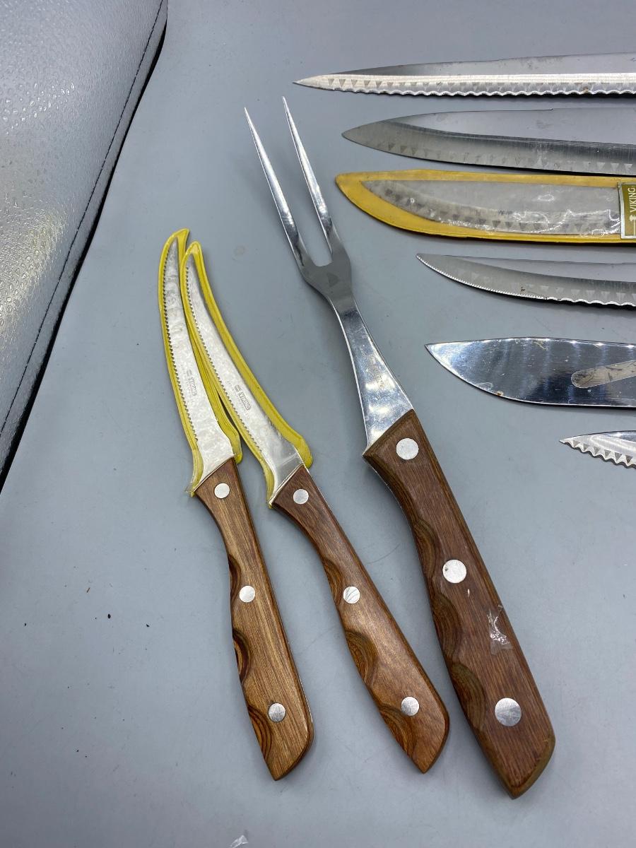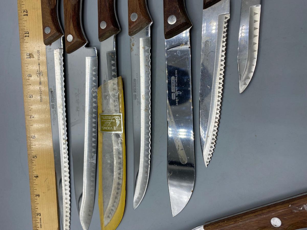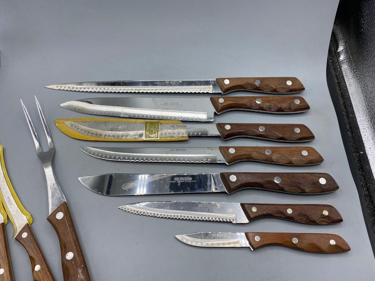 Viking 440-A Super Stainless Steel Kitchen Knife Cutlery Set Wood Handle. Set of 10. 8 different knives, two steak knives, and a meat fork. In good previously used condition,