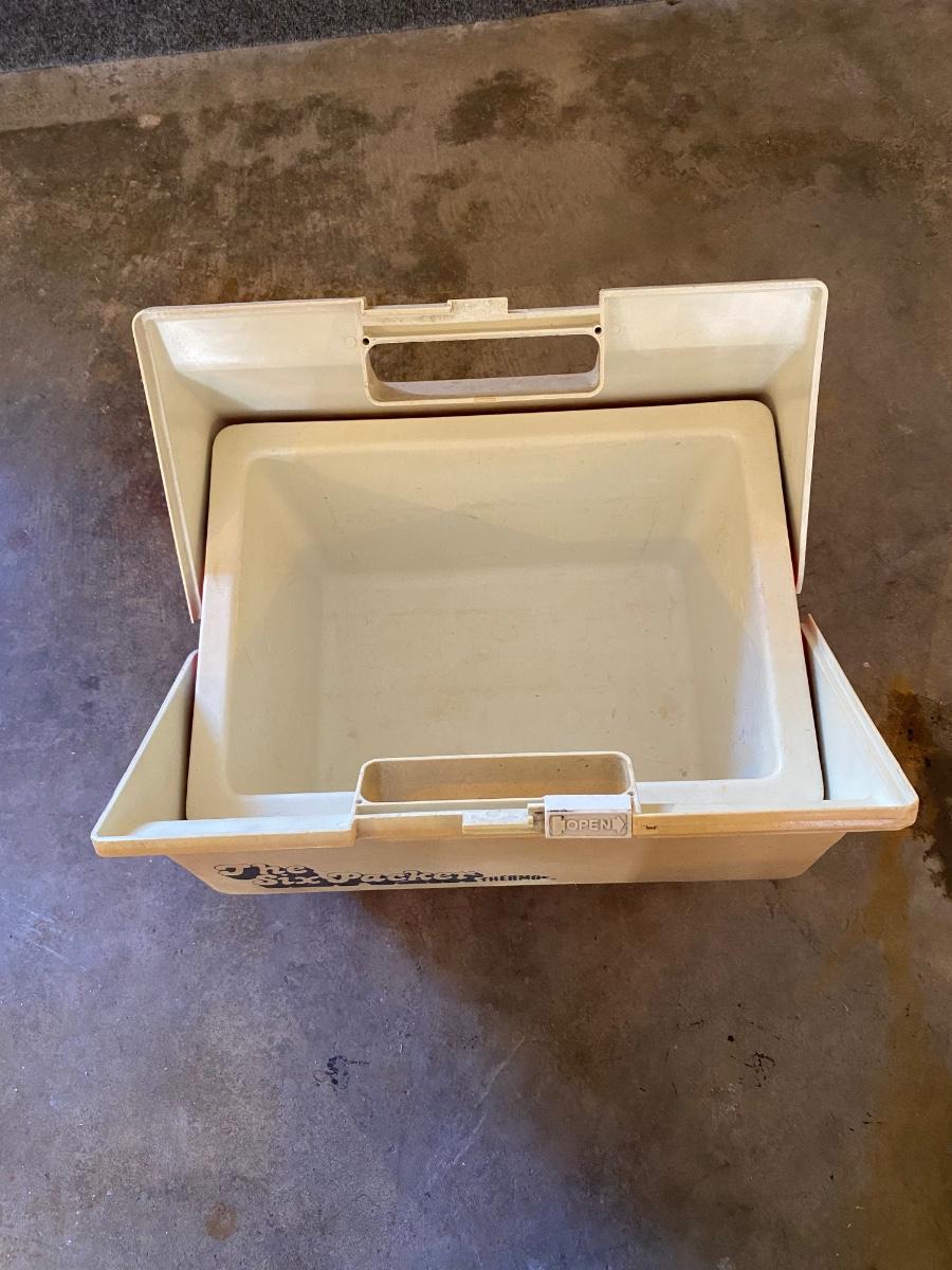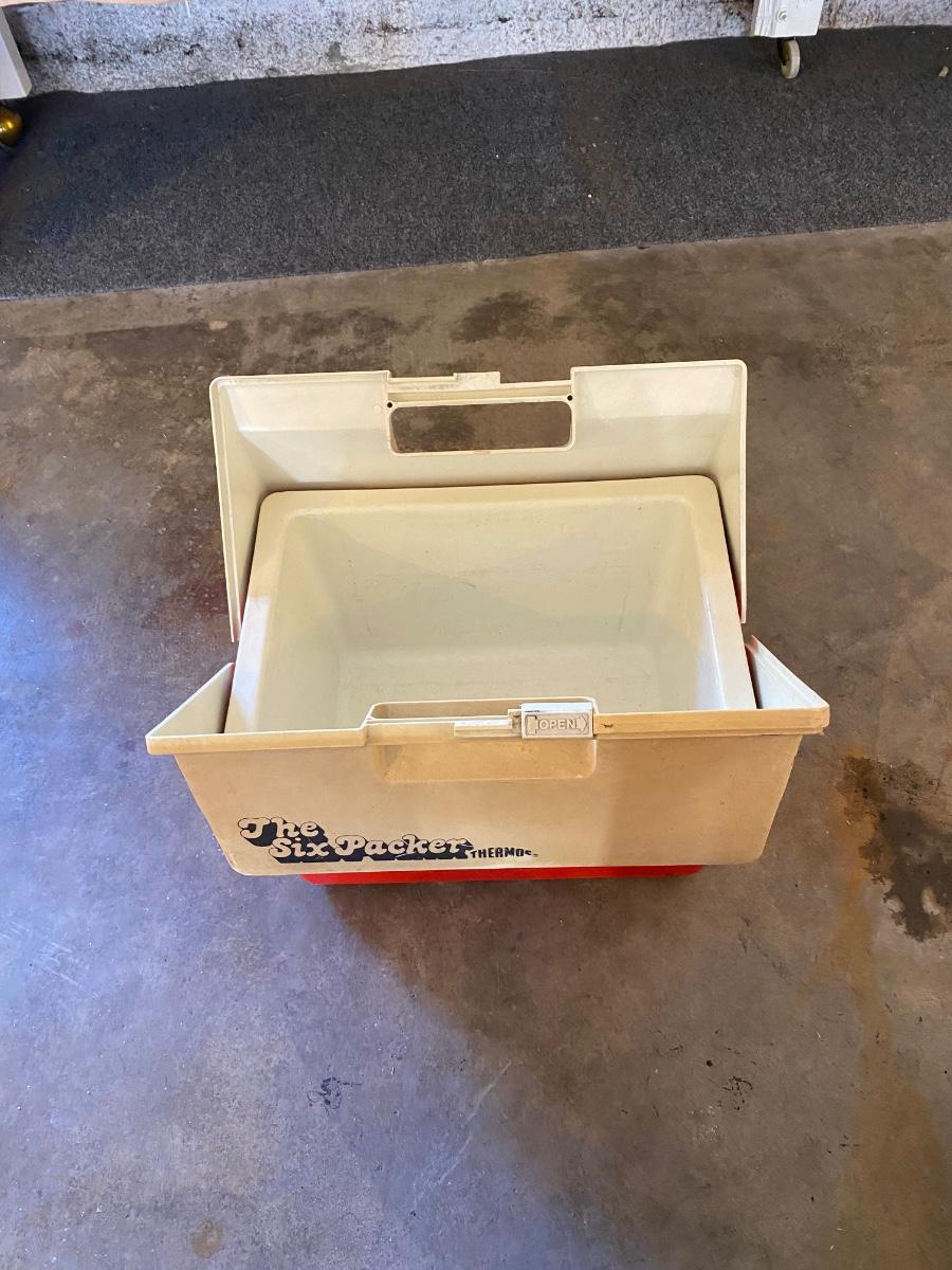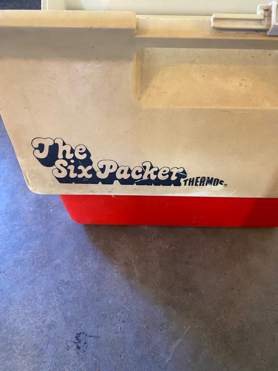 Vintage Red and White Thermos Brand Ice Chest Cooler The Six Packer. Some discoloration from age but looks to be in useable condition.