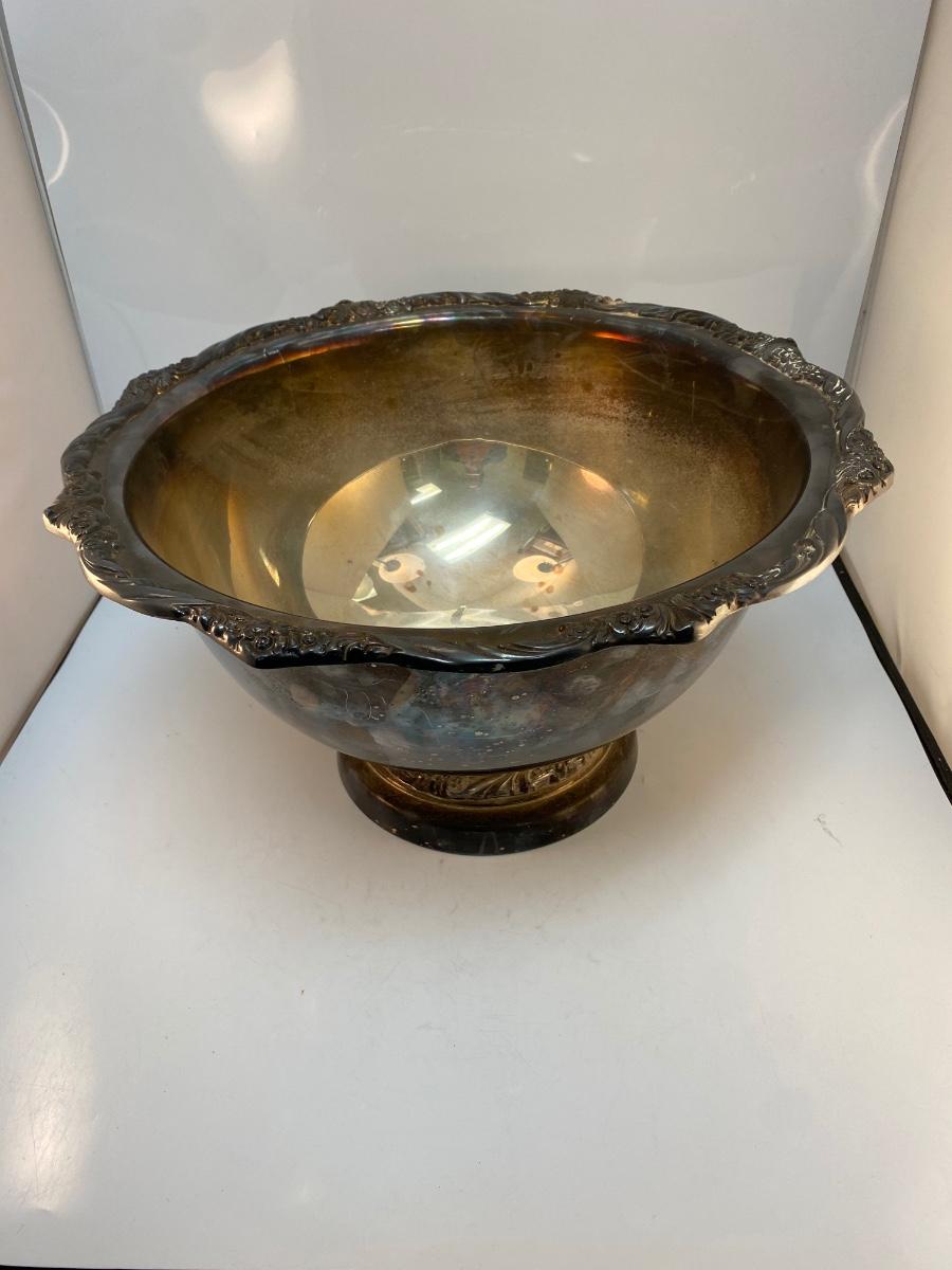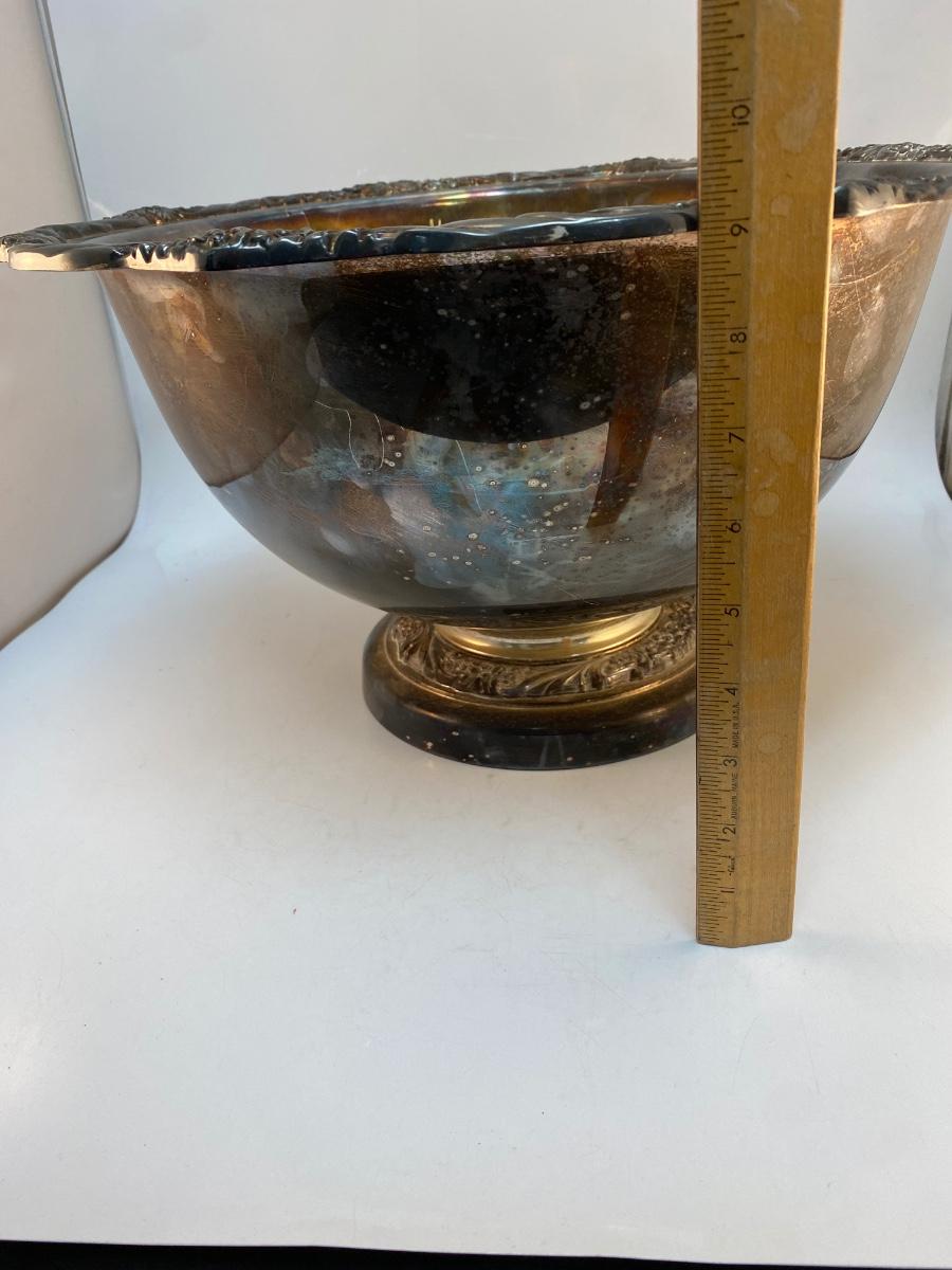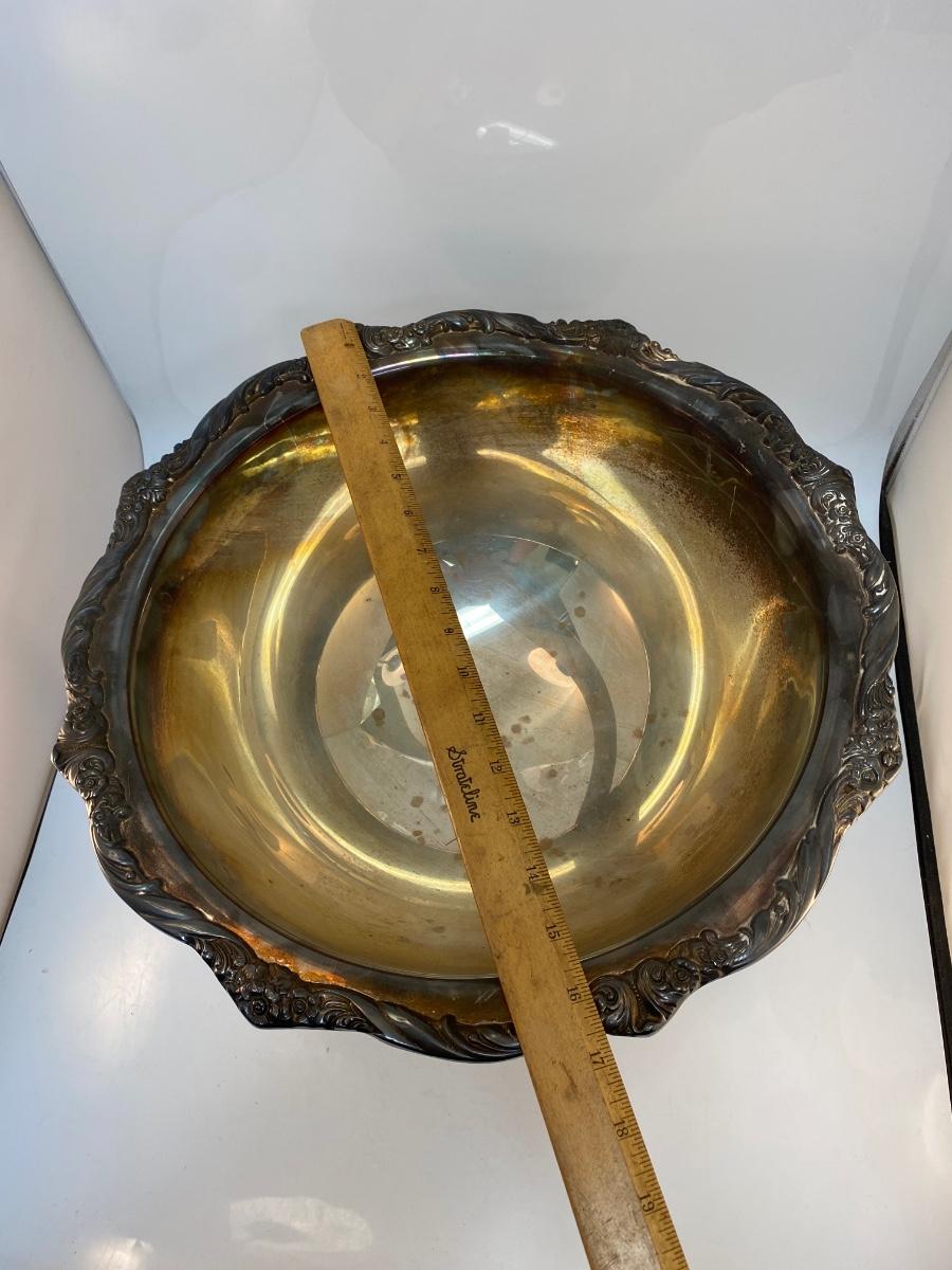 Large Rogers Bros Vintage Silver Plate Punch Serving Bowl Heritage Pattern Floral Edge. Needs to be polished but in otherwise good condition. No dents or dings. Huge, about 17" diameter.