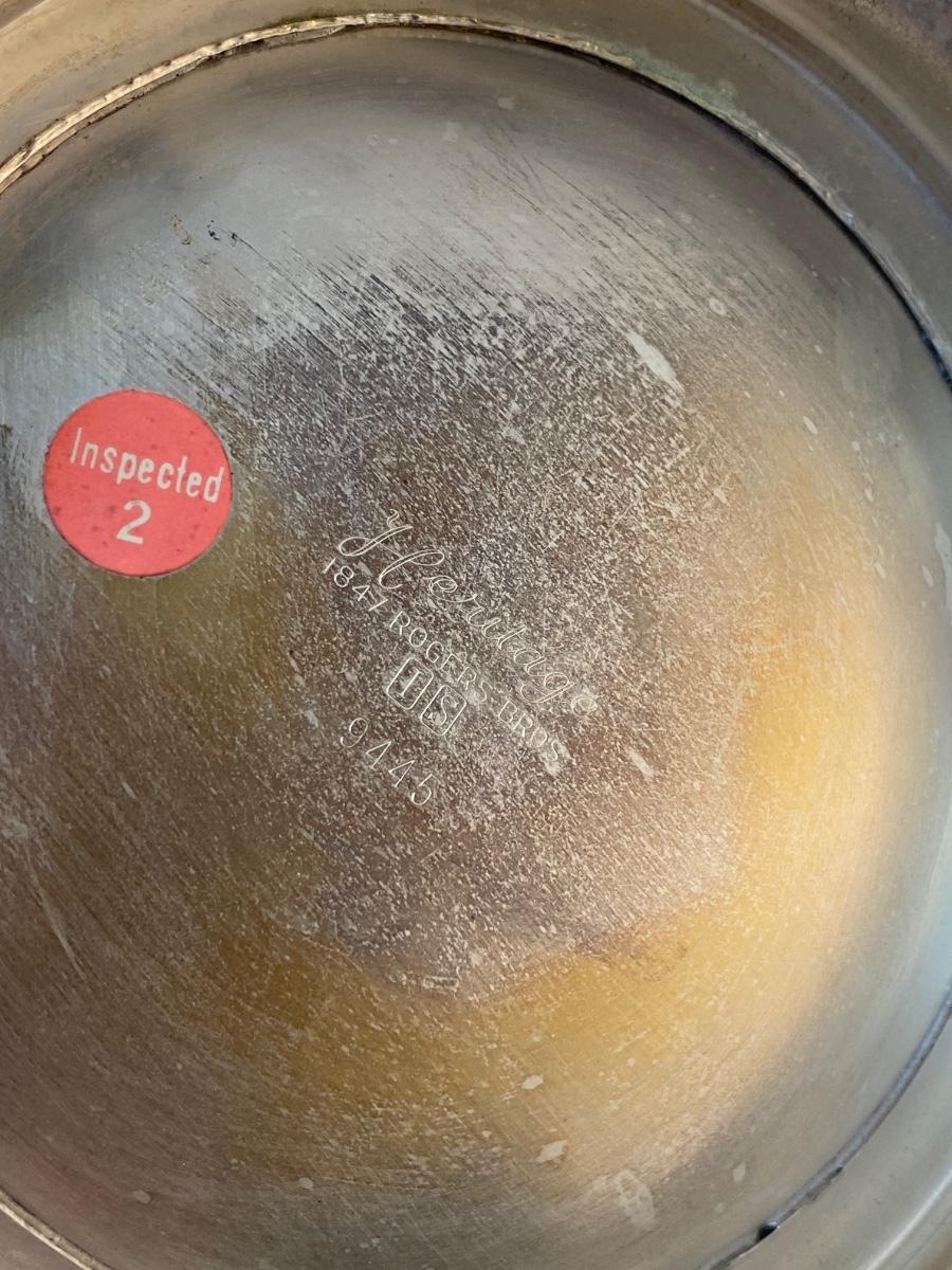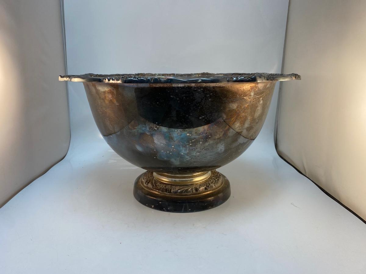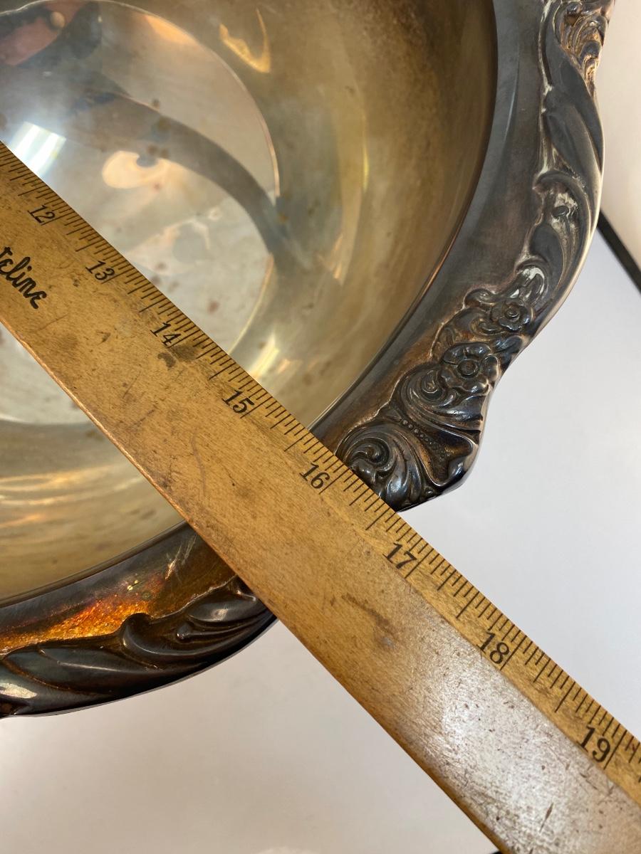 Large Rogers Bros Vintage Silver Plate Punch Serving Bowl Heritage Pattern Floral Edge. Needs to be polished but in otherwise good condition. No dents or dings. Huge, about 17" diameter.