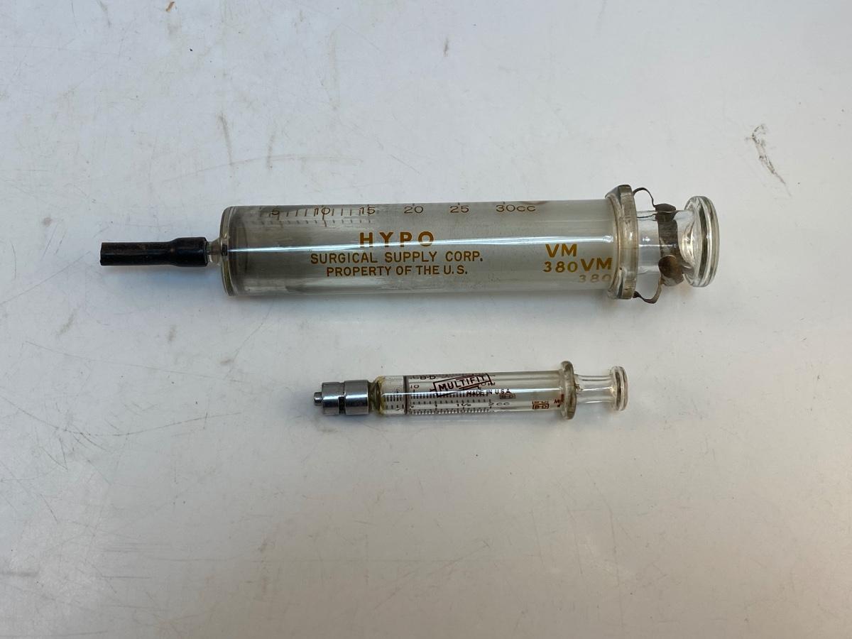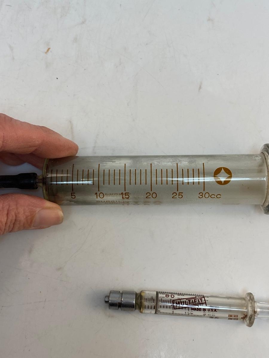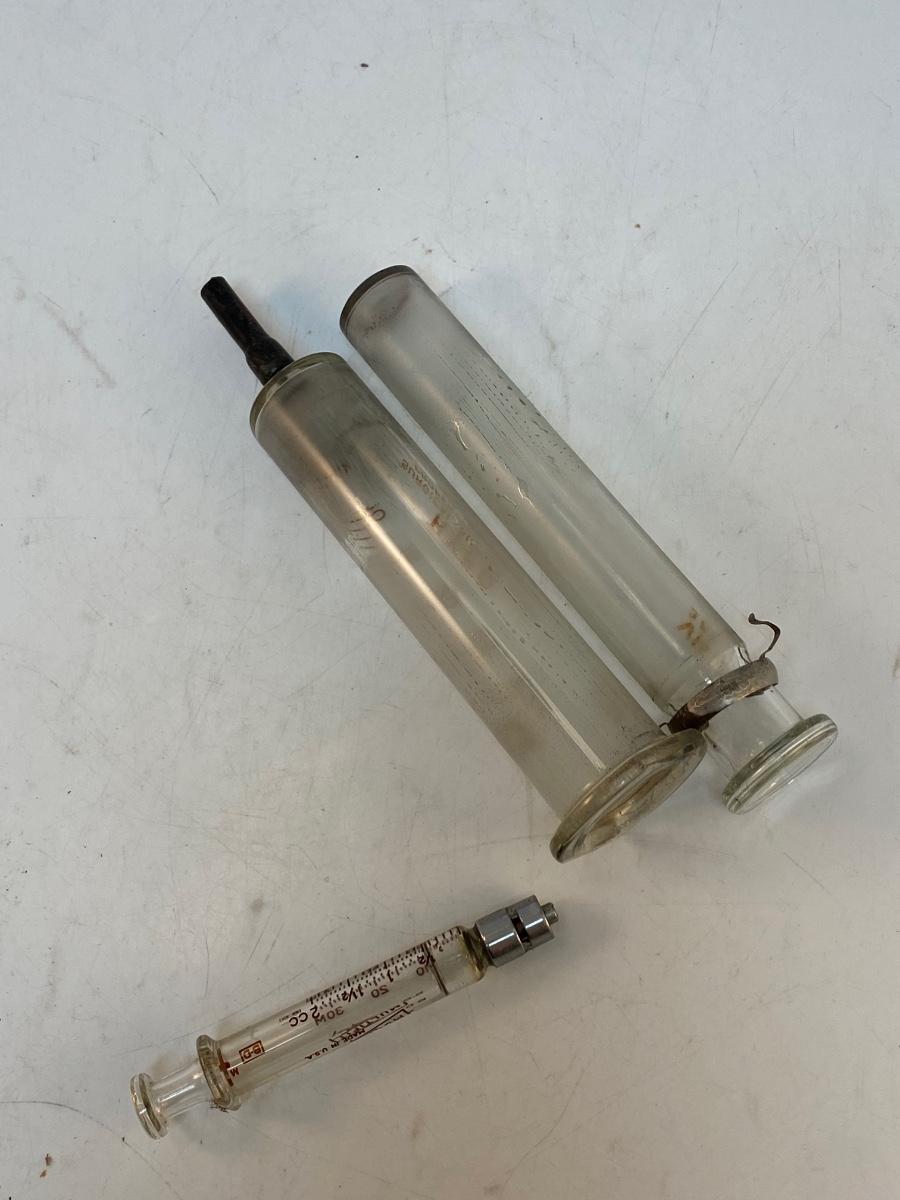 Pair of vintage glass syringes. No needles attached, they were used in garage for automotive or craft purposes. The smaller 2cc syringe has a stuck plunger, can't get it to move. Both are good for display.