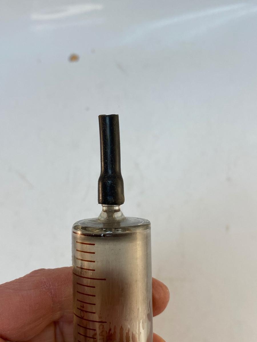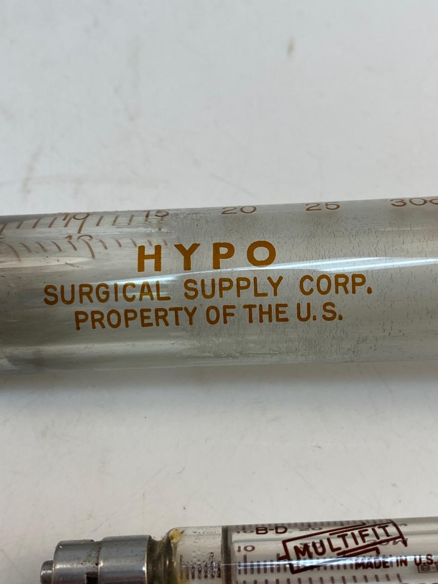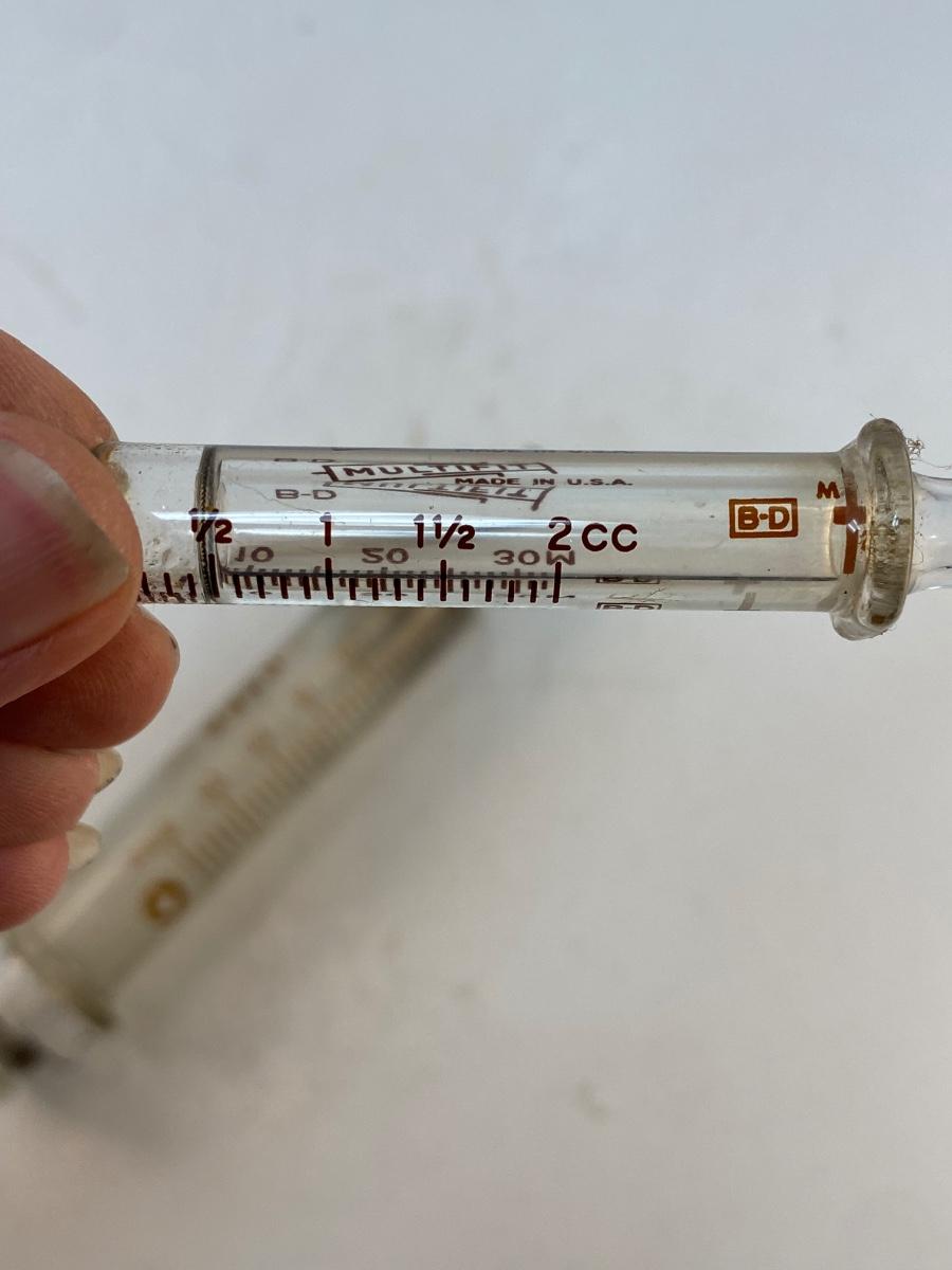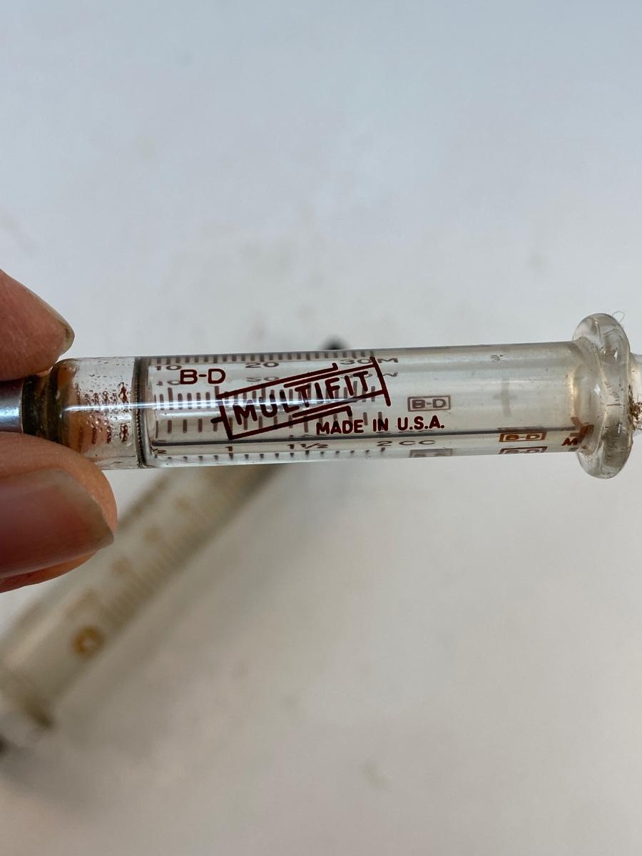 Pair of vintage glass syringes. No needles attached, they were used in garage for automotive or craft purposes. The smaller 2cc syringe has a stuck plunger, can't get it to move. Both are good for display.