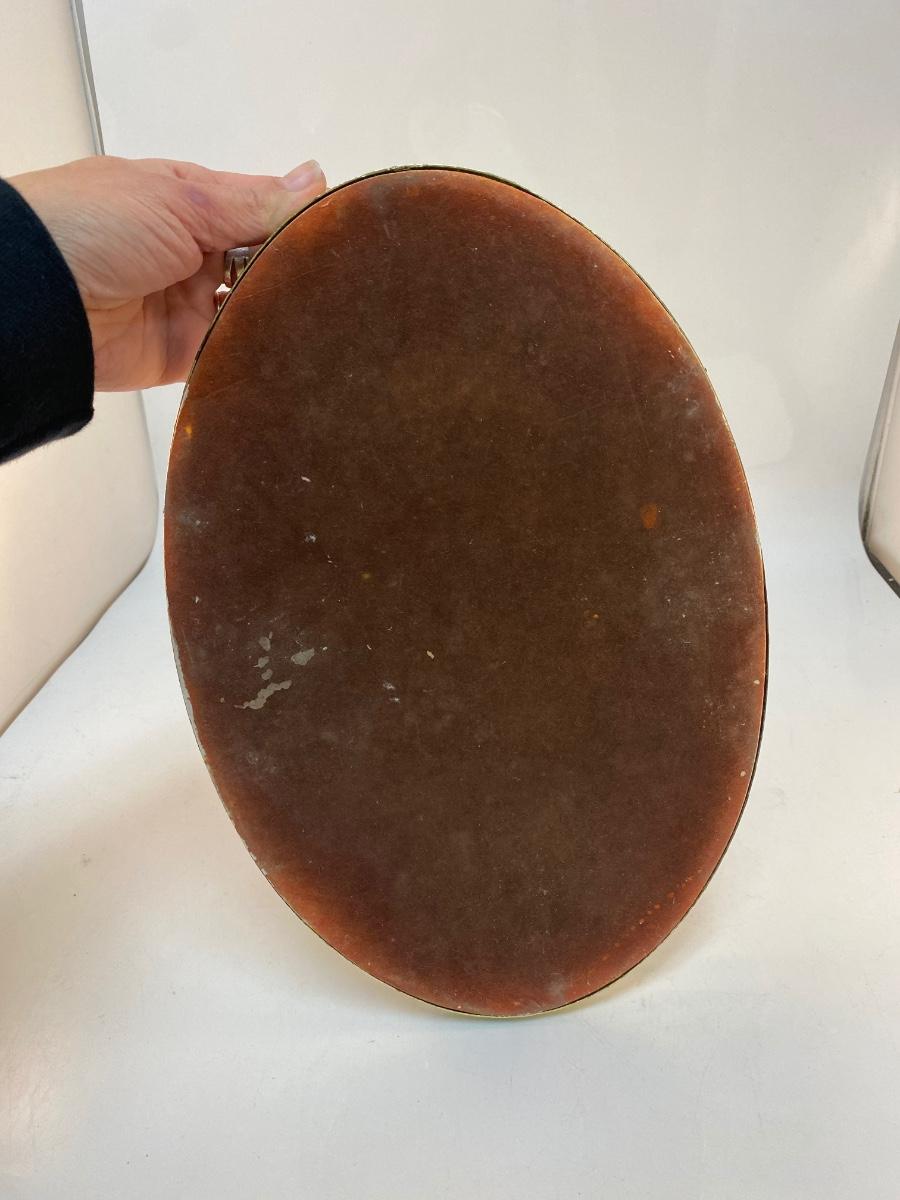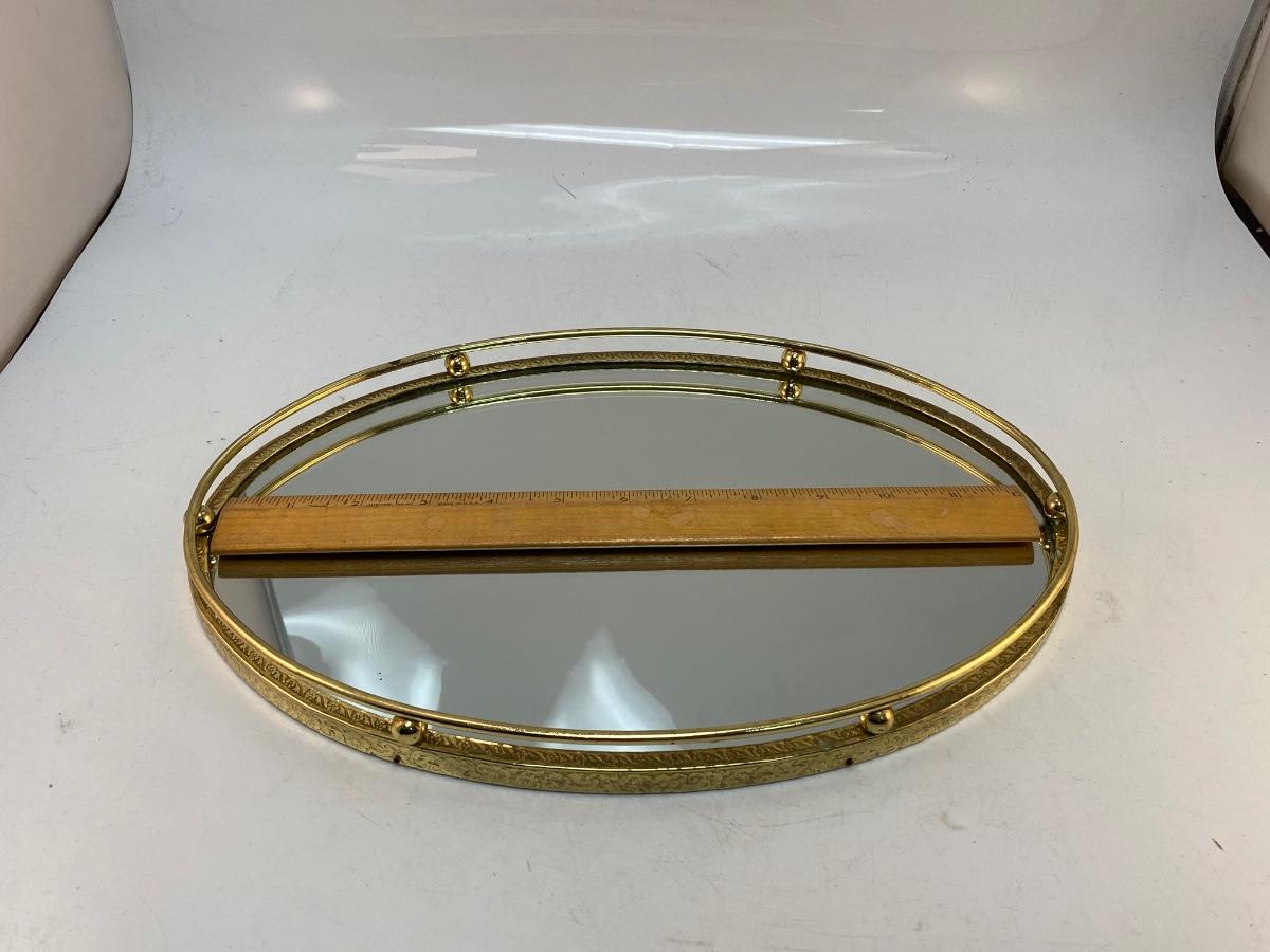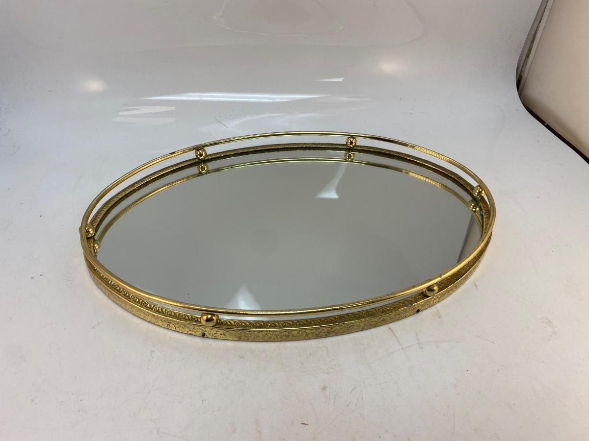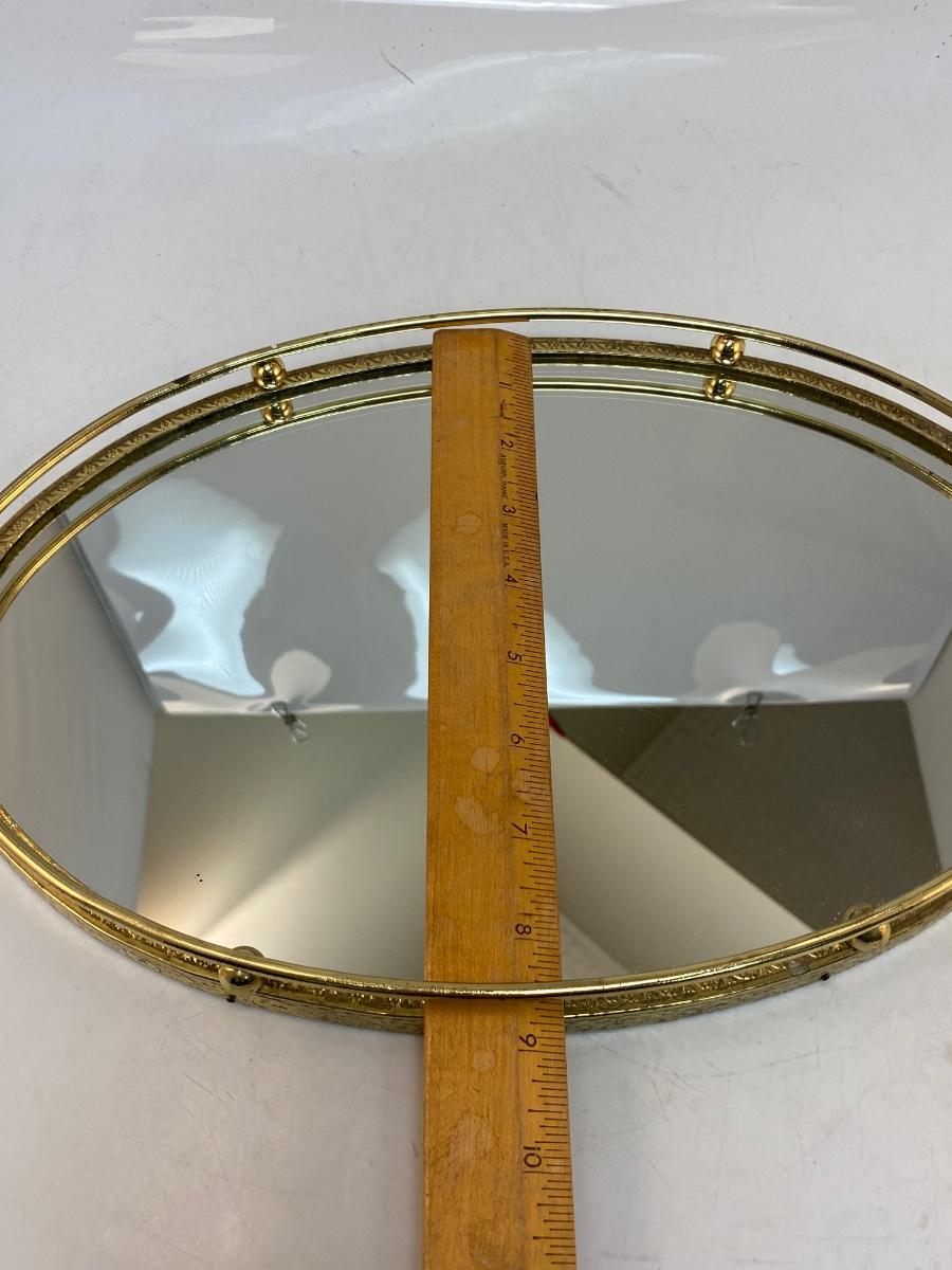 Vintage Oval Gold Tone Metal Vanity Dresser Perfume Trinket Tray. In good condition. About 13"x9" size.