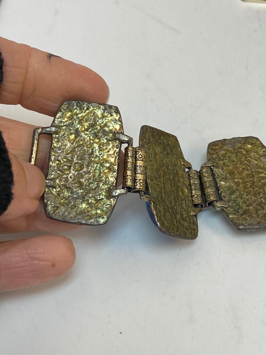 Vintage Chunky Pressed AB Blue Purple Swirl Medallion Bracelet. In good condition. Silver tone metal setting.