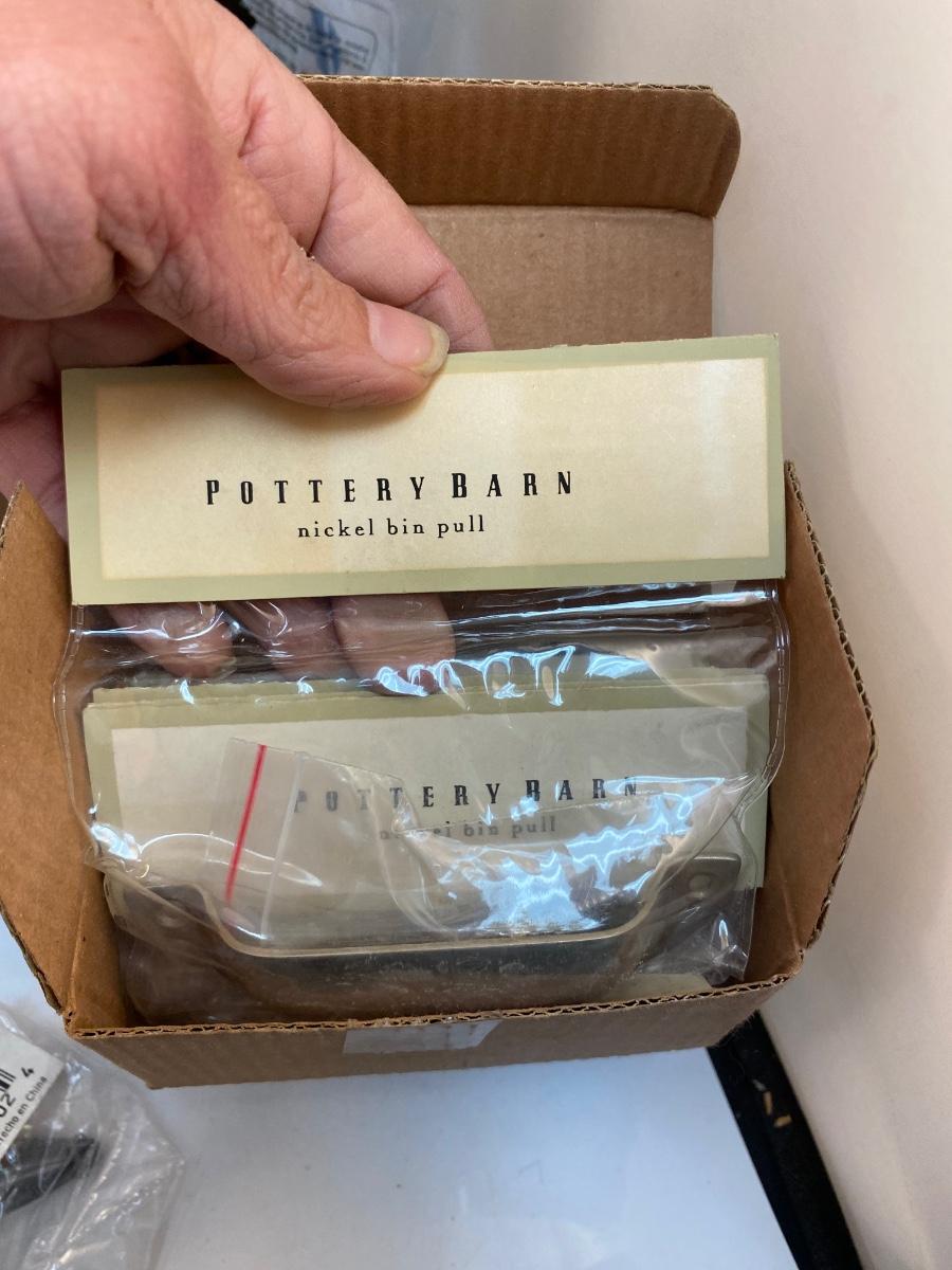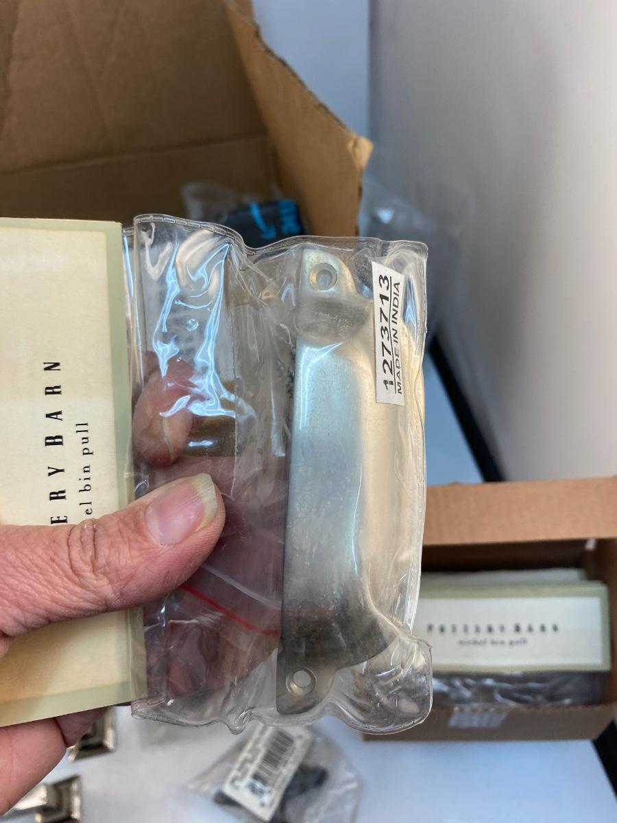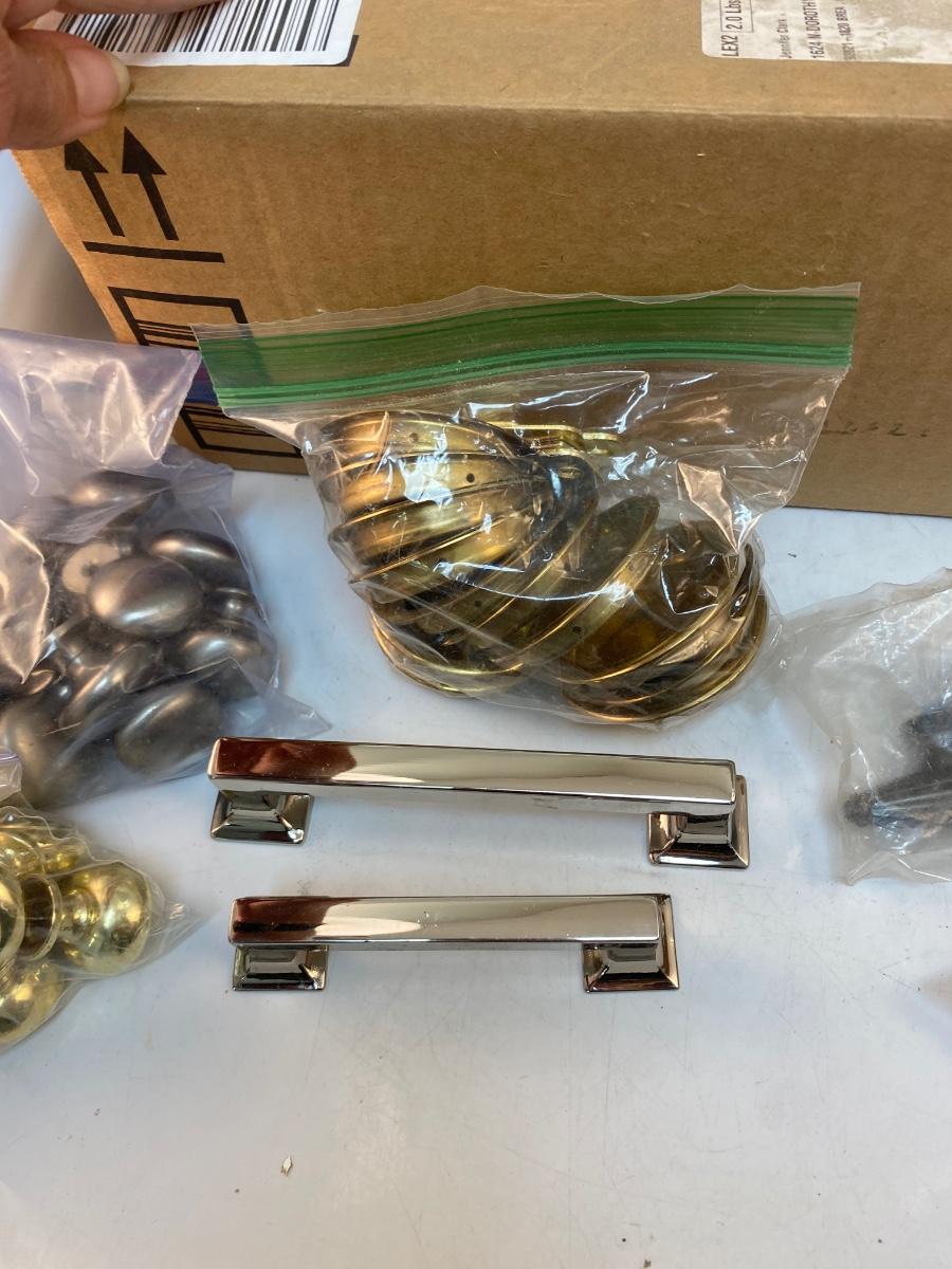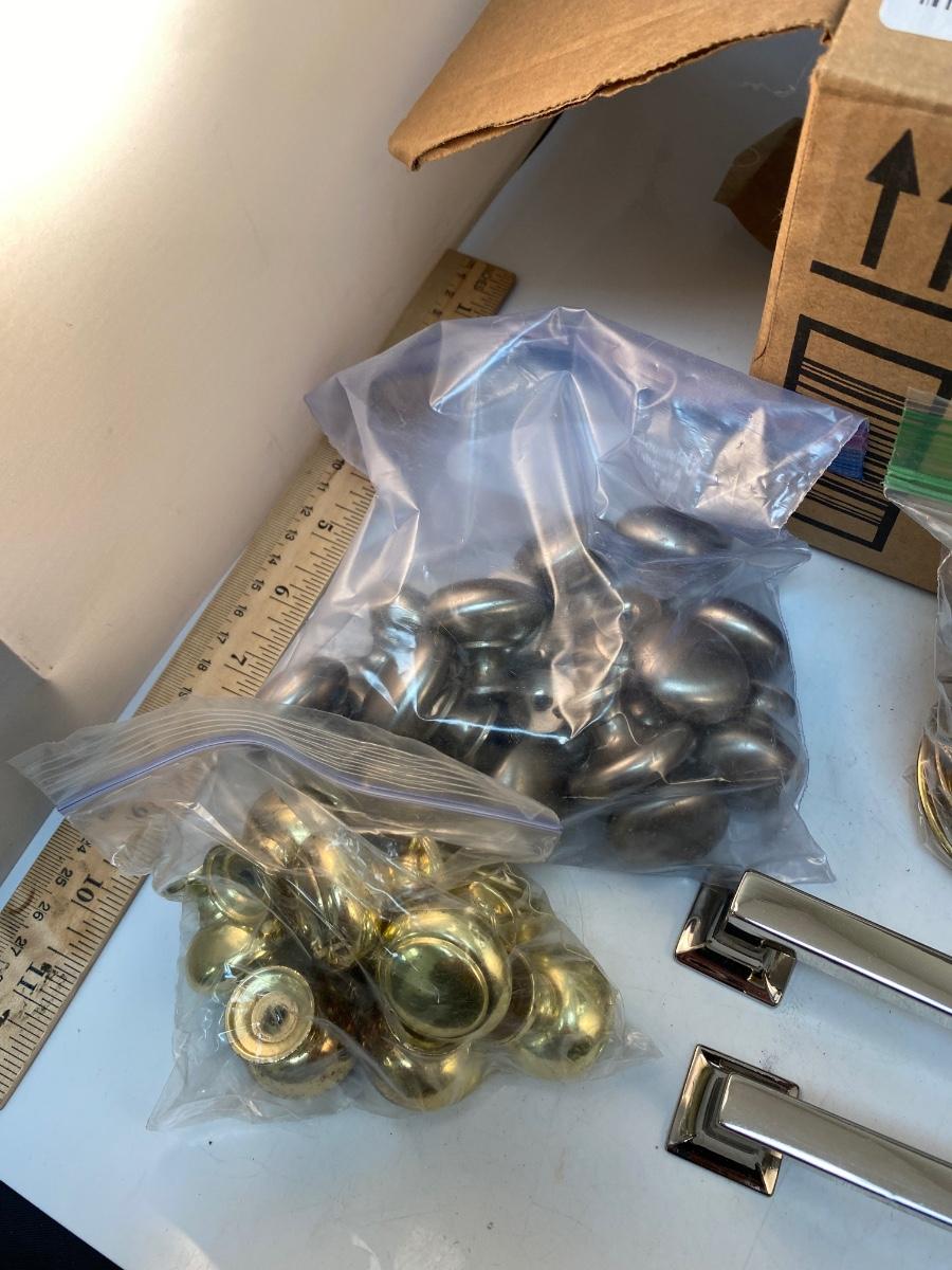 Huge Lot of New Drawer Door Pulls Shiny Chrome & Miscellaneous Knobs. Majority of the drawer pulls are chrome handles about 6" size. There is probably 2 dozen or more. There is some single knobs and other drawer pulls from Pottery Barn. Some knobs are previously used. Heavy box.