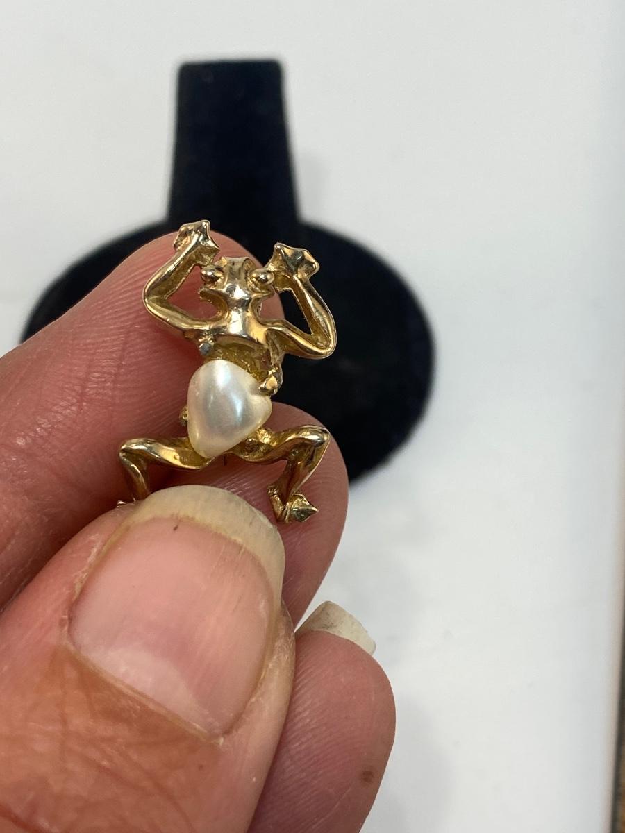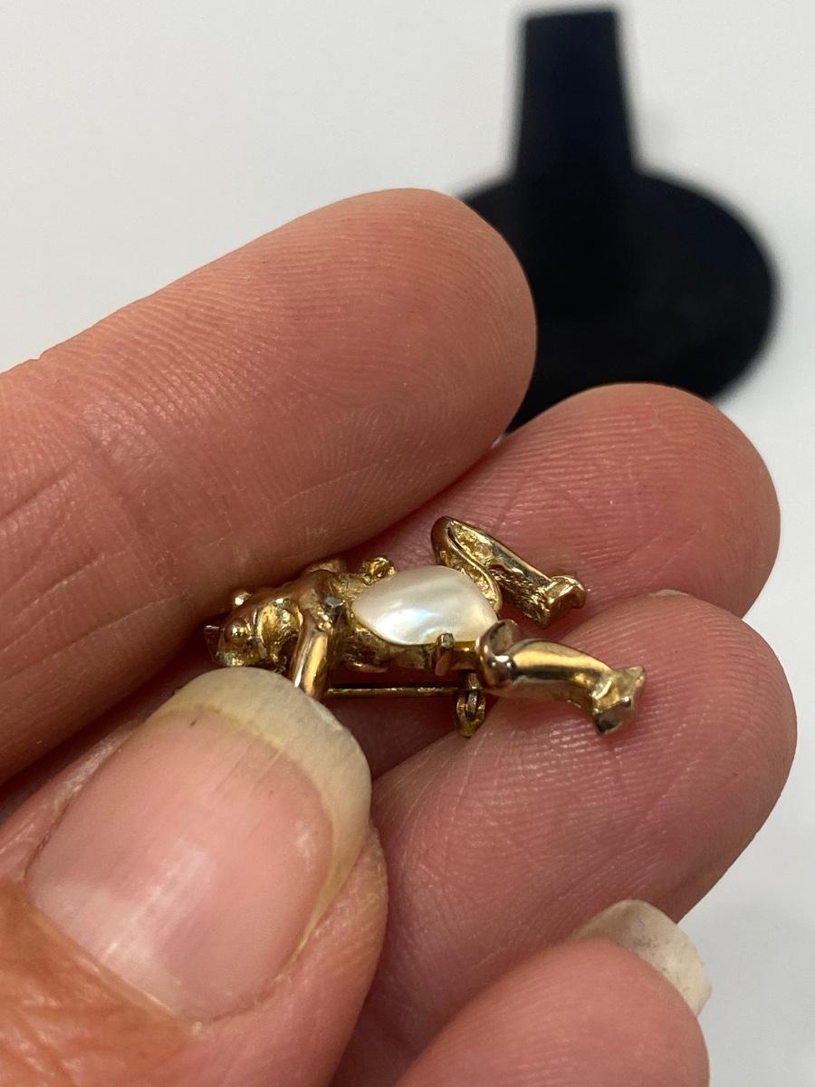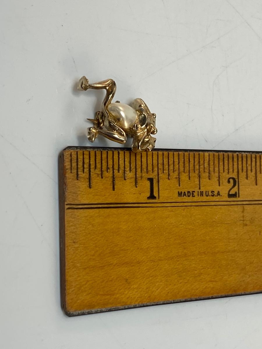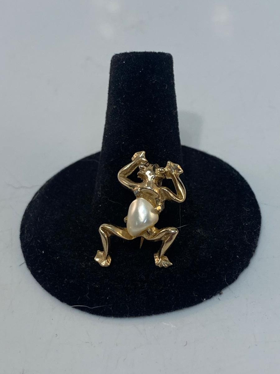 Small Gold Tone with Freshwater Pearl Frog Toad Lapel Pin. Unbranded. In good condition. About 1" size.