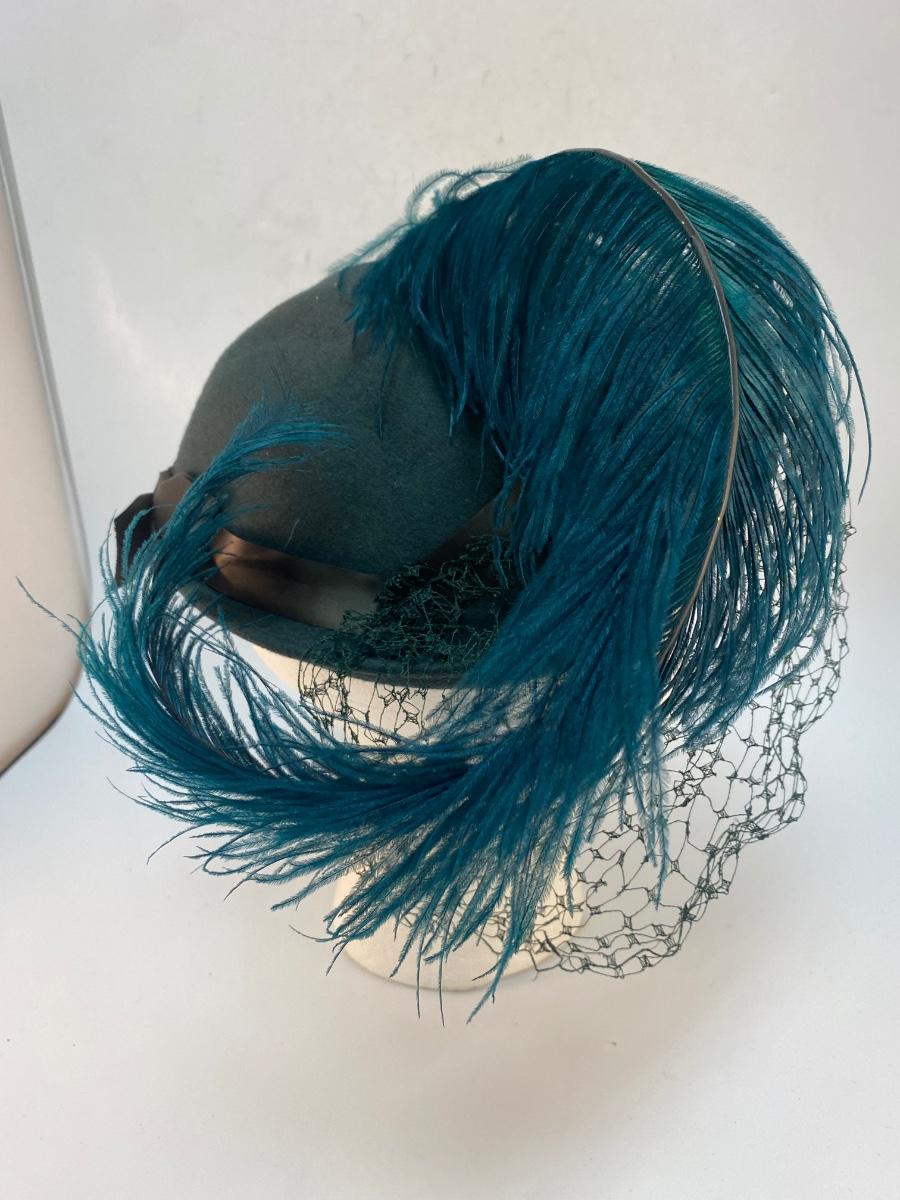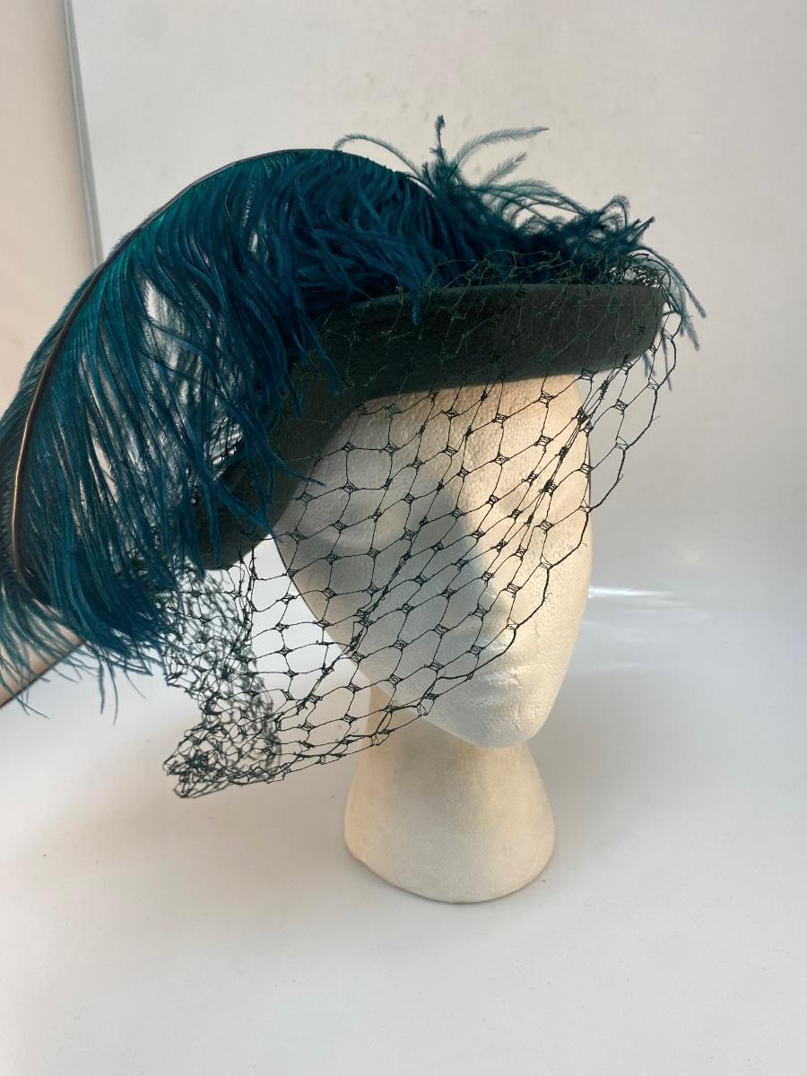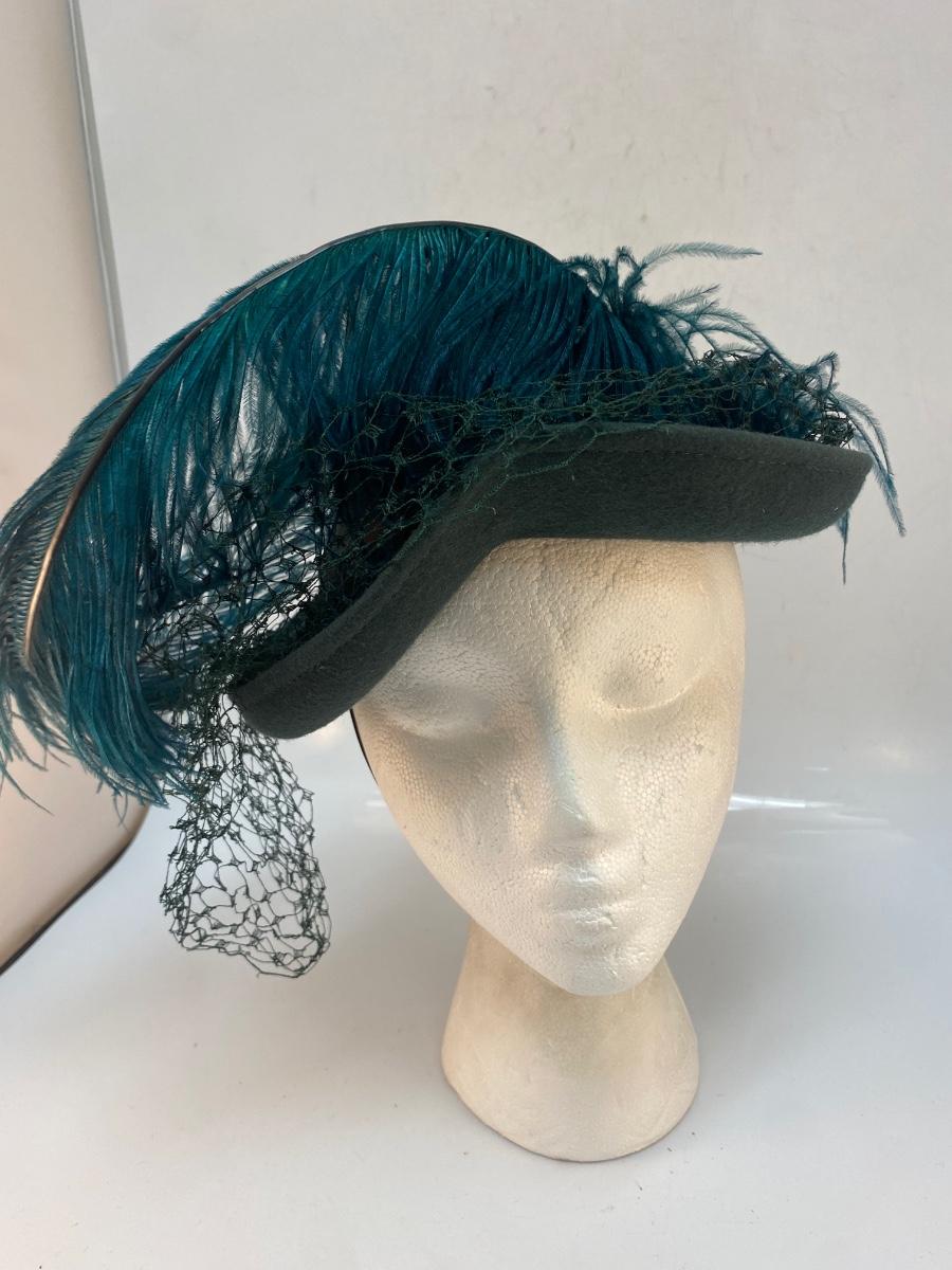 Vintage Dark Teal Green Netted with Ostrich Feather Wool Fascinator Hat