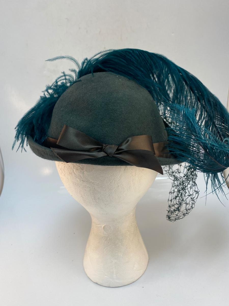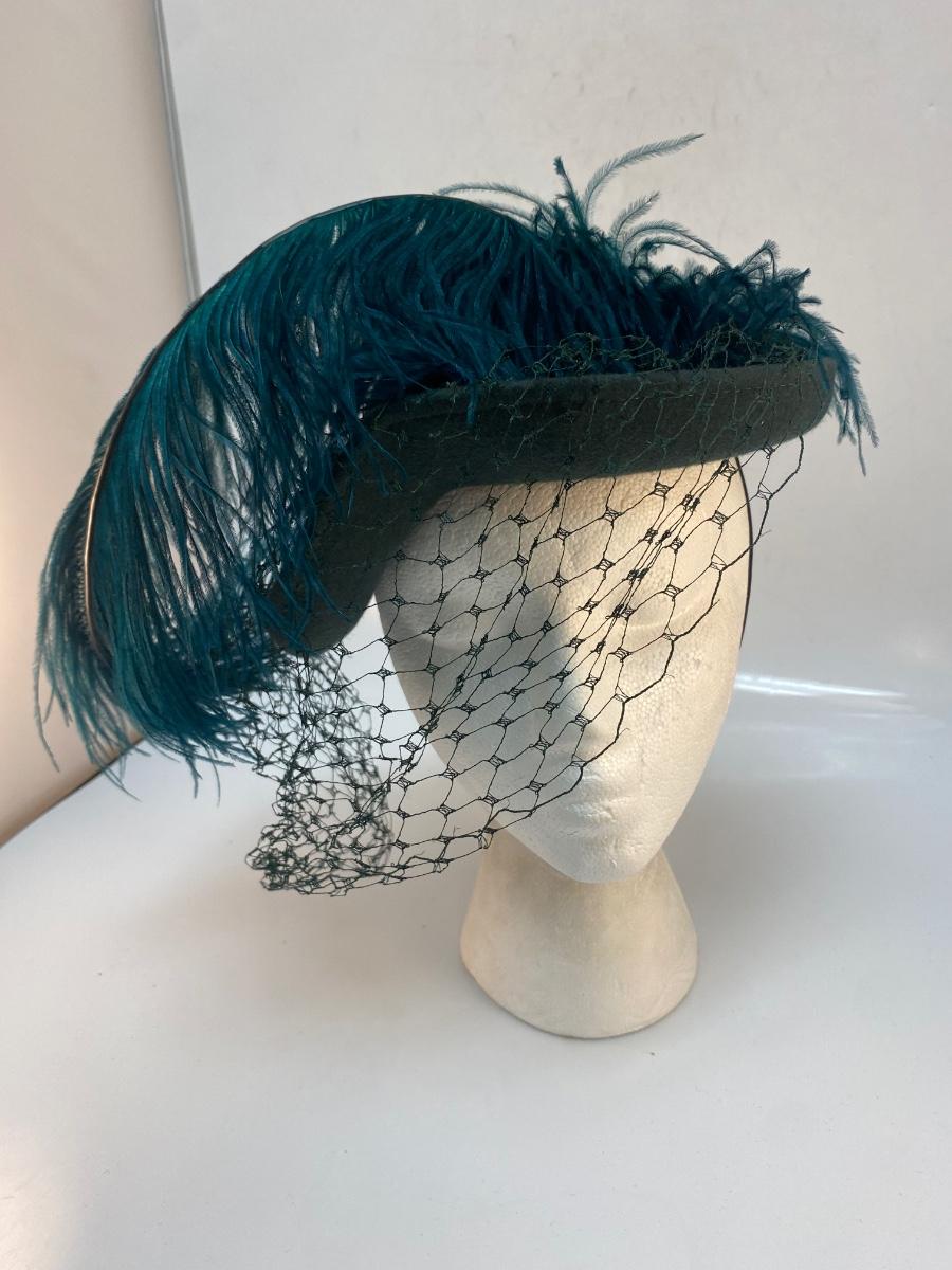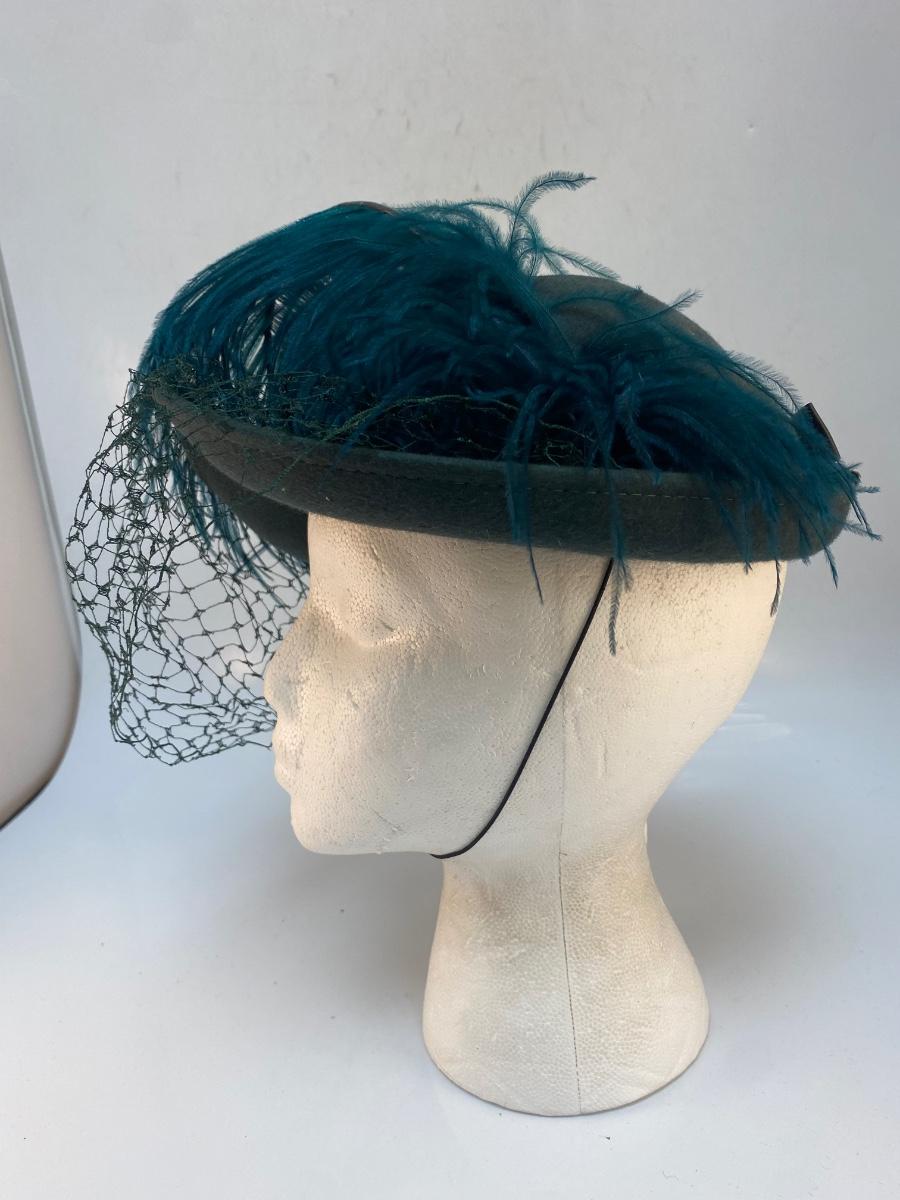 Vintage Dark Teal Green Netted with Ostrich Feather Wool Fascinator Hat