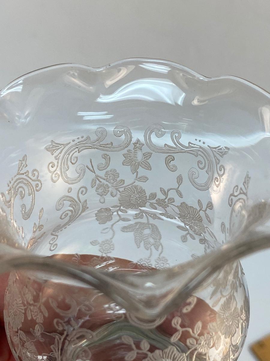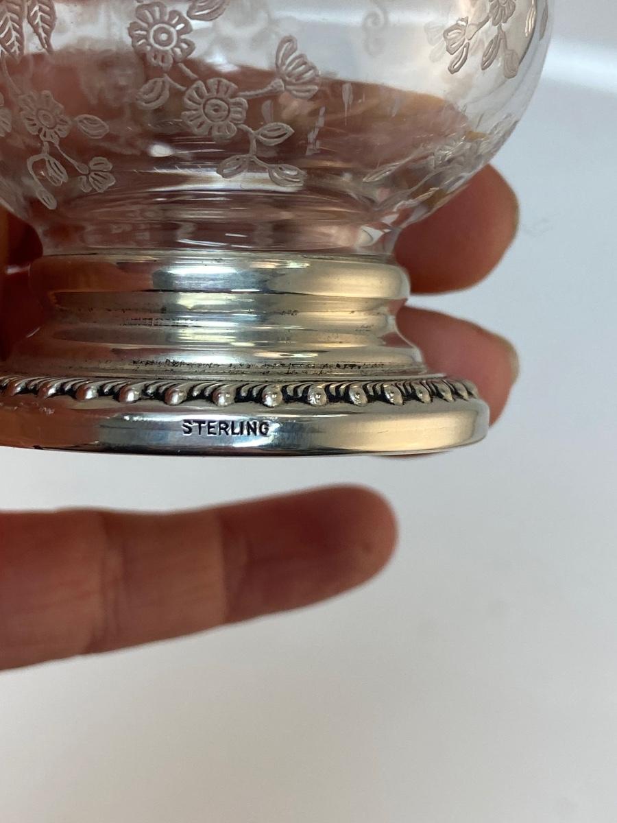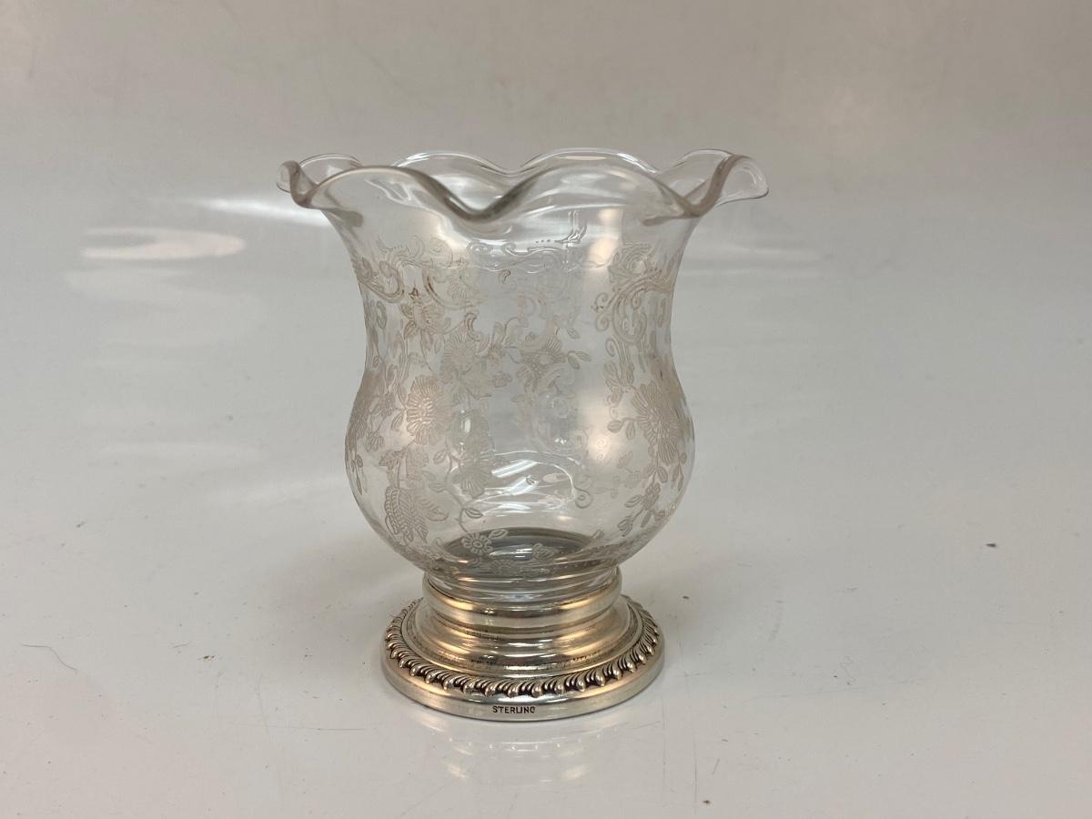 Vintage Chantilly by Cambridge Sterling Silver Base Tulip Candle Holder Cigarette Urn. Beautiful floral etched pattern. In good condition, no chips or cracks. Stamped sterling on the side of base. About 3" size.