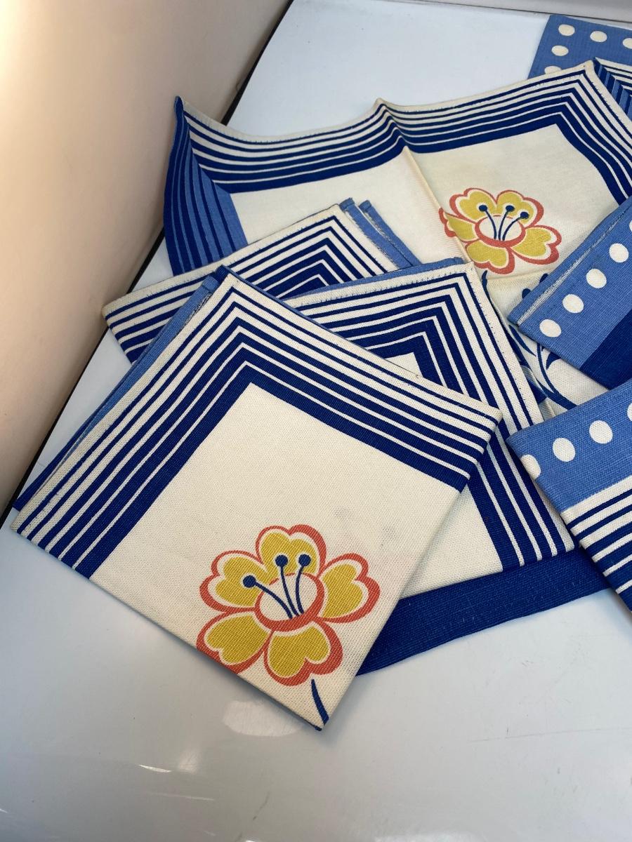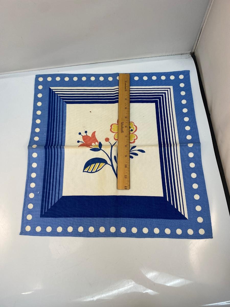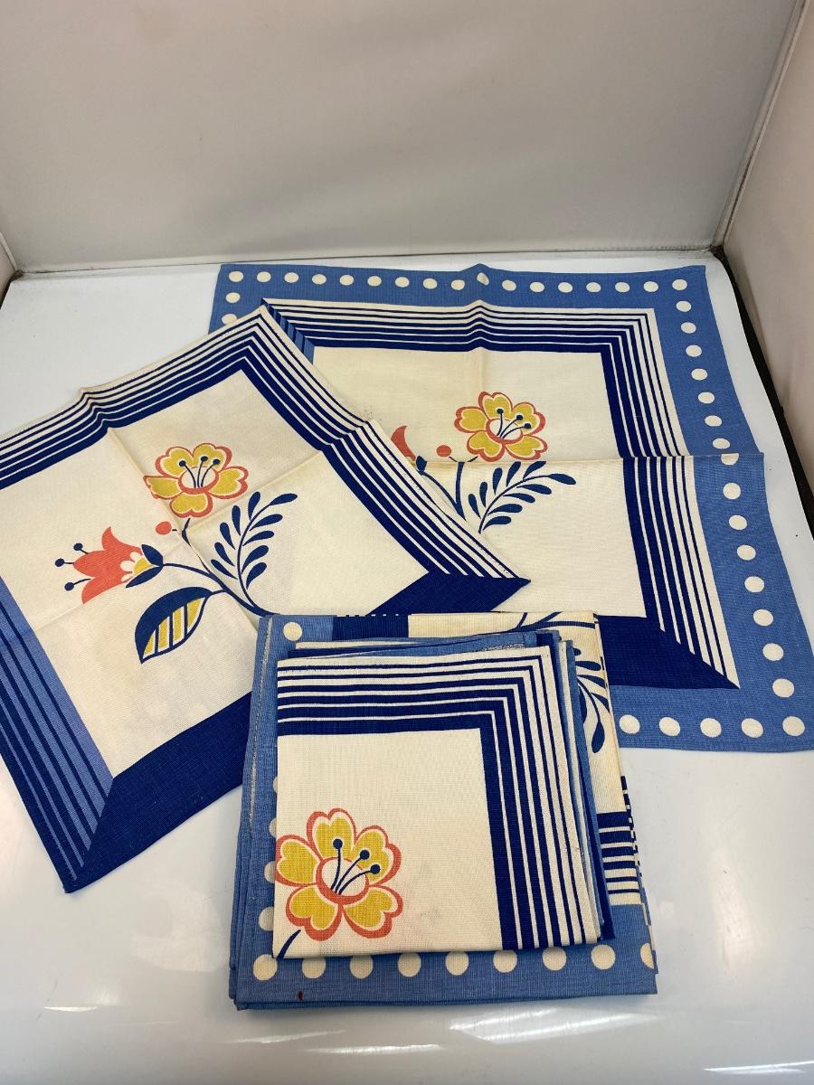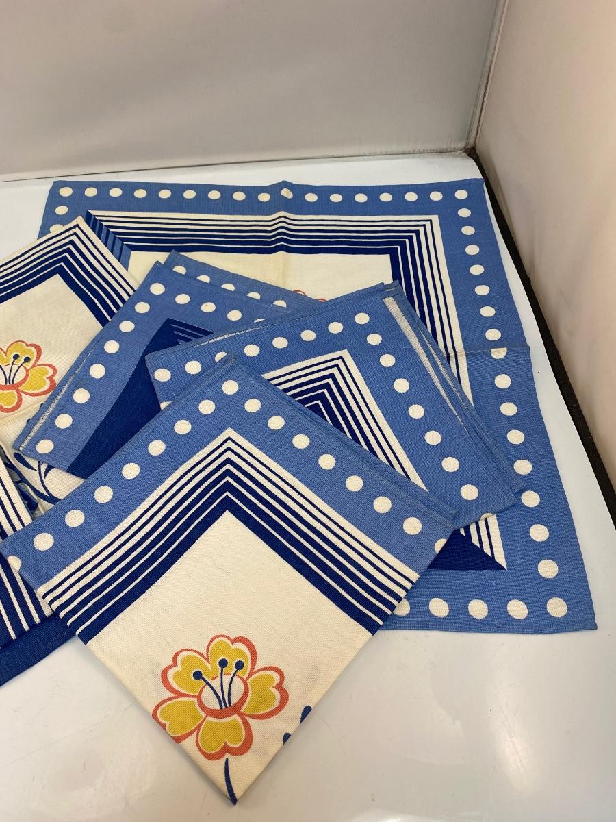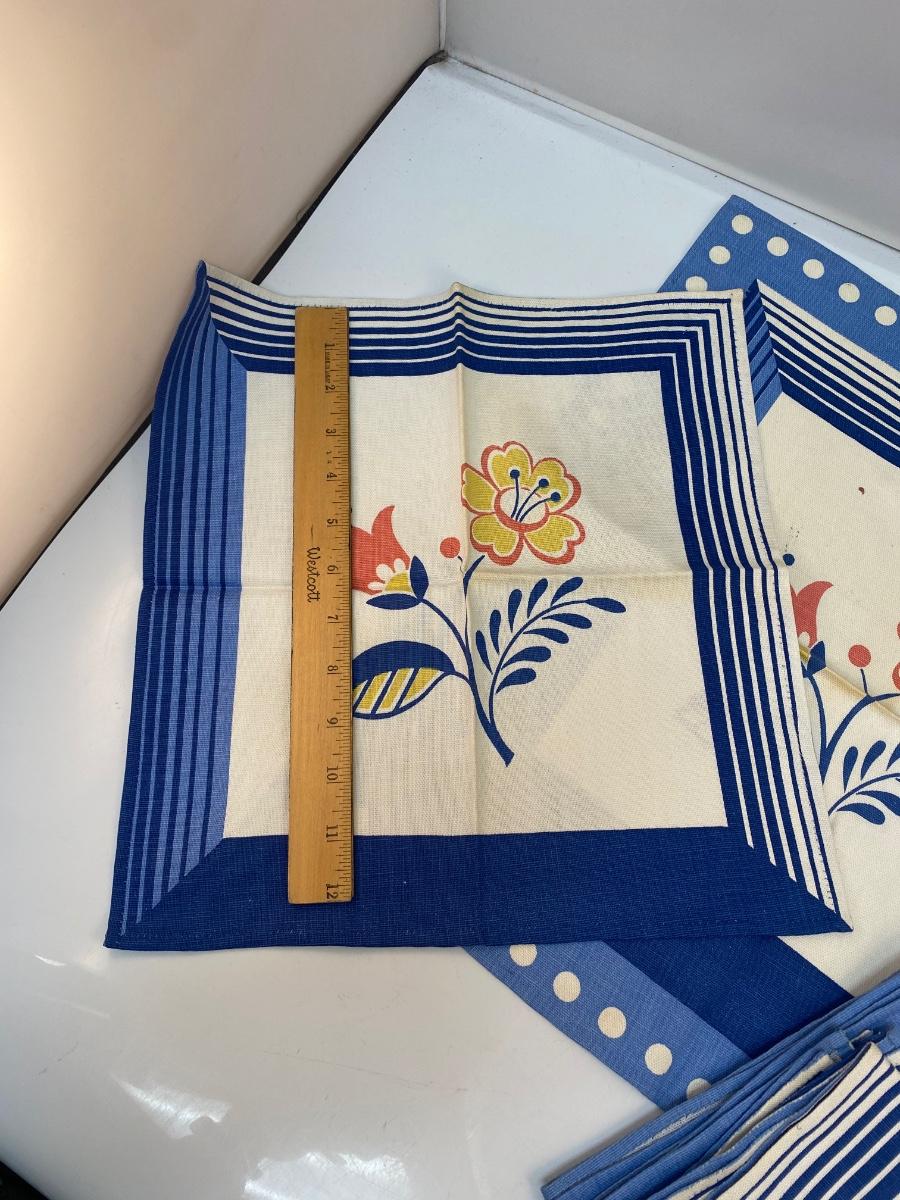 Vintage Blue Bordered Flower Pattern Cloth Dinner Napkin Placemats. In good vintage condition. Light discoloration. Two sizes, the smaller are missing the polka dot edge that the larger have. Set of 8, 4 of each size.