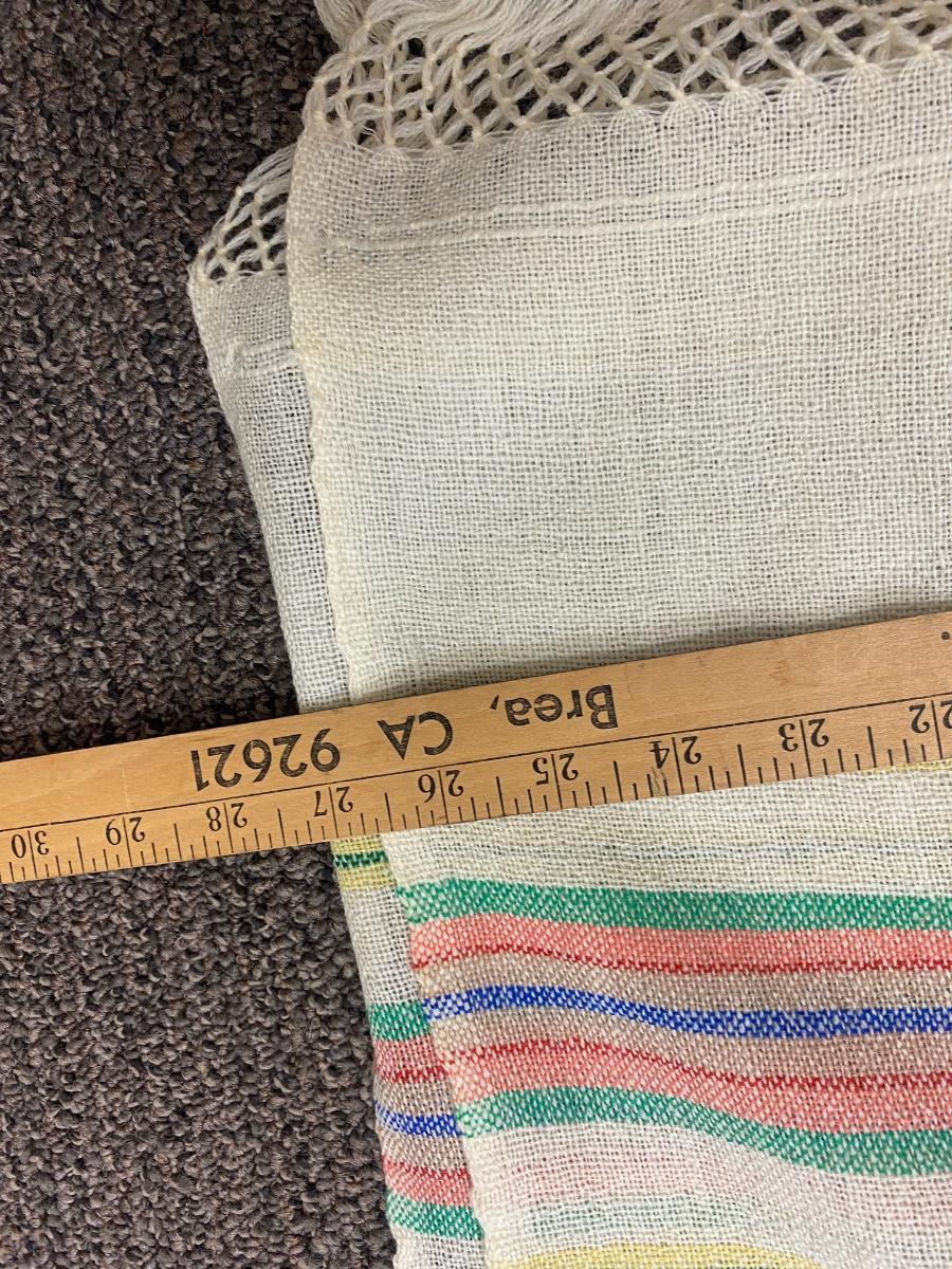 Vintage Lightweight Fringed Edge Striped Table Runner. In vintage condition. No major spots or stains. There is some small moth holes. About 6' length without the fringe.