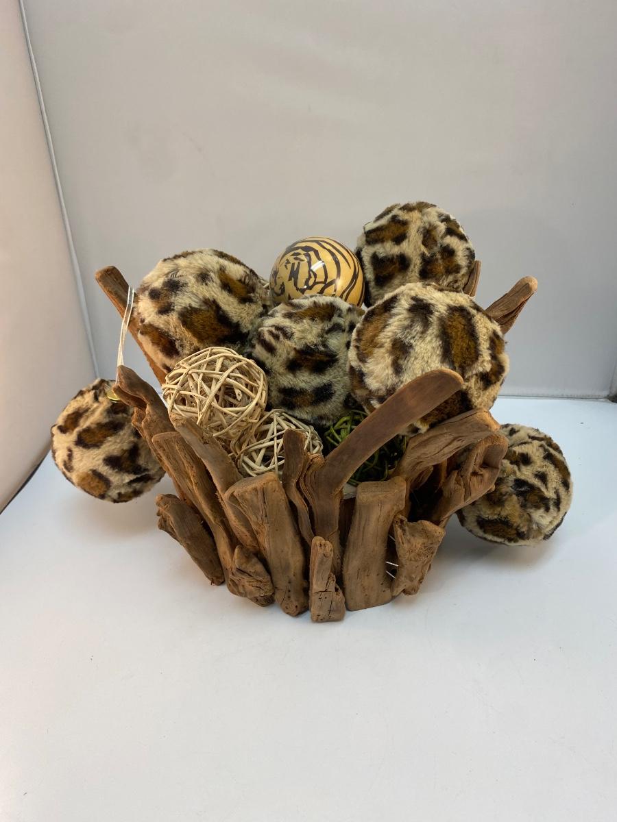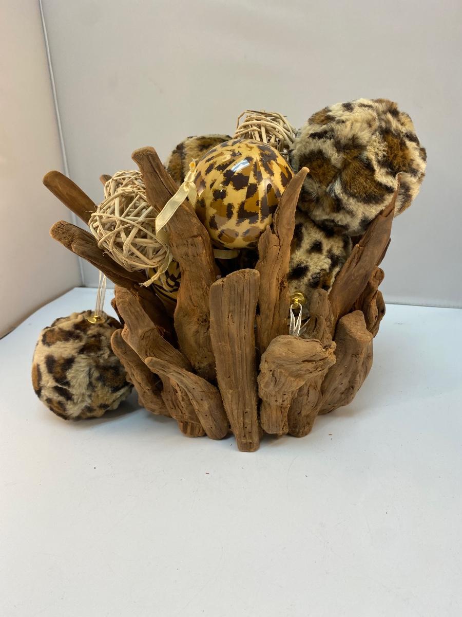 Driftwood Display Basket Filled with Natural Reed and Leopard Print Ball Ornaments