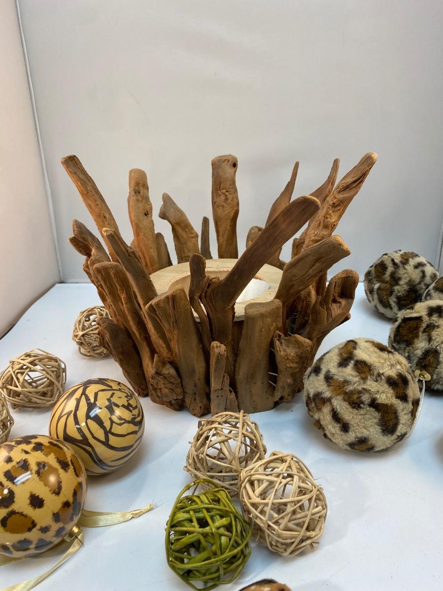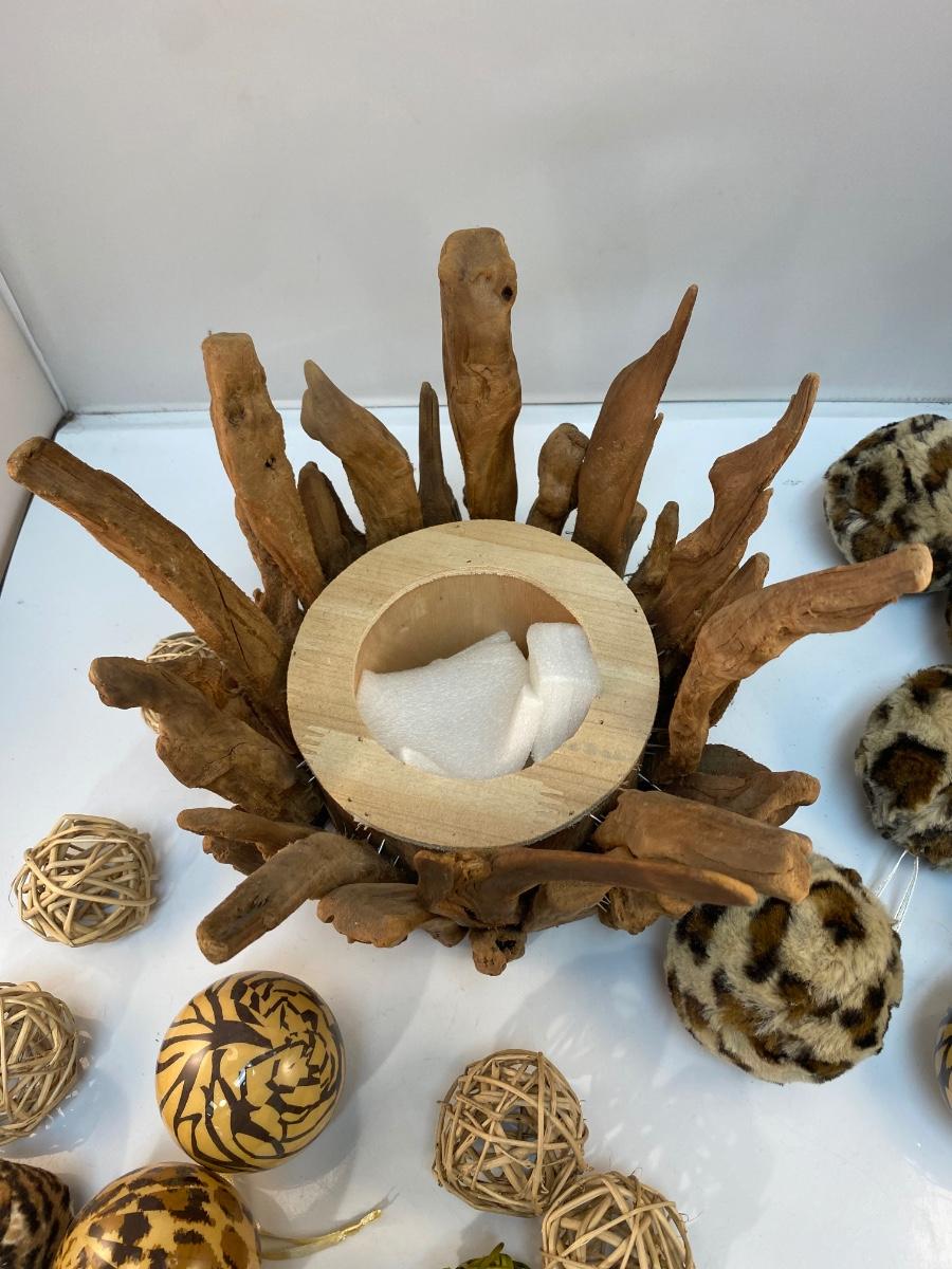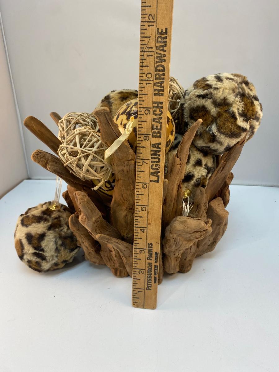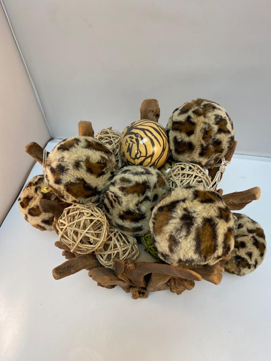 Driftwood Display Basket Filled with Natural Reed and Leopard Print Ball Ornaments. Good condition. Great for separating into different decor craft ideas.