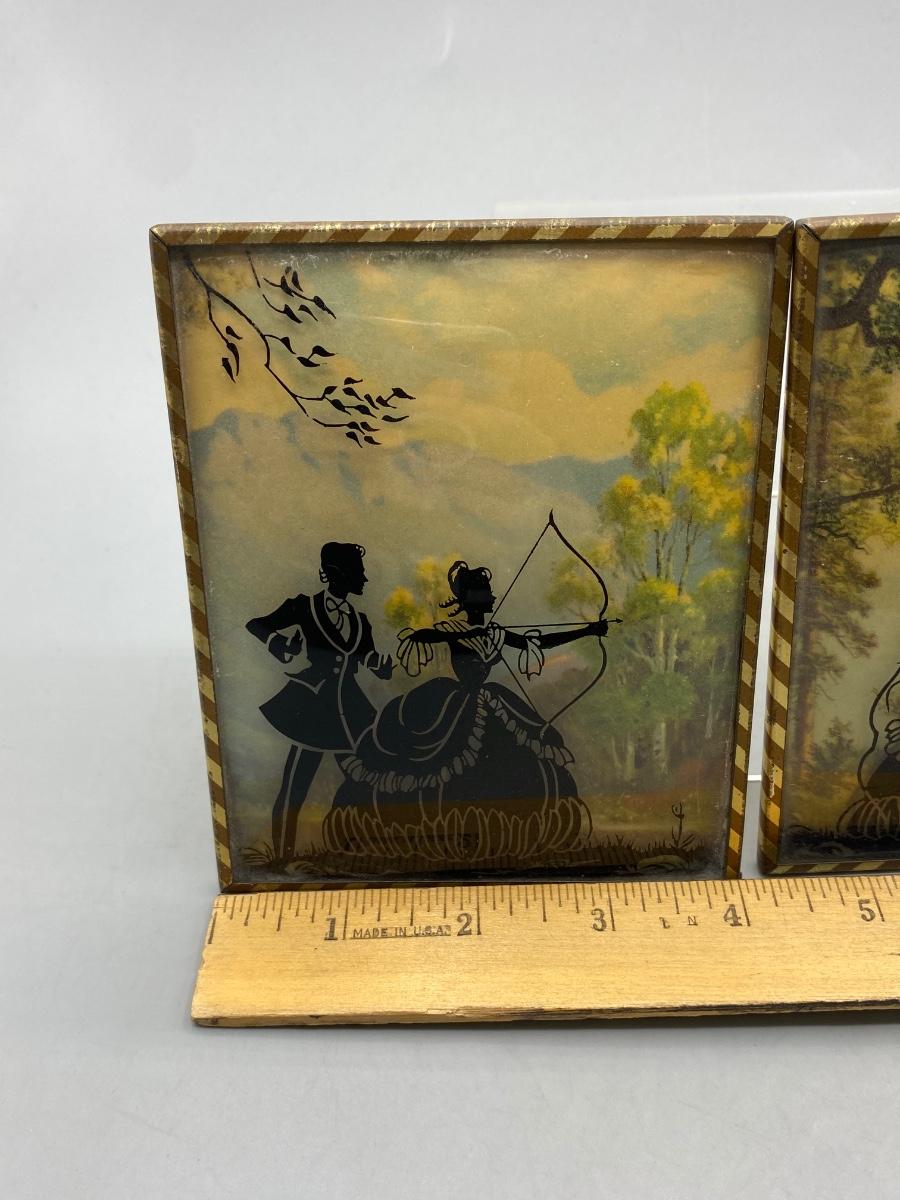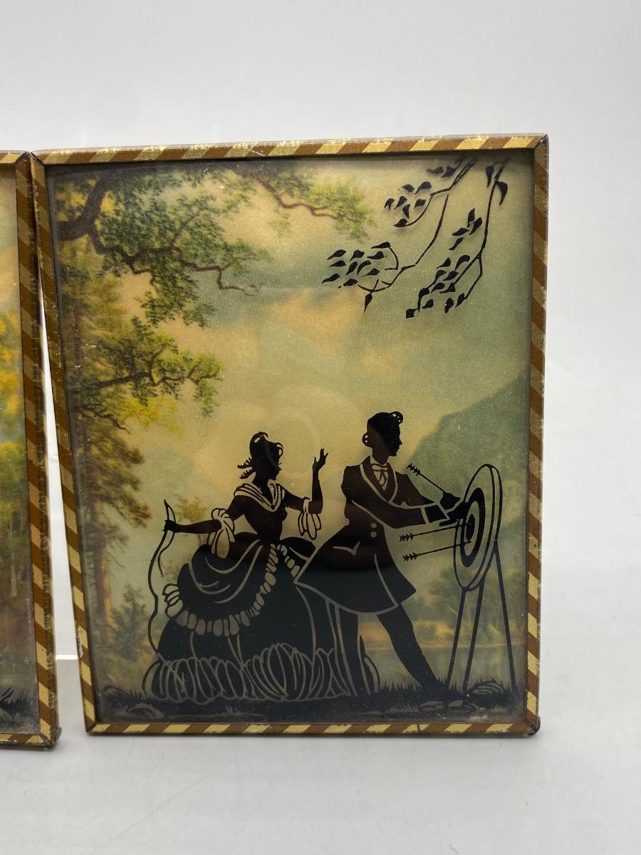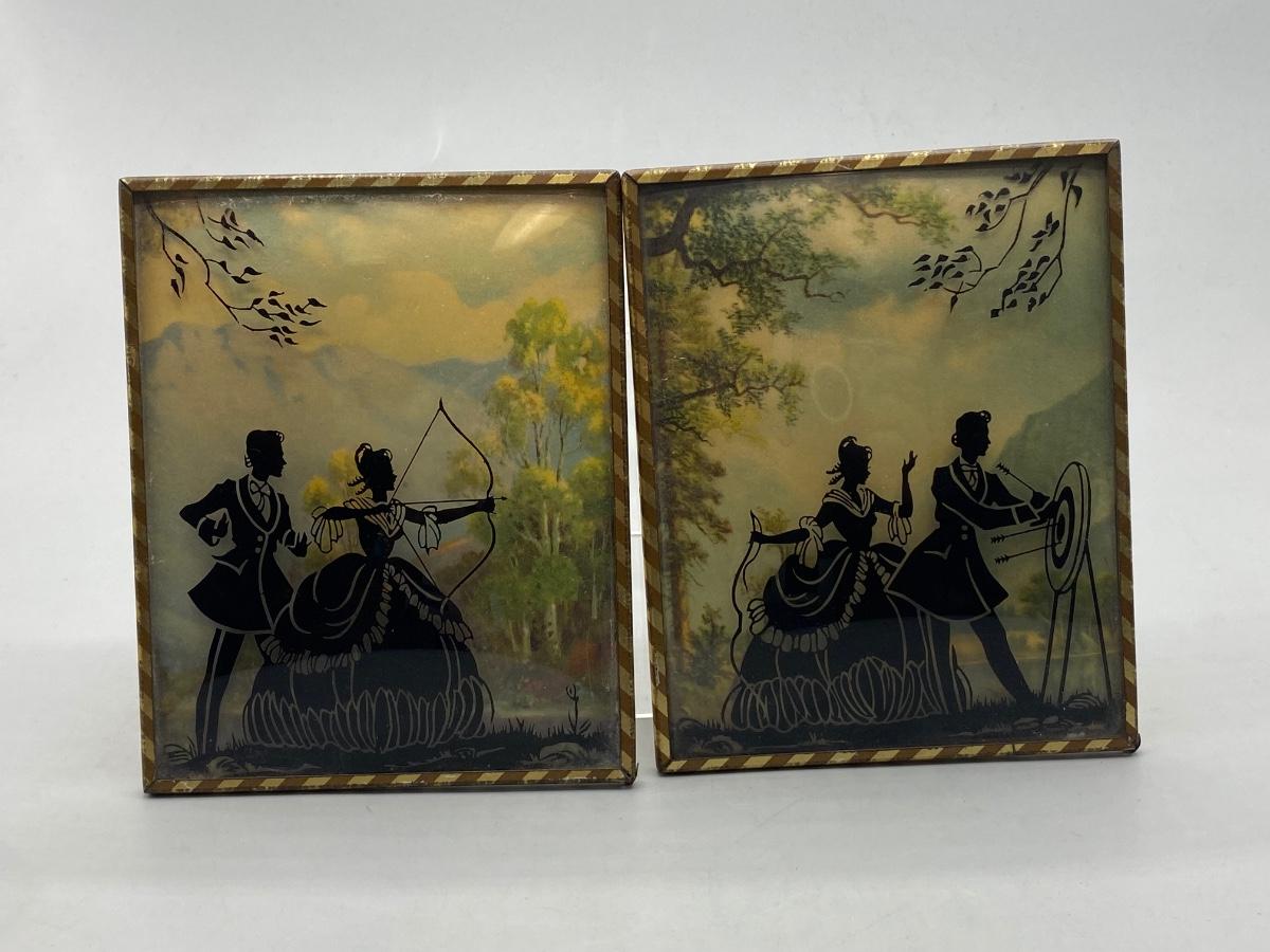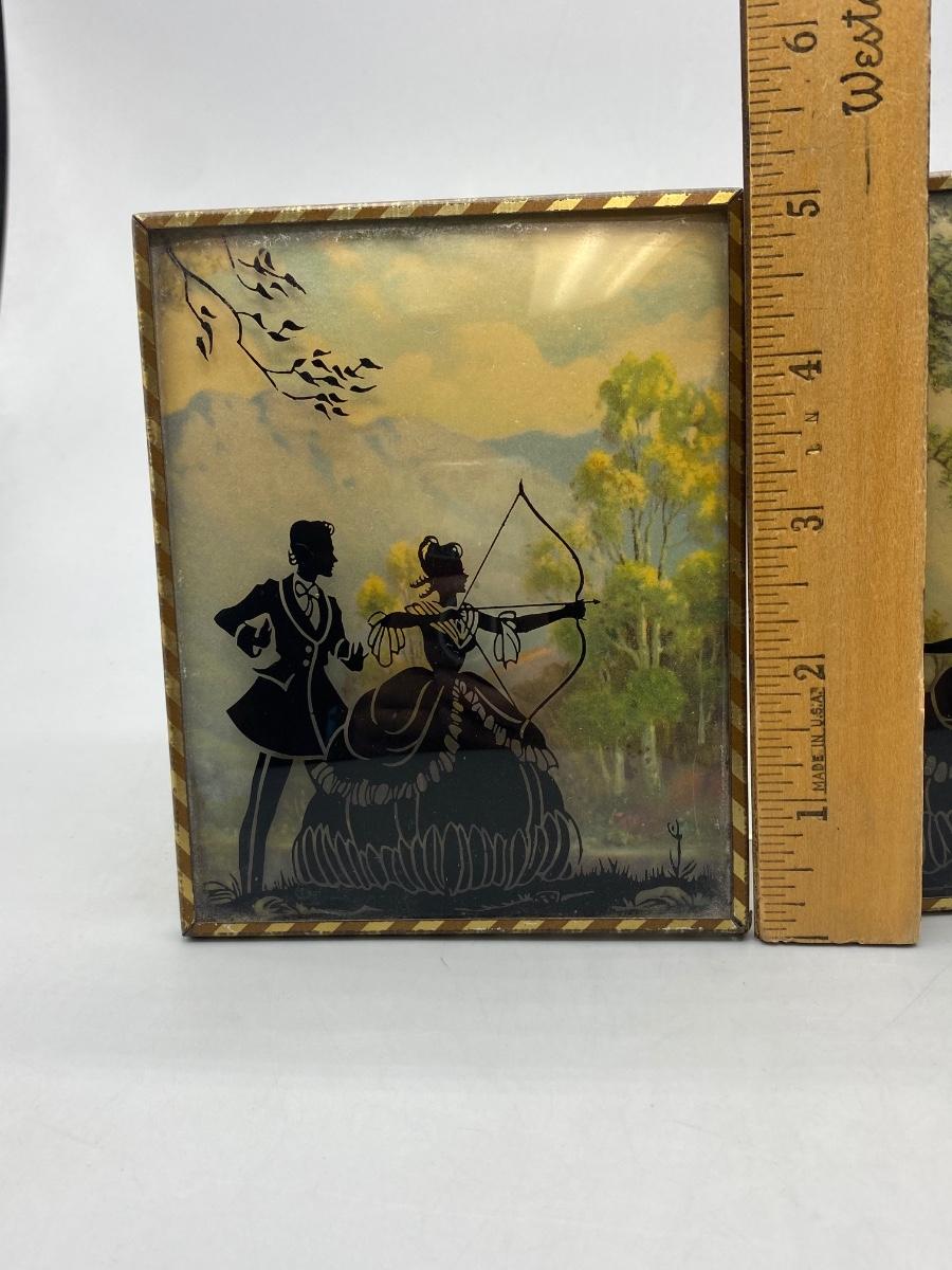 Pair of Antique Bubble Glass Reverse Painted Silhouette Victorian Romantic Couple Archery Hanging Art. In good condition. About 4"x5" size.