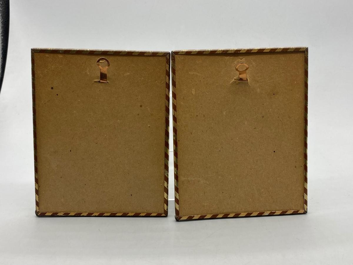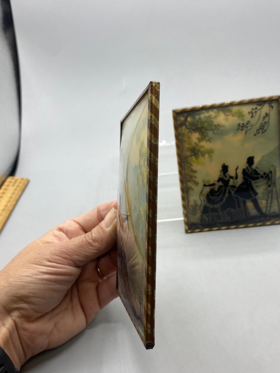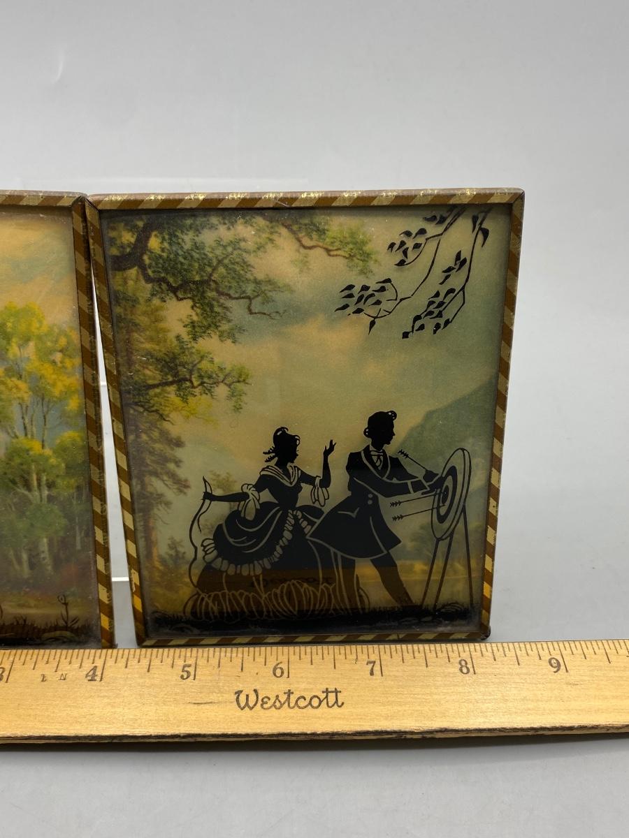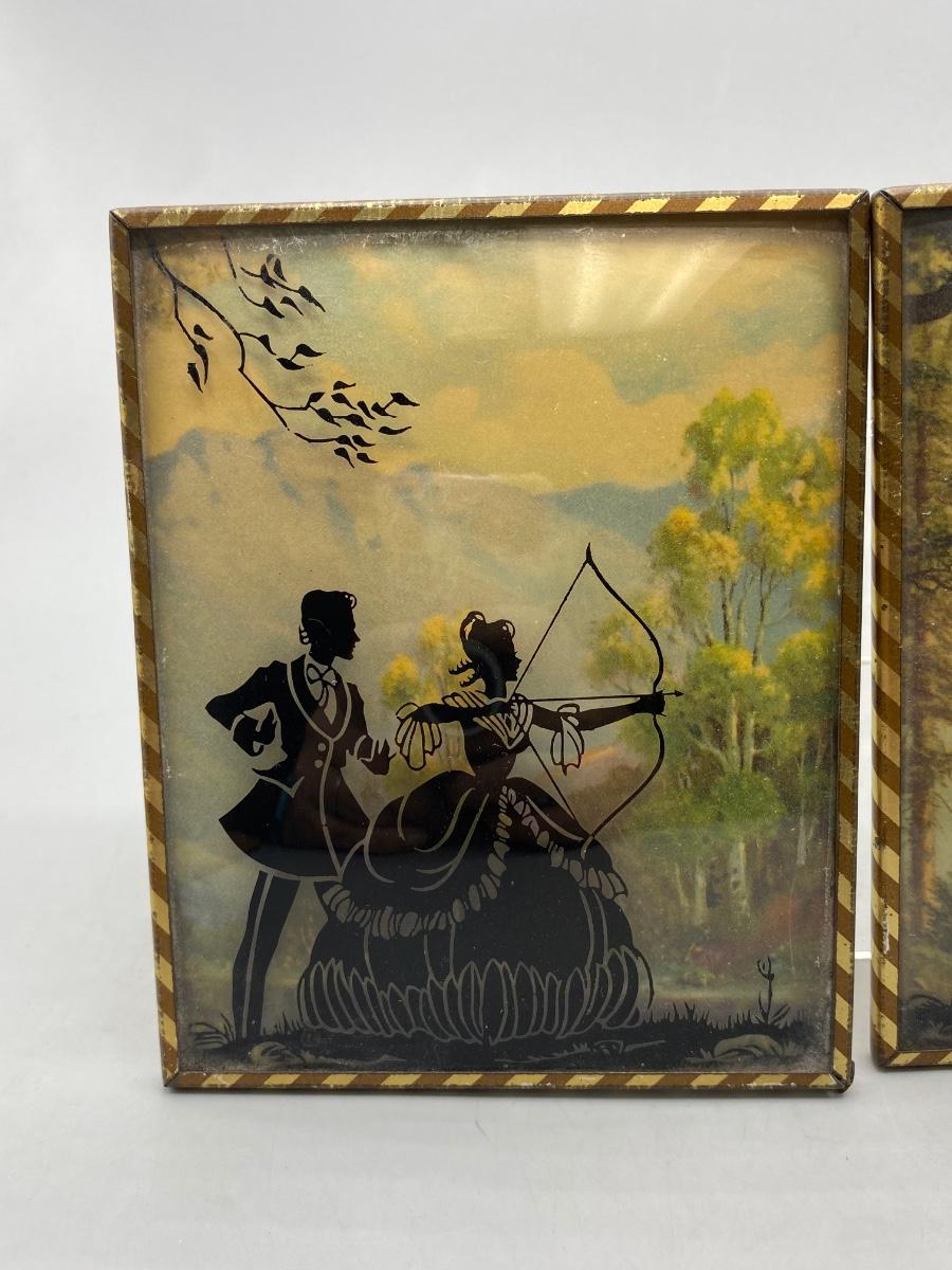 Pair of Antique Bubble Glass Reverse Painted Silhouette Victorian Romantic Couple Archery Hanging Art. In good condition. About 4"x5" size.