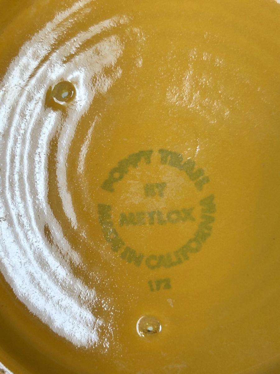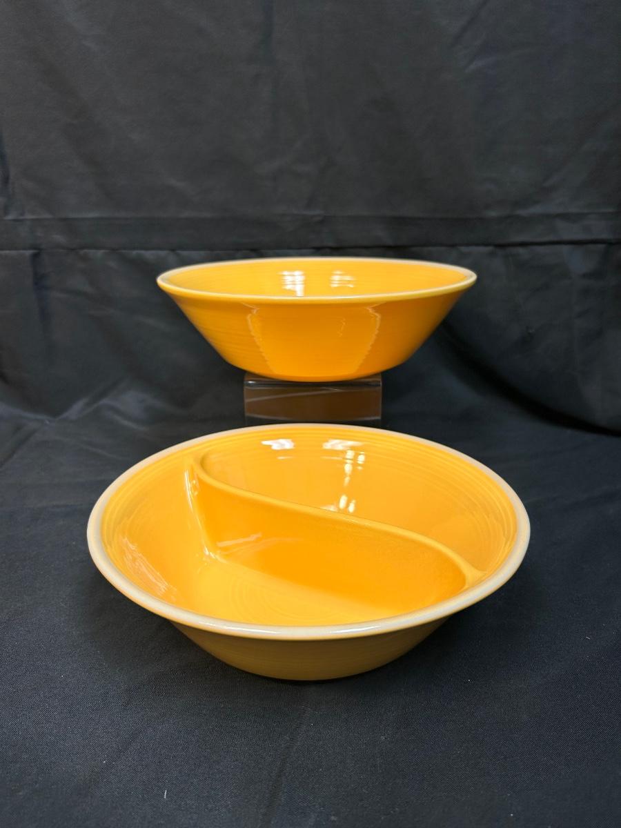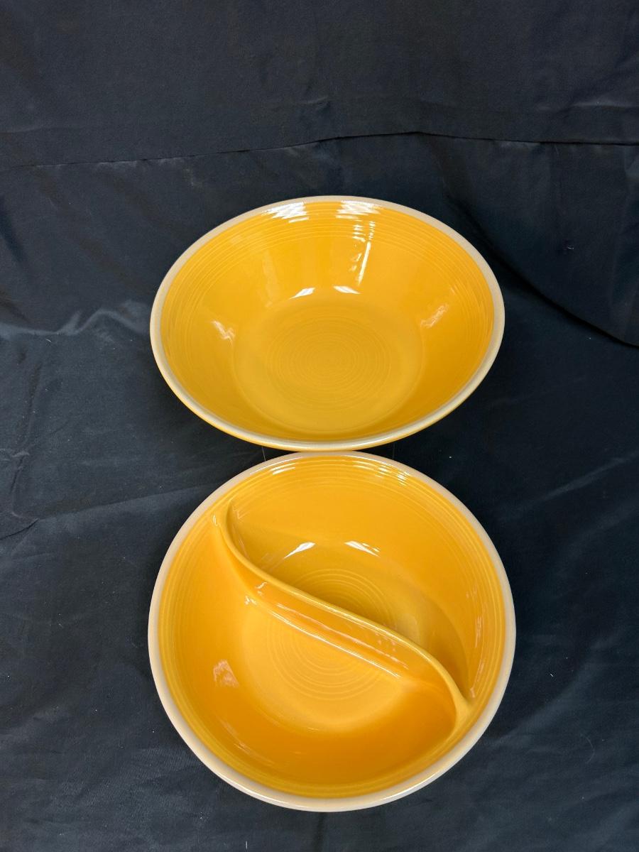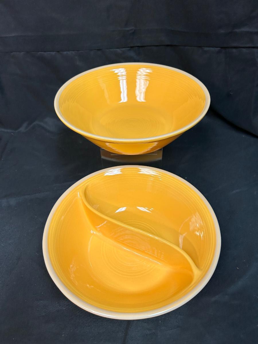 Vintage Cantaloupe Yellow Orange Poppy Trail by Metlox Serving Bowl and Divided Dish. In excellent condition. No chips or cracks found. Great color, not quite orange but not yellow. Both are about 9" size.