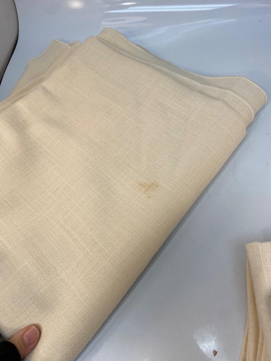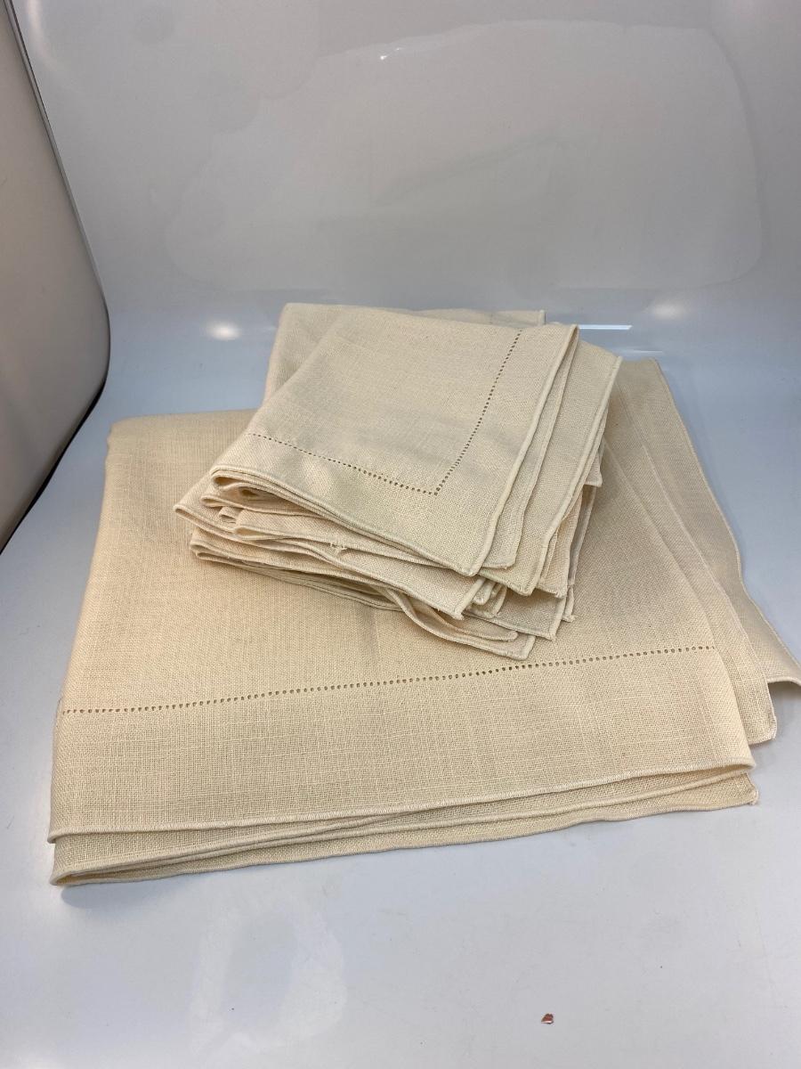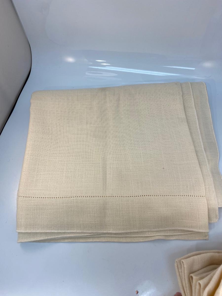 Off White Ivory Tablecloth and Linen Dinner Napkins. Previously used, some light spots and discolor.