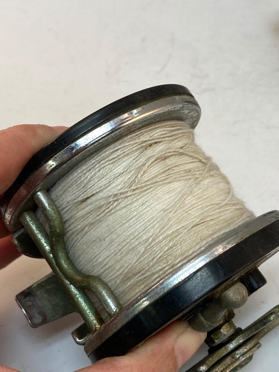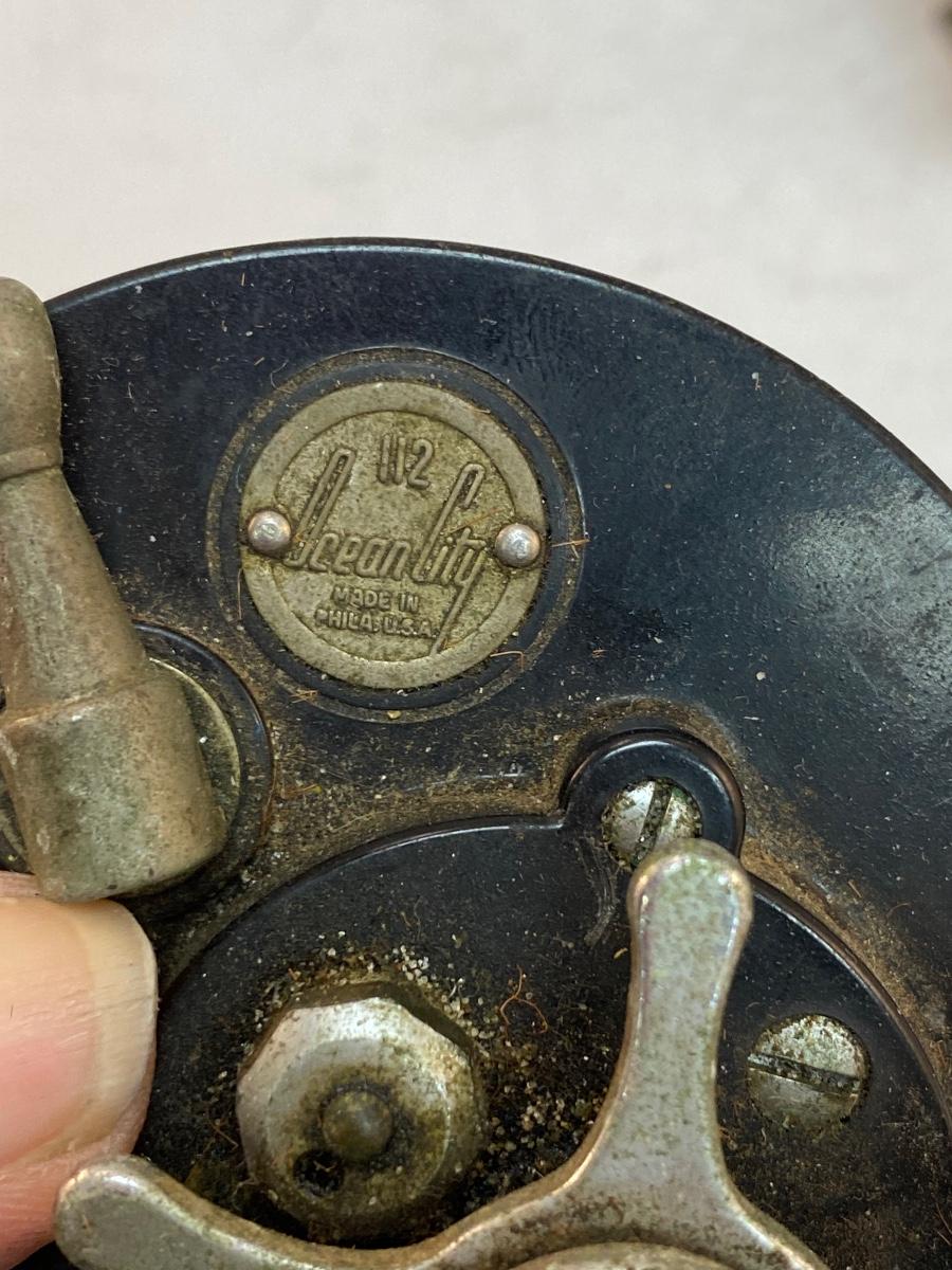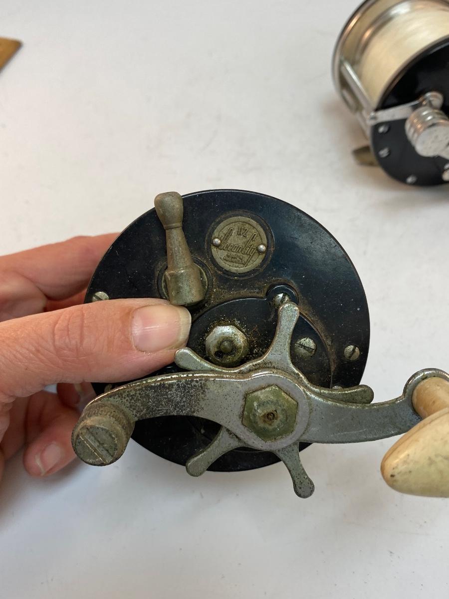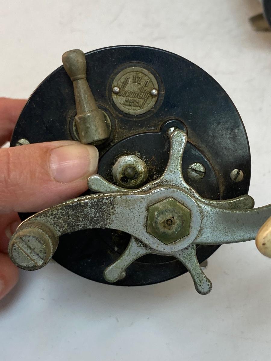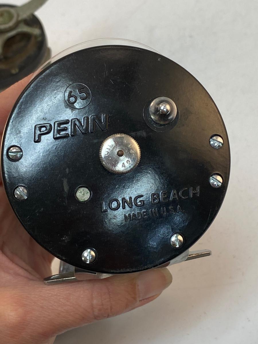 Pair of Vintage Ocean Saltwater Fishing Reels Penn 65 Long Beach Ocean City 112. The Ocean City reel is in worn vintage condition, looks like it was last used as a kite reel, works but needs to be cleaned. The Penn reel is in good working order.