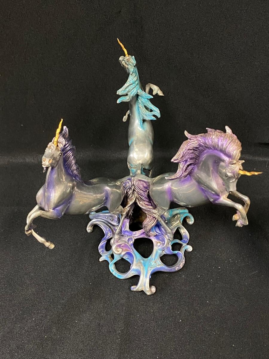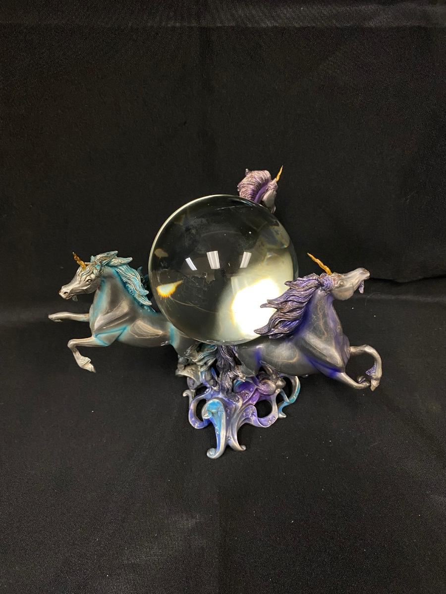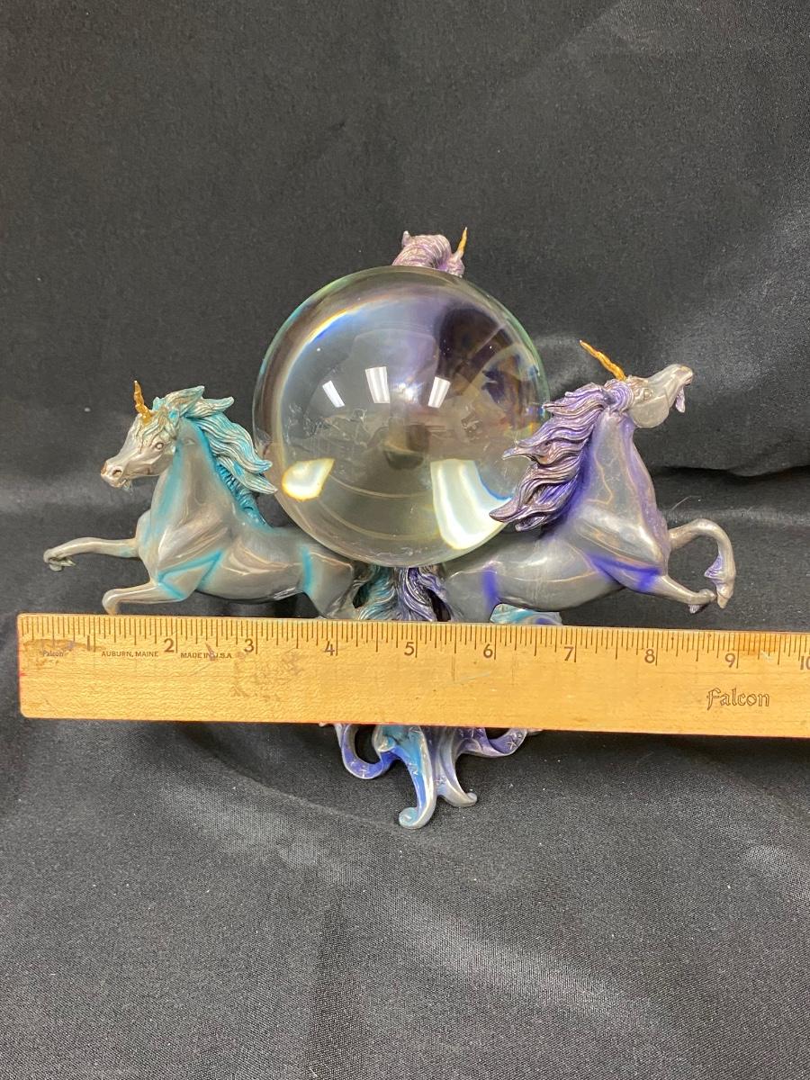 Unicorns of the New Age Pewter Crystal Ball by Sue Dawe The Franklin Mint. In very good condition. Heavy three unicorn pewter stand with crystal ball. Signed and numbered on the bottom. About 7"x9" size.
