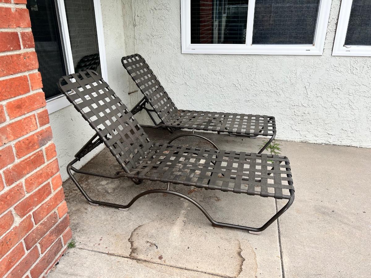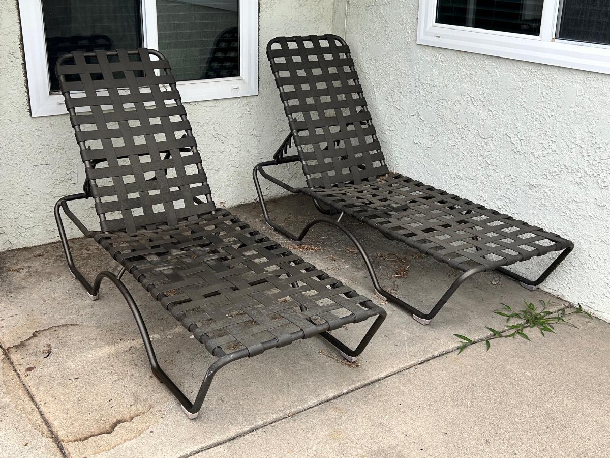 Pair of Metal and Woven Vinyl Strap Patio Pool Side Adjustable Lounge Chairs. In good condition. **WEEKEND OR AFTERNOON PICK UP IN GARDEN GROVE, ARRANGE WITH JENN2**