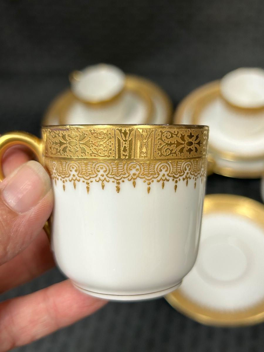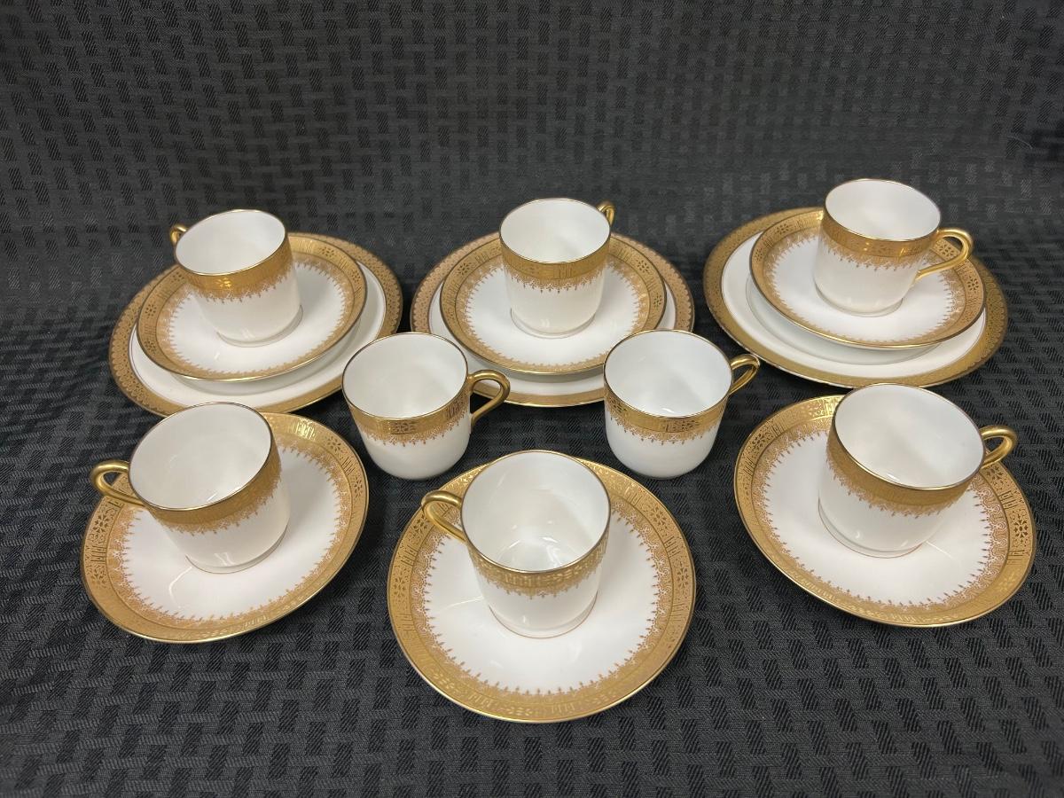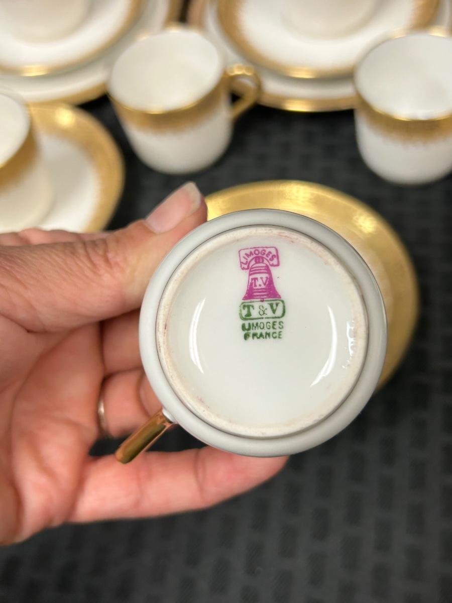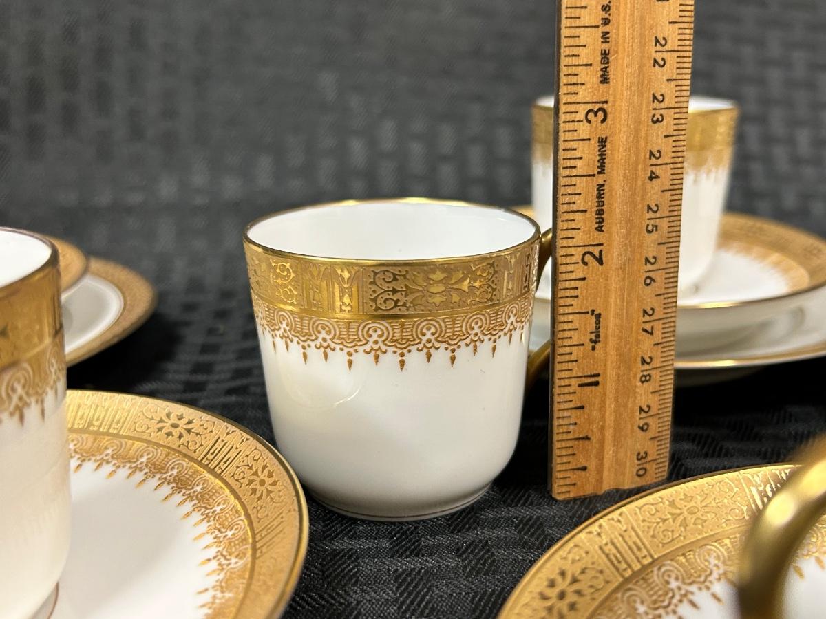 Vintage Regency Style White with Gold Gilt Limoges France Demitasse Teacup and Saucer Plate Set. Stunning gold gilt lace like design around the edges. Stamped Limoges on all pieces. Not a complete set, includes 8 demitasse cups, 6 saucers, and 3 bread/dessert plates. saucers are about 5" and dessert plates are 6". In very good condition, no chips or crazing, may have light wear on outer rim of plate here and there, nothing to noticeable.
