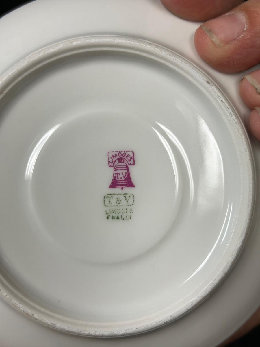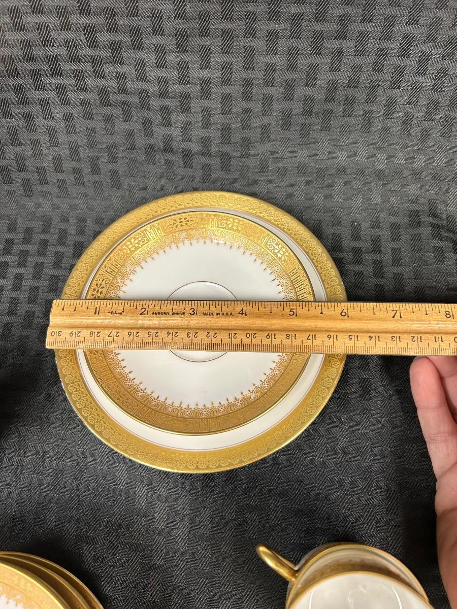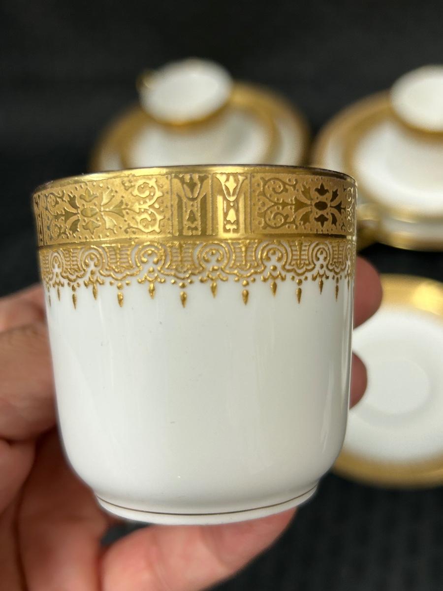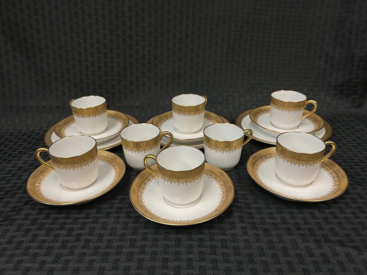 Vintage Regency Style White with Gold Gilt Limoges France Demitasse Teacup and Saucer Plate Set. Stunning gold gilt lace like design around the edges. Stamped Limoges on all pieces. Not a complete set, includes 8 demitasse cups, 6 saucers, and 3 bread/dessert plates. saucers are about 5" and dessert plates are 6". In very good condition, no chips or crazing, may have light wear on outer rim of plate here and there, nothing to noticeable.