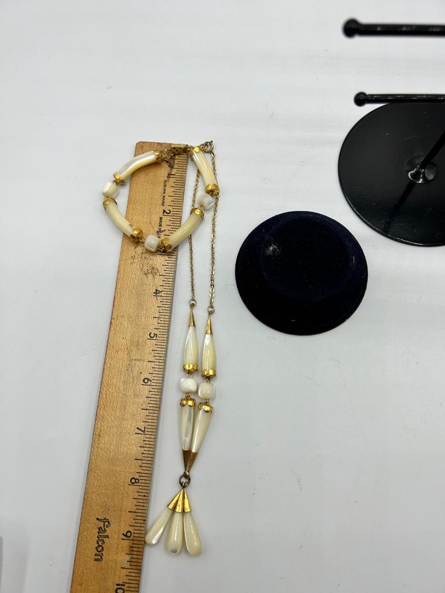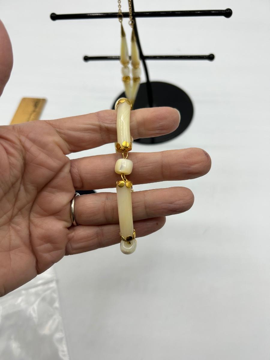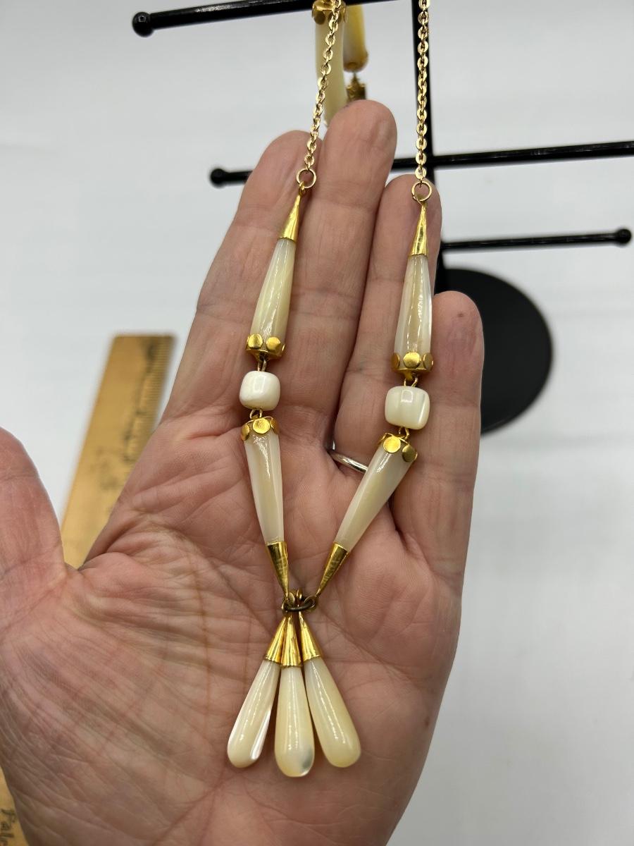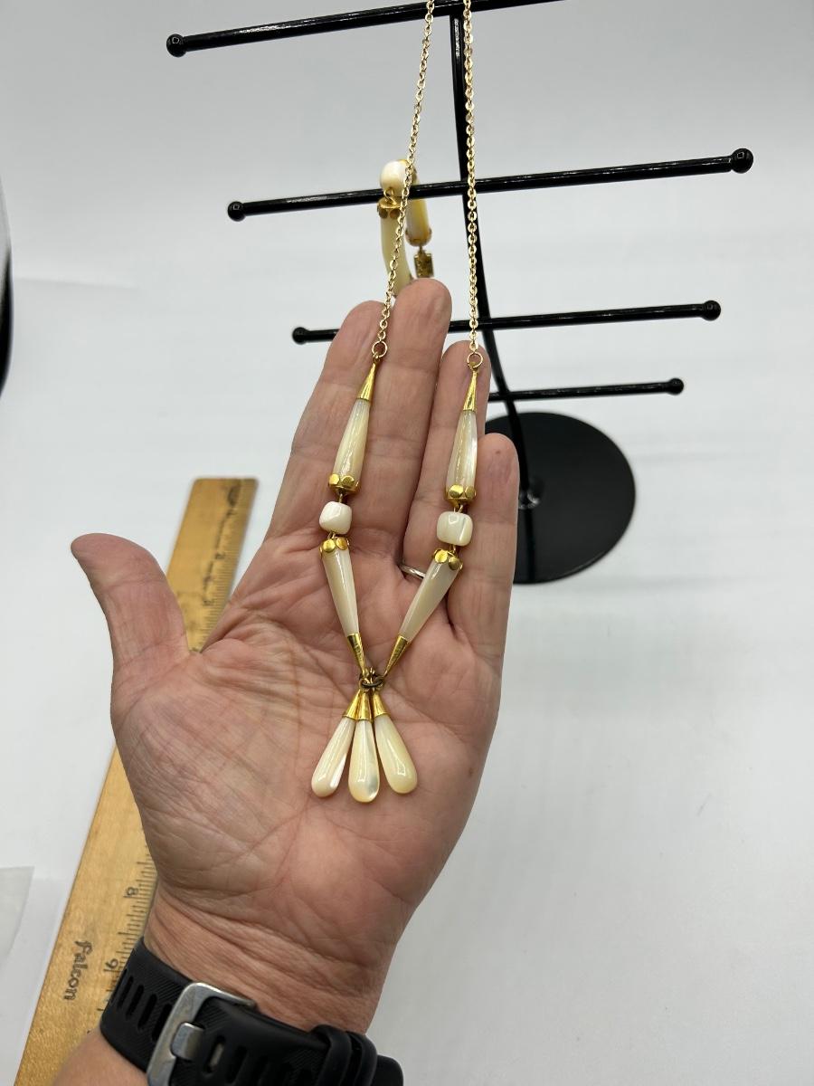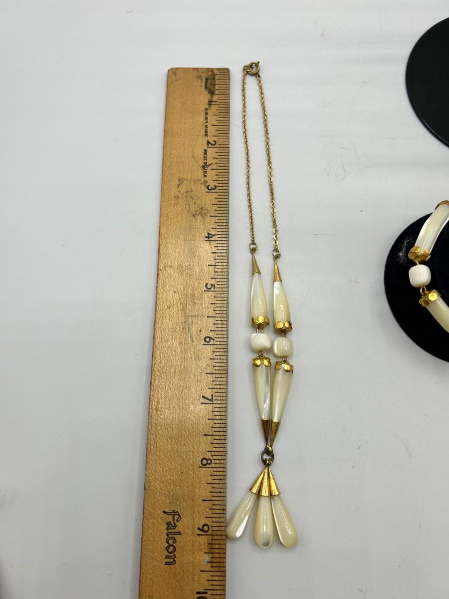 Vintage Moonstone Carved Shell Choker Necklace with Matching Bracelet Gold Tone Setting. In good condition. Choker style necklace. The material used looks to be possibly moonstone or high polished shell, has an opaque iridescent glow to it.