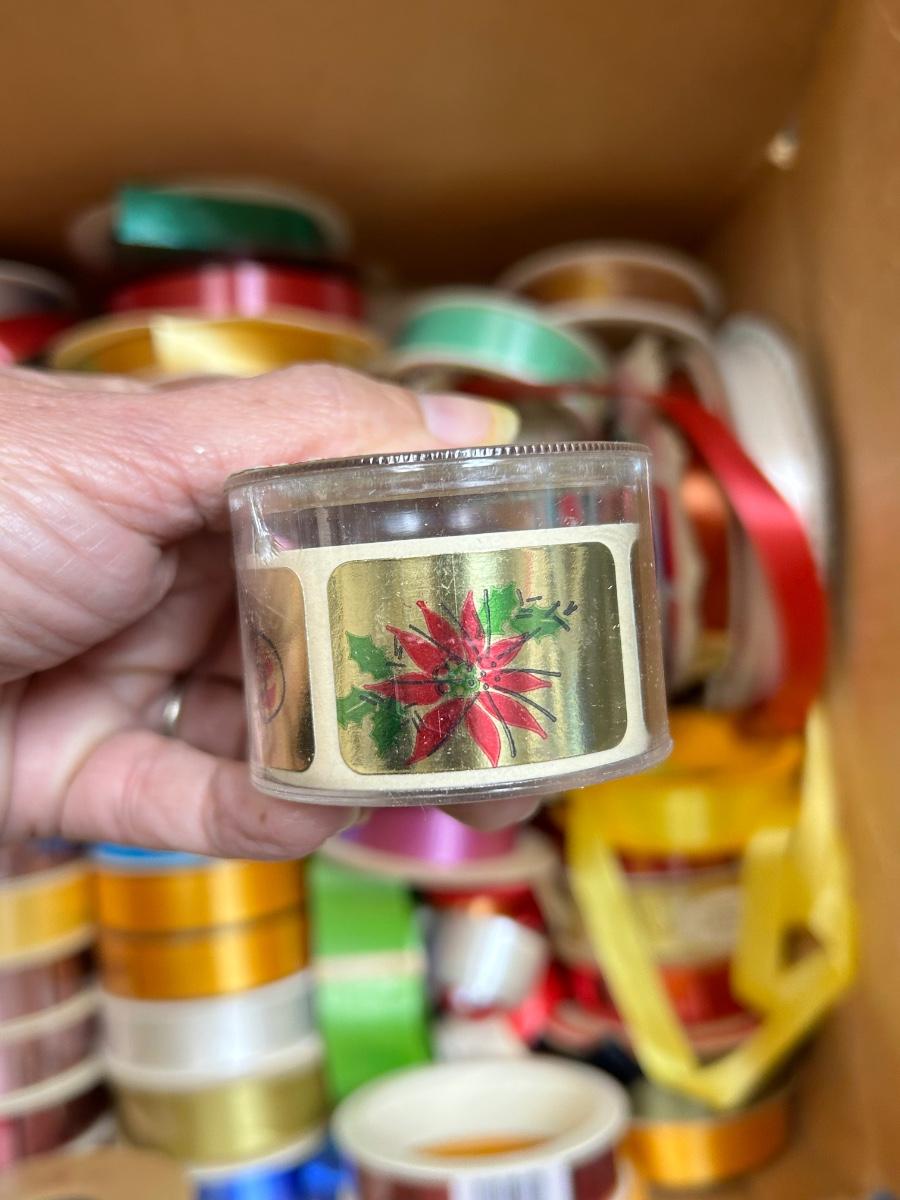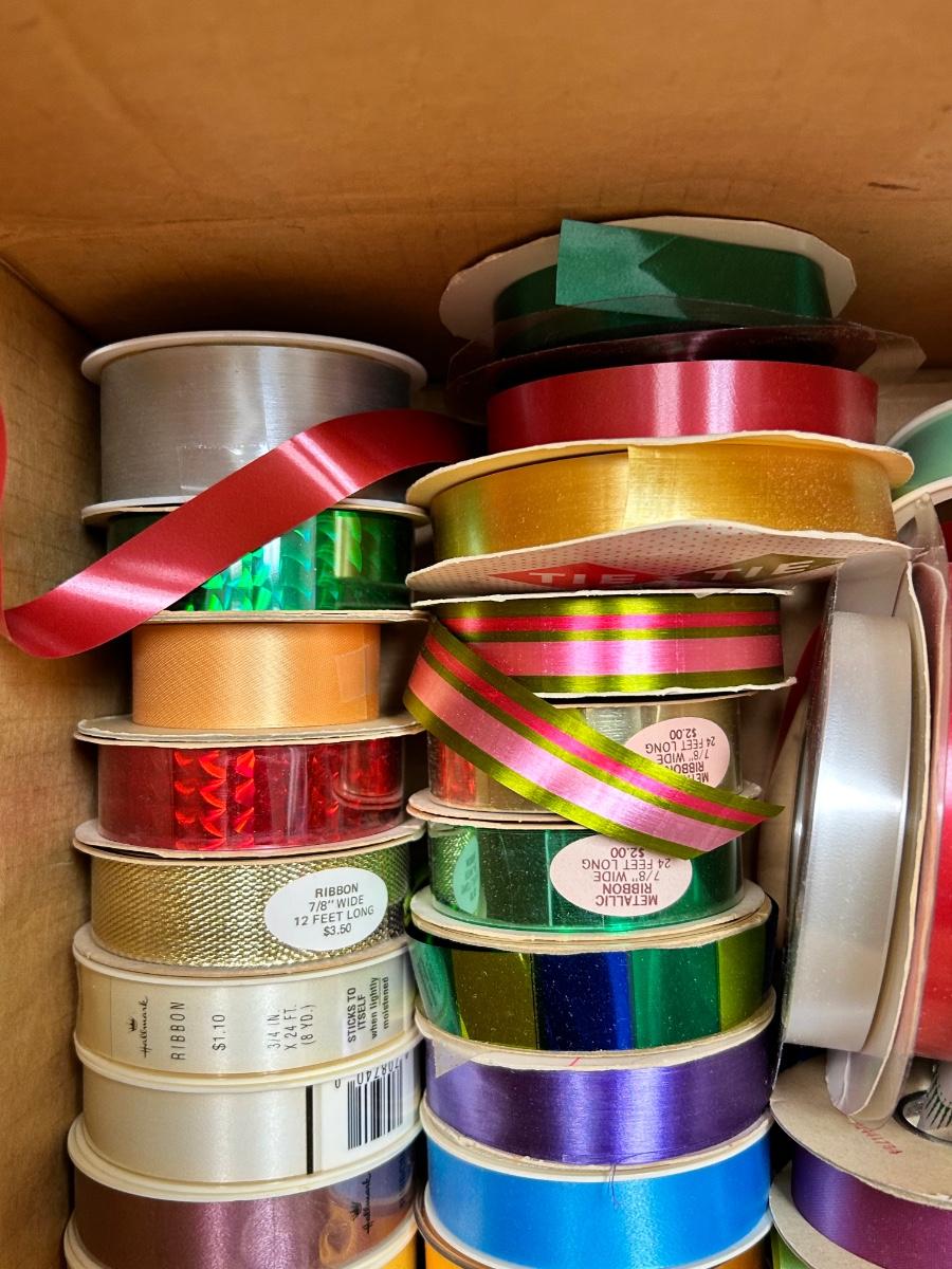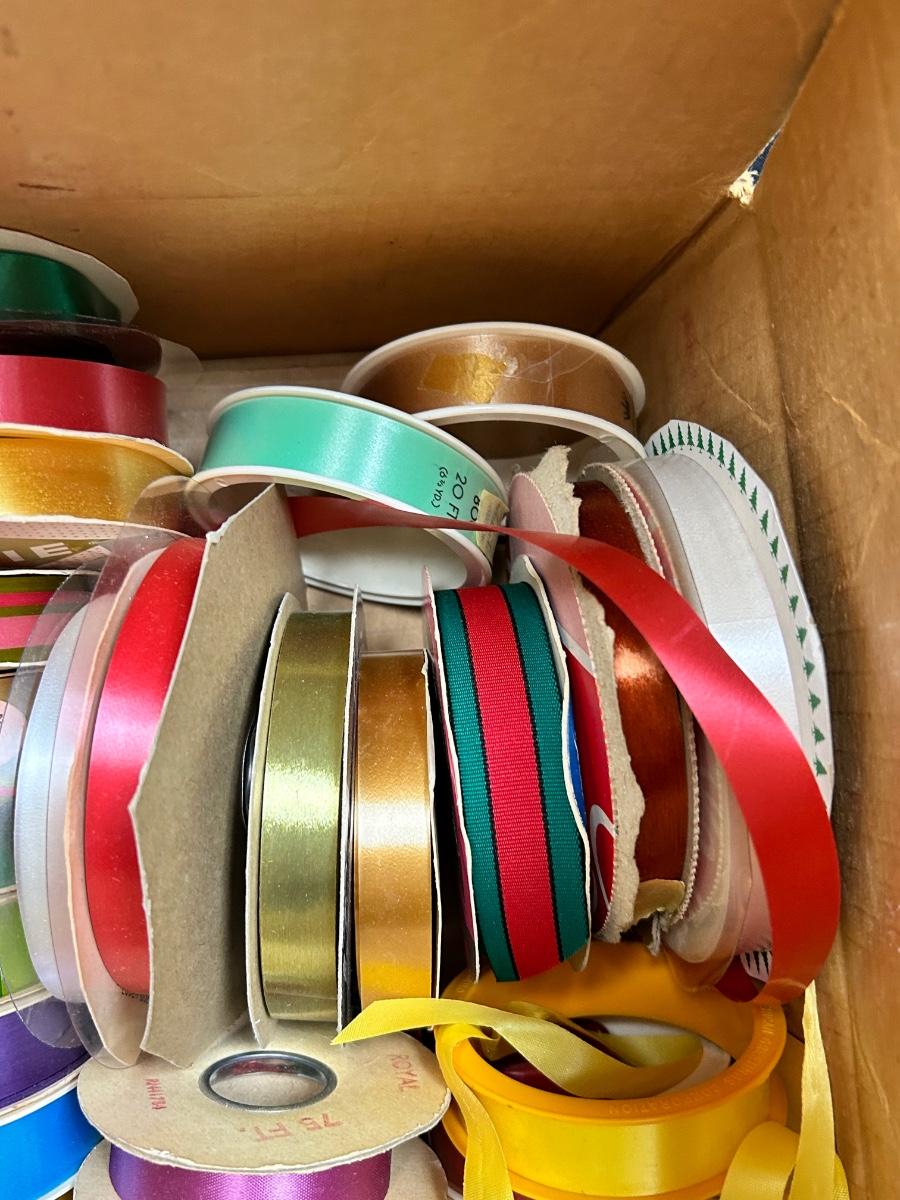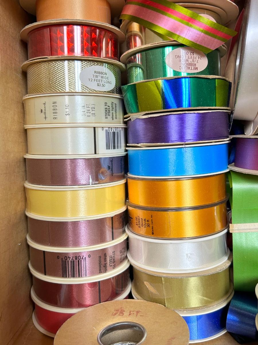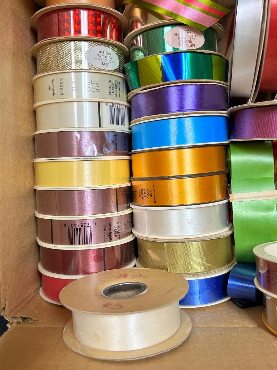 12x12 Box of Vintage Gift Ribbon Spools Various Colors and Sizes Many New