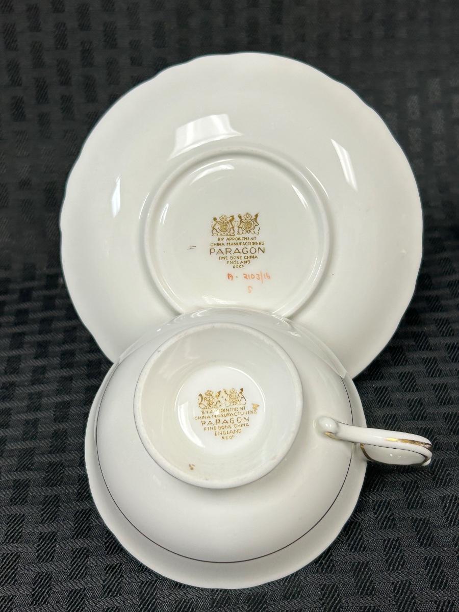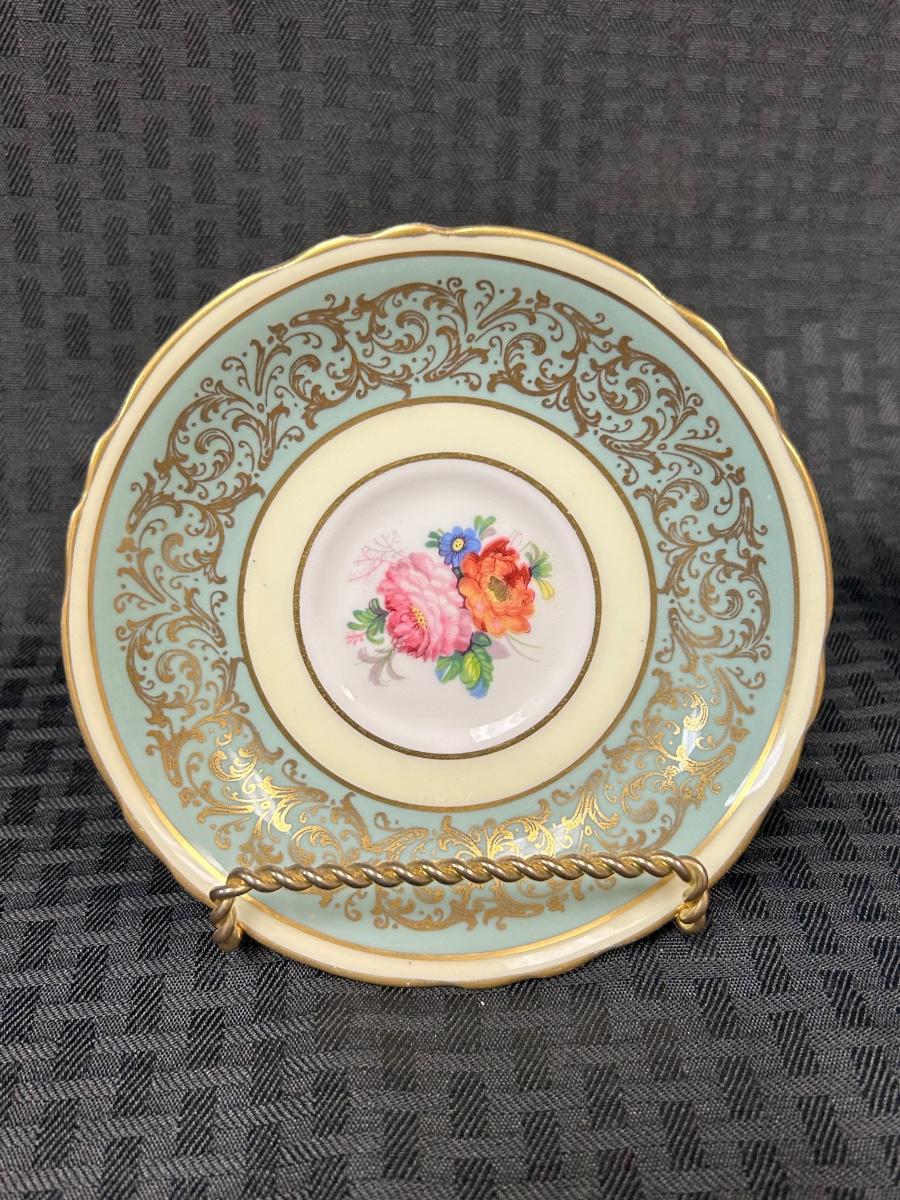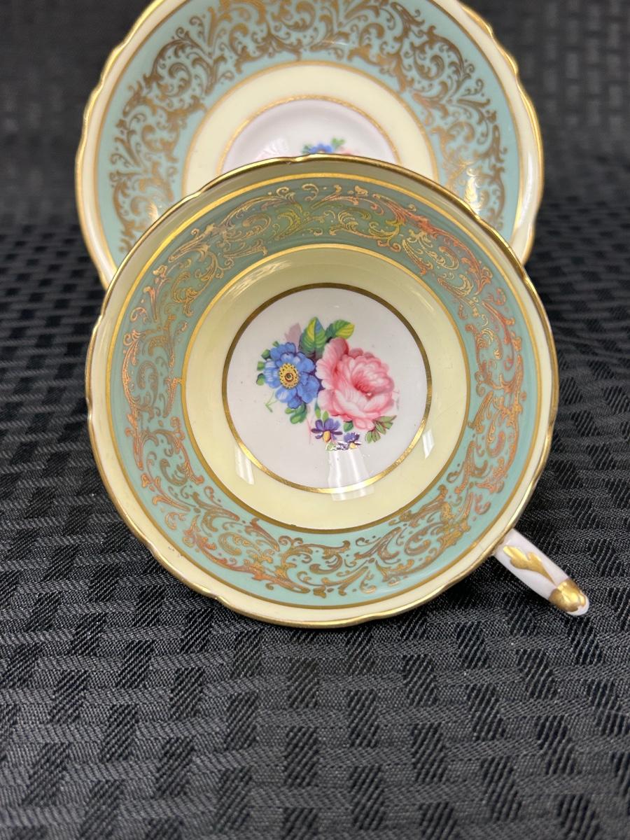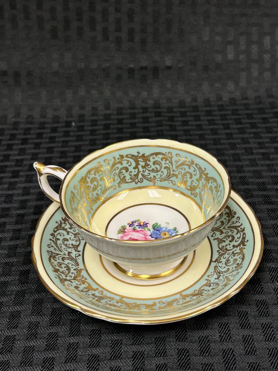 Vintage PARAGON Mint Green and Yellow Floral Center Teacup and Saucer with Gold Gilt Accent. In very good condition.