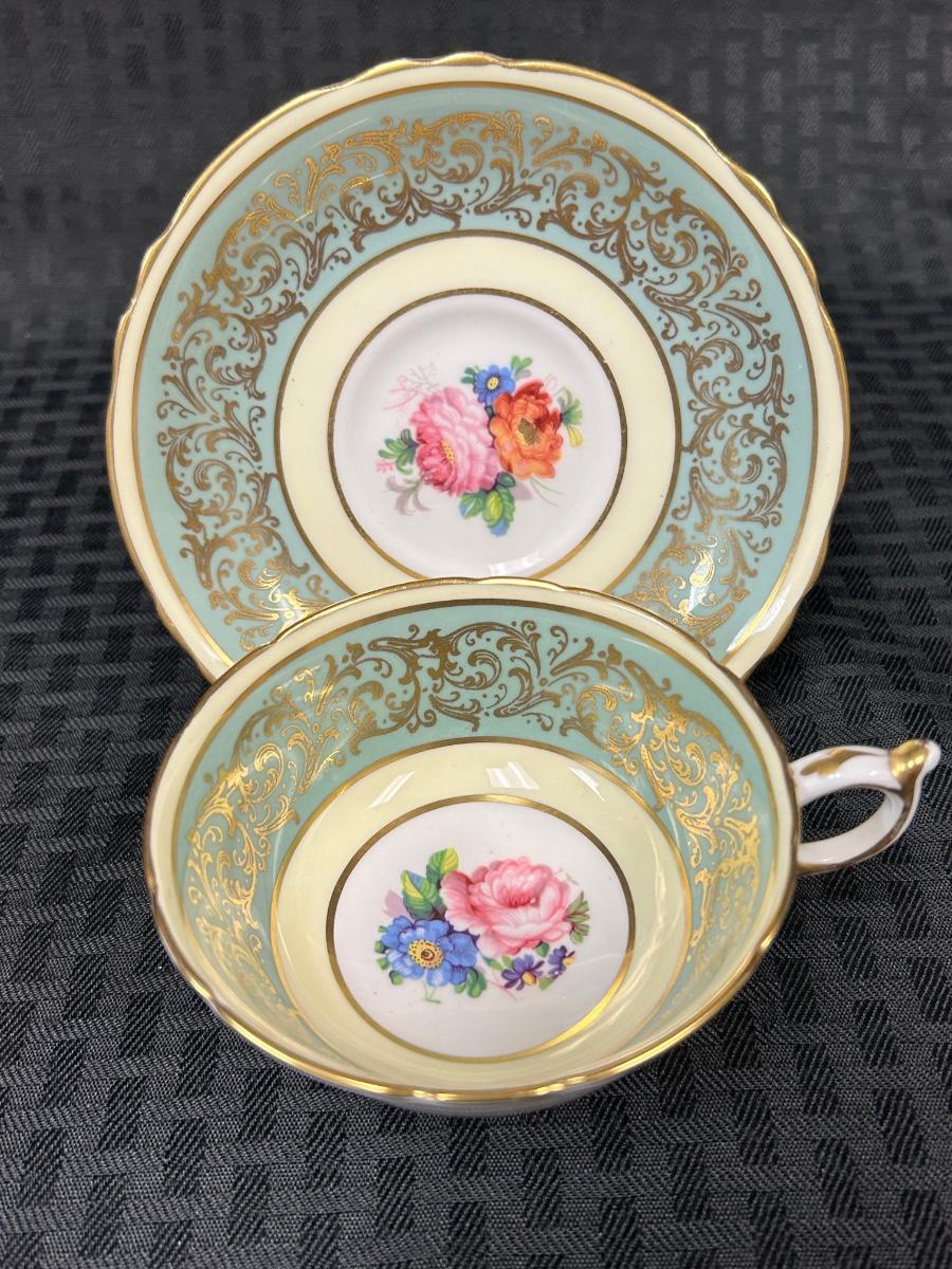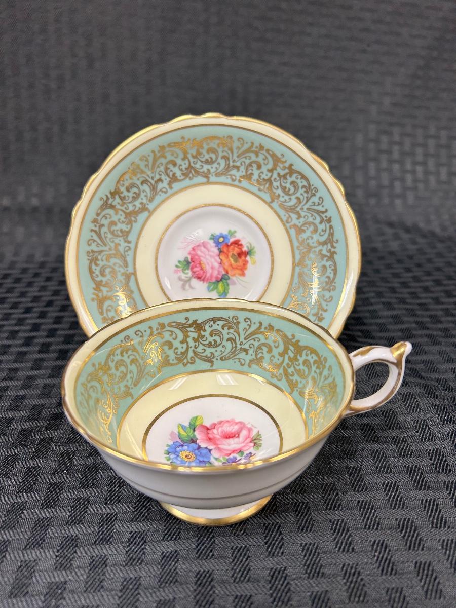 Vintage PARAGON Mint Green and Yellow Floral Center Teacup and Saucer with Gold Gilt Accent
