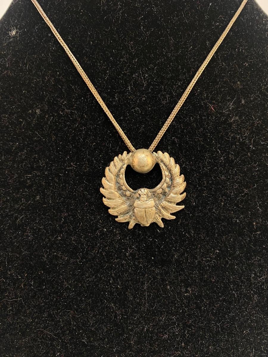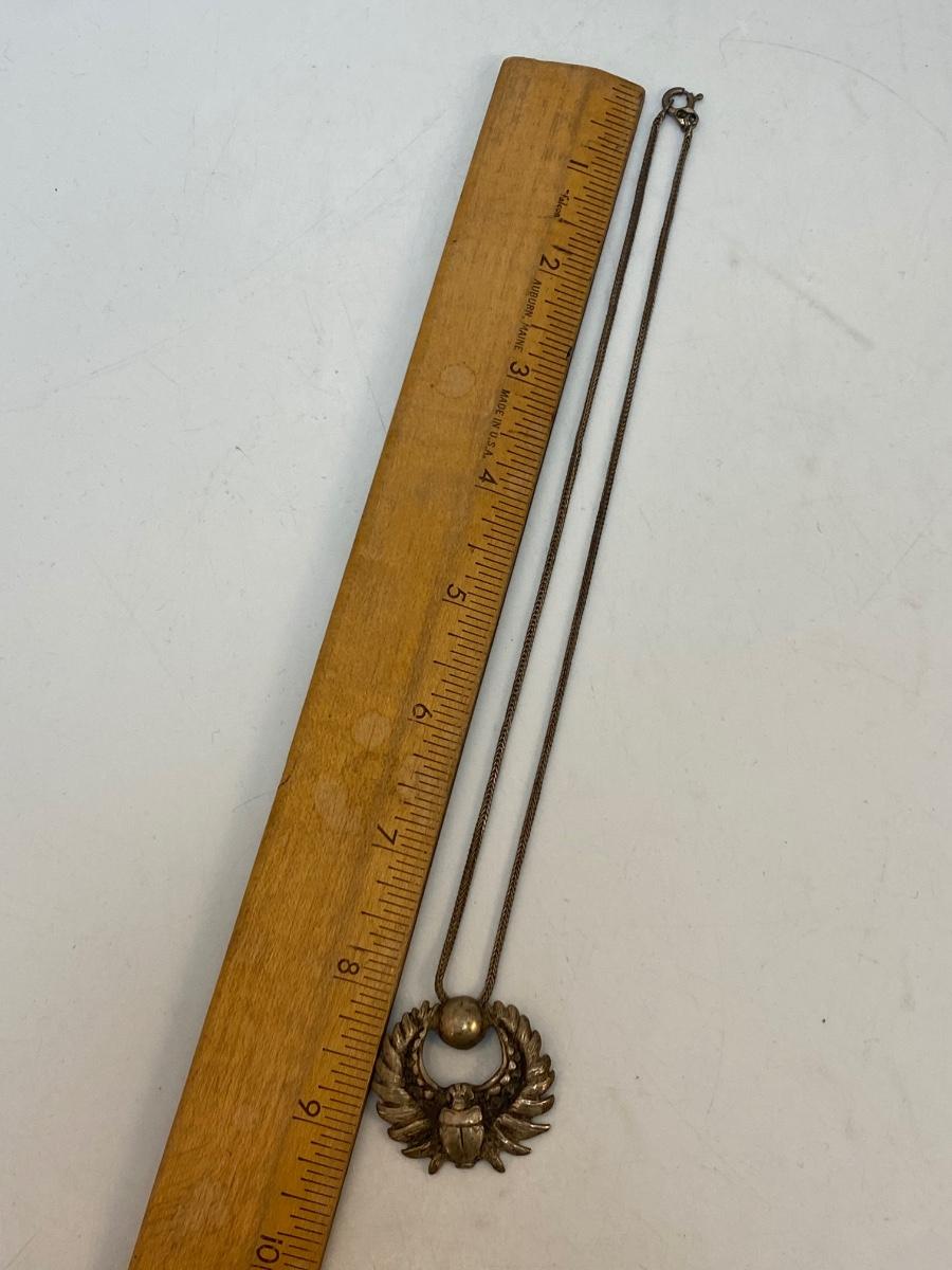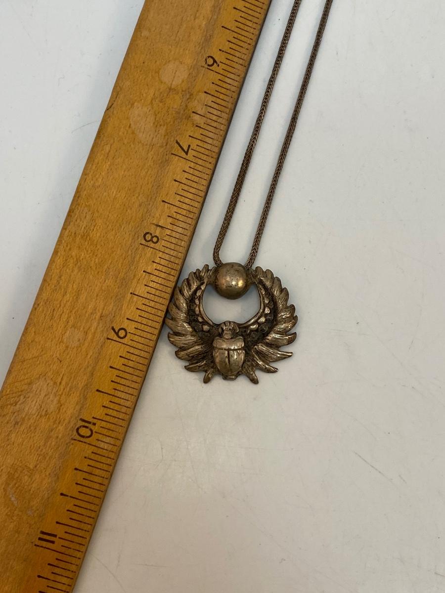 Vintage Sterling Silver Egyptian Revival Winged Scarab Pendant Necklace. In good condition. Needs a little bit of polish. About 1.25" size. Marked on the back.