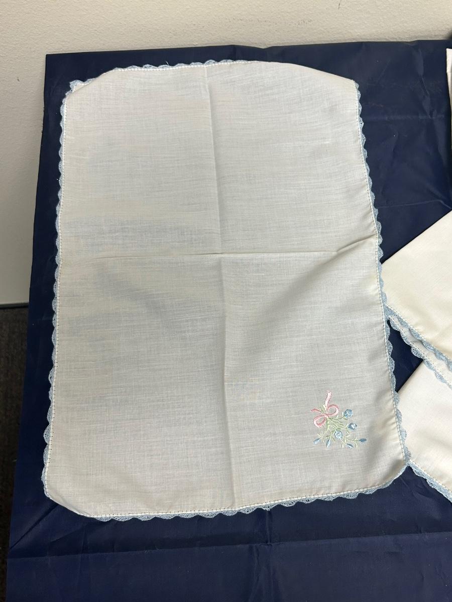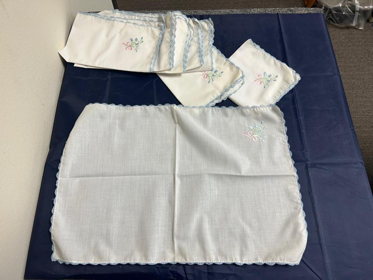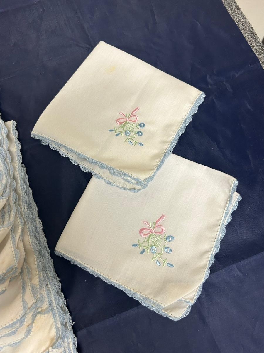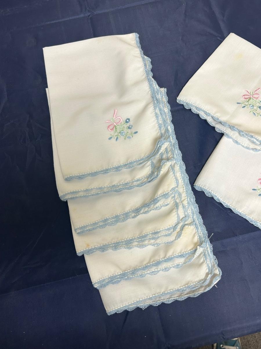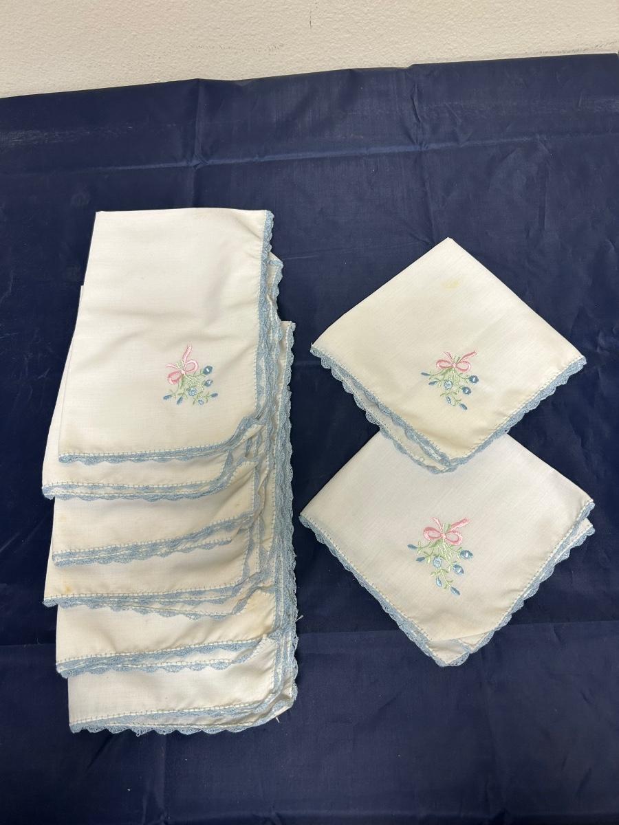 Vintage Flower Embroidered Blue Scalloped Lace Edge Hanky Table Linen Napkins. 8 total but the two folded in squares are smaller than the other six. All look to be in good vintage condition.