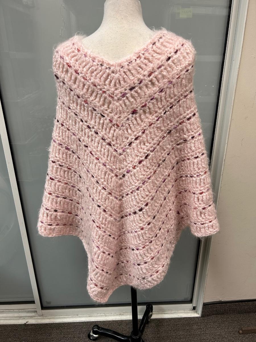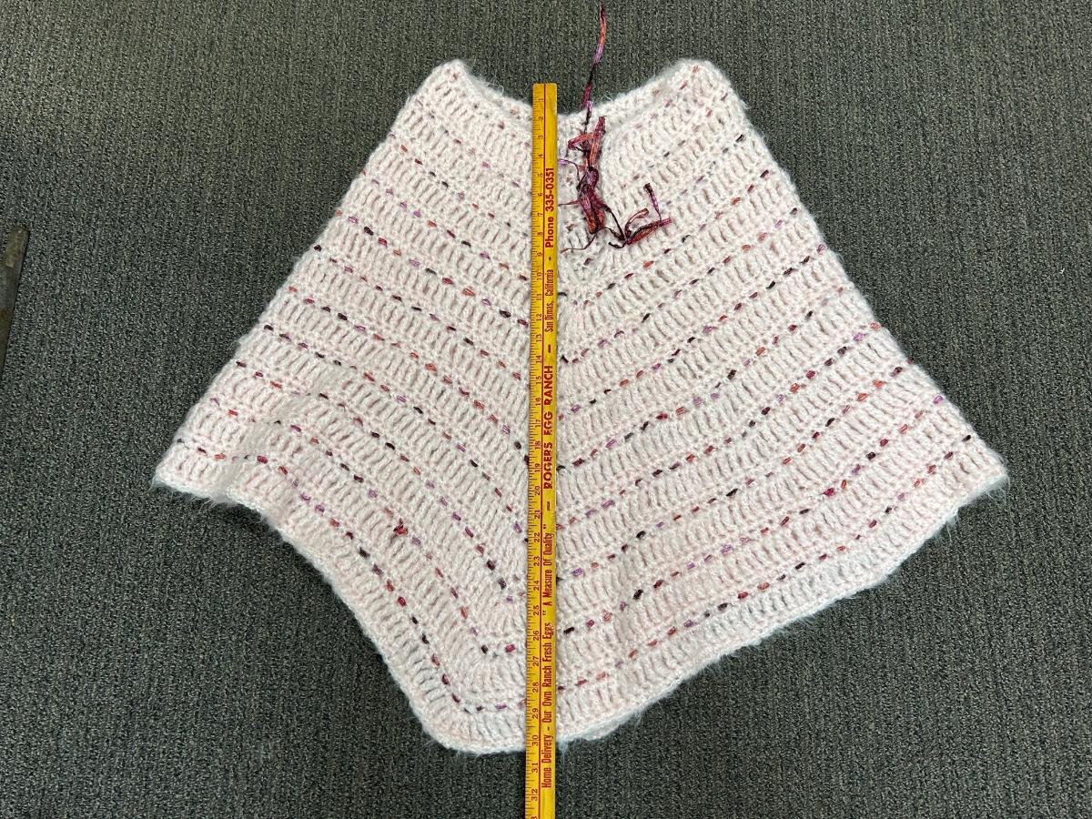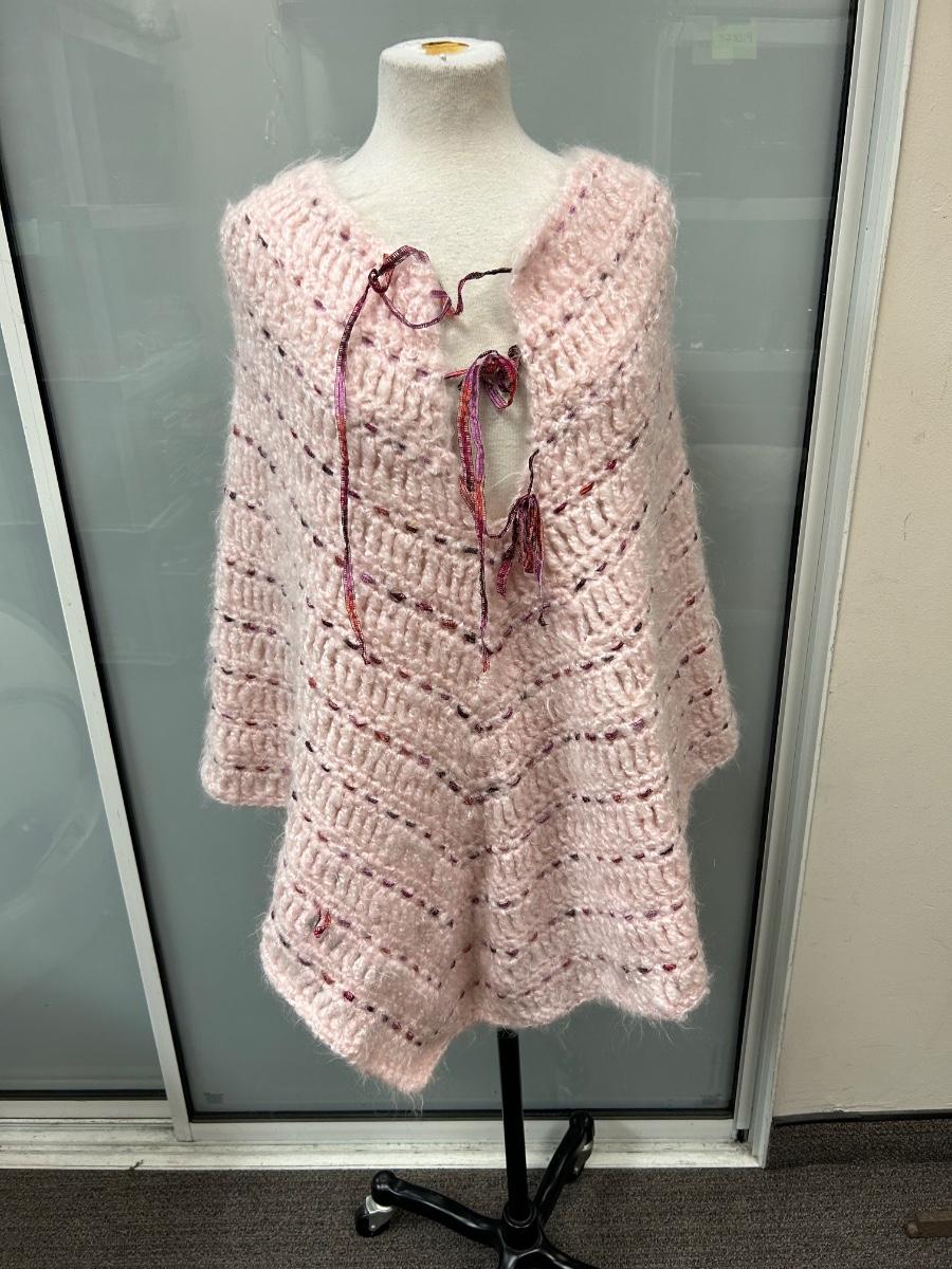 Vintage Handmade Crochet Baby Pink Soft Poncho Pullover Shawl with Ribbon Ties. In good vintage condition. Super soft. It is a little misshapen from being on a hanger and the top ribbon has a small knot that needs to be undone. Size wise it is probably a small medium based on other clothing from the same estate.