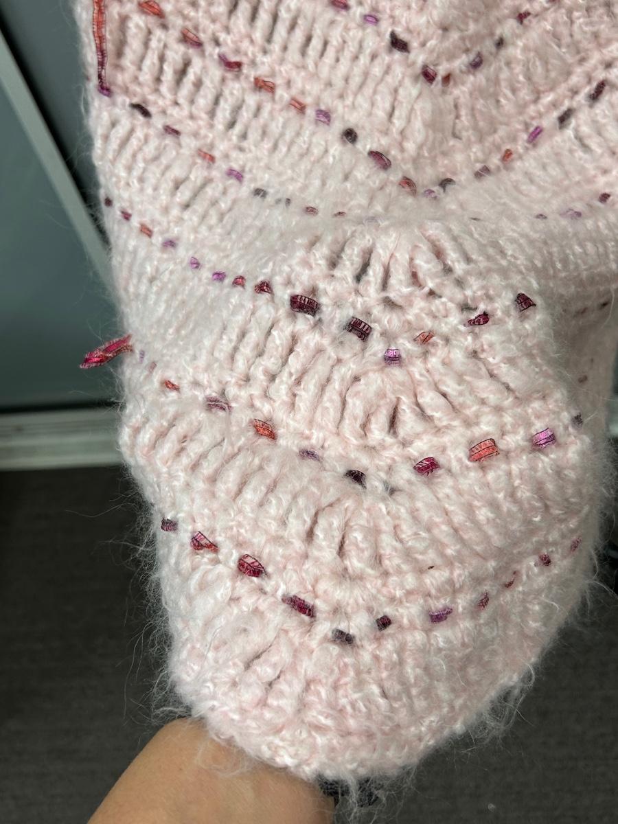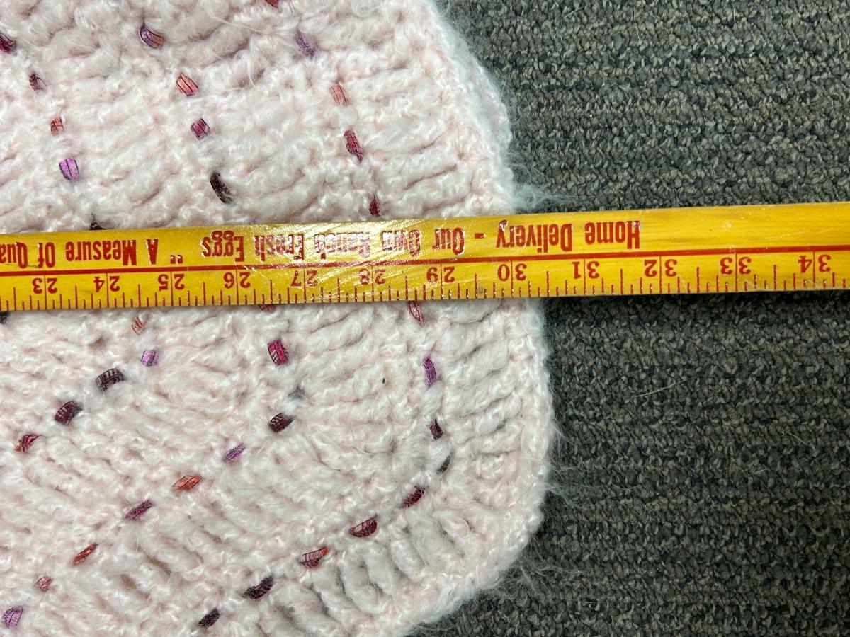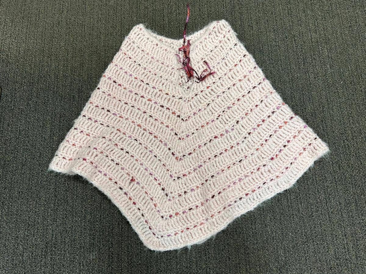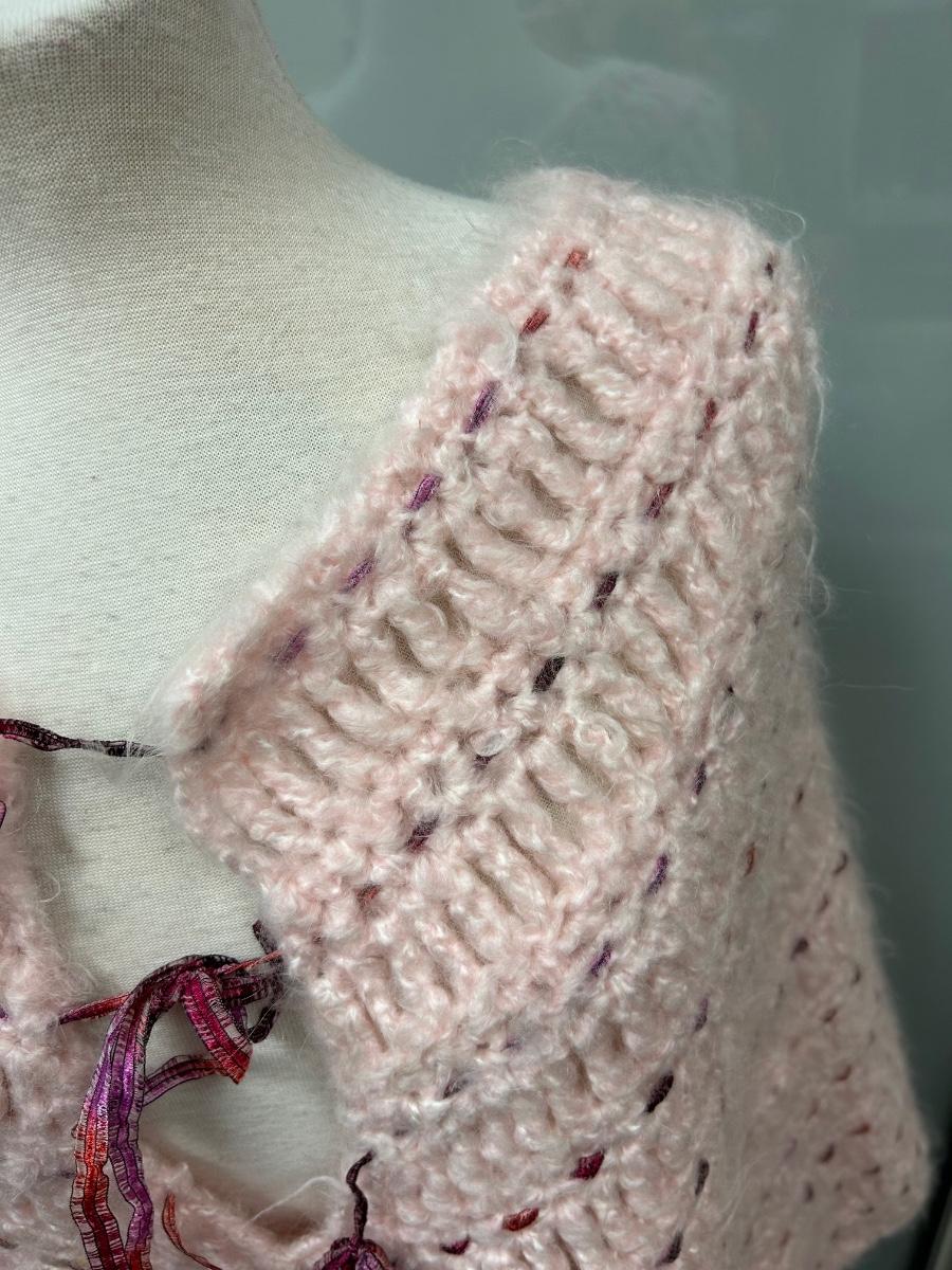 Vintage Handmade Crochet Baby Pink Soft Poncho Pullover Shawl with Ribbon Ties. In good vintage condition. Super soft. It is a little misshapen from being on a hanger and the top ribbon has a small knot that needs to be undone. Size wise it is probably a small medium based on other clothing from the same estate.