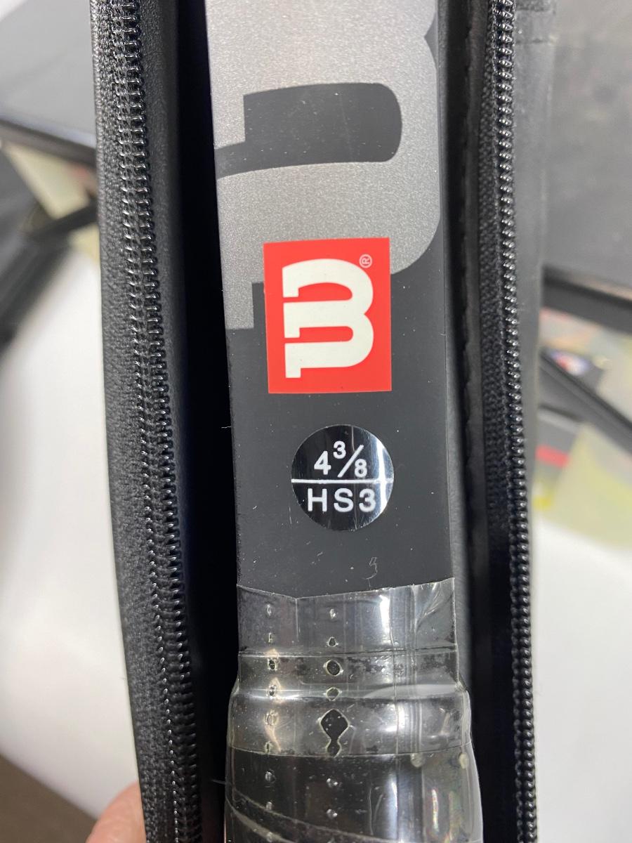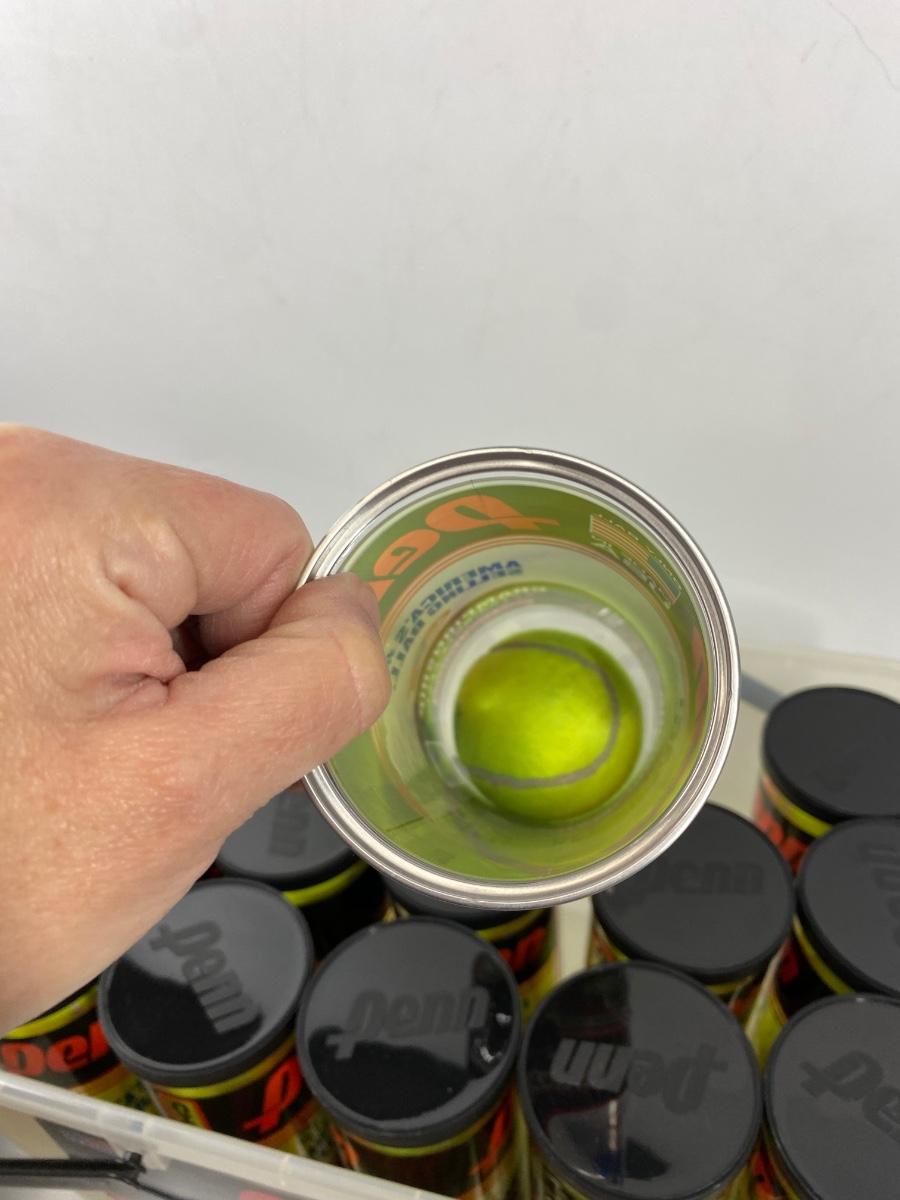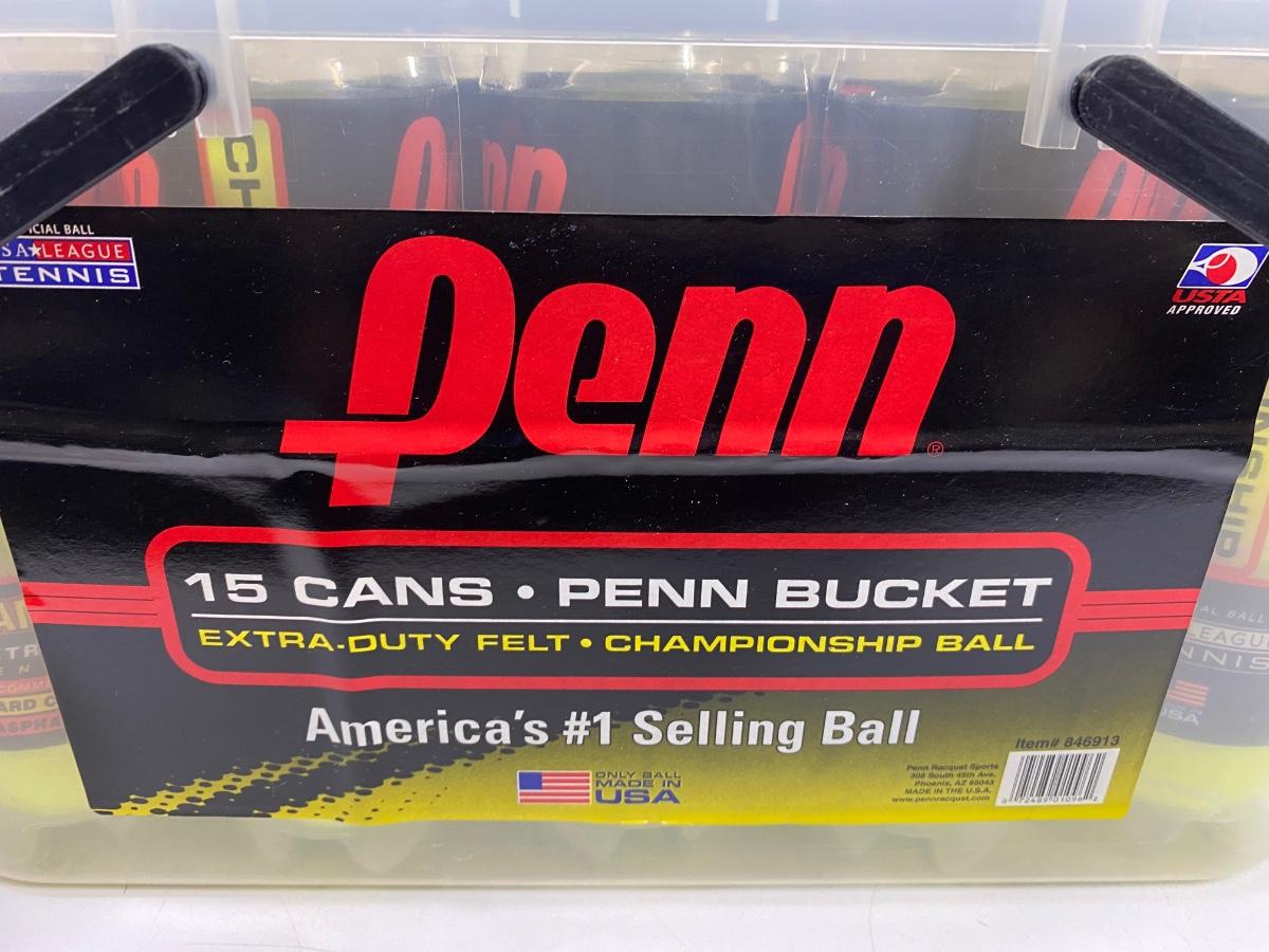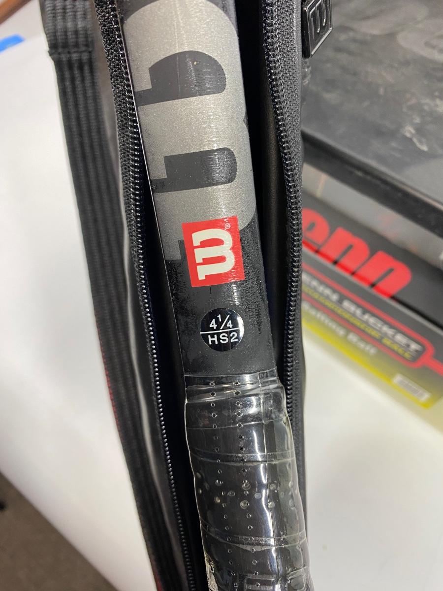 Pair of Never Used New Wilson Tennis Rackets & Bin of PENN Tennis Balls. Rackets are new old stock. Never used, cardboard on face and plastic on handles but the rubber around frame is a little tacky from age. Rackets are slightly different one is a 4 3/8 HS3 and the other is a 4 1/4 HS2. Cases are in good condition. Bin of tennis balls is more than half full of new unopened tennis ball canisters.