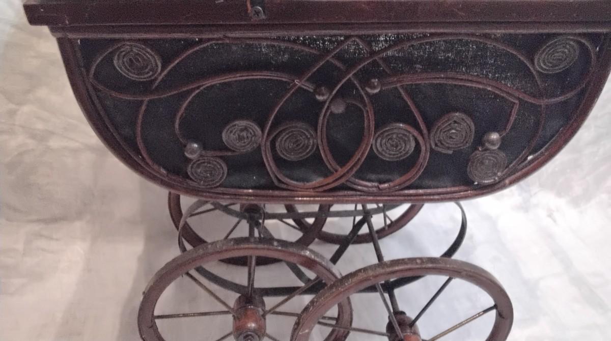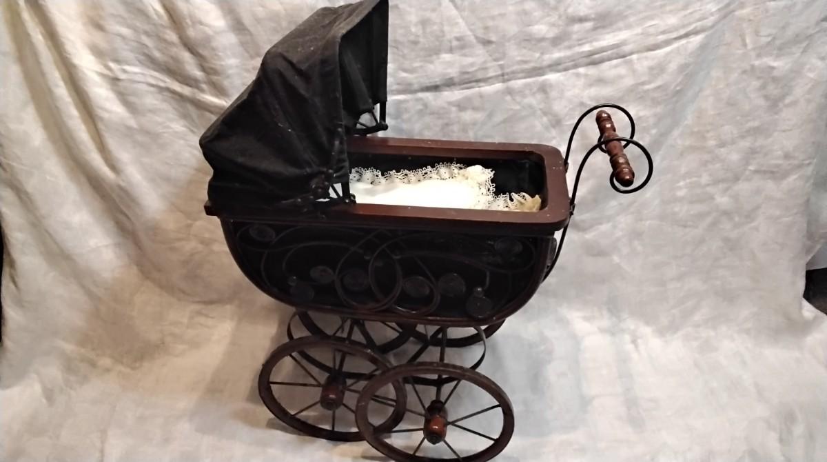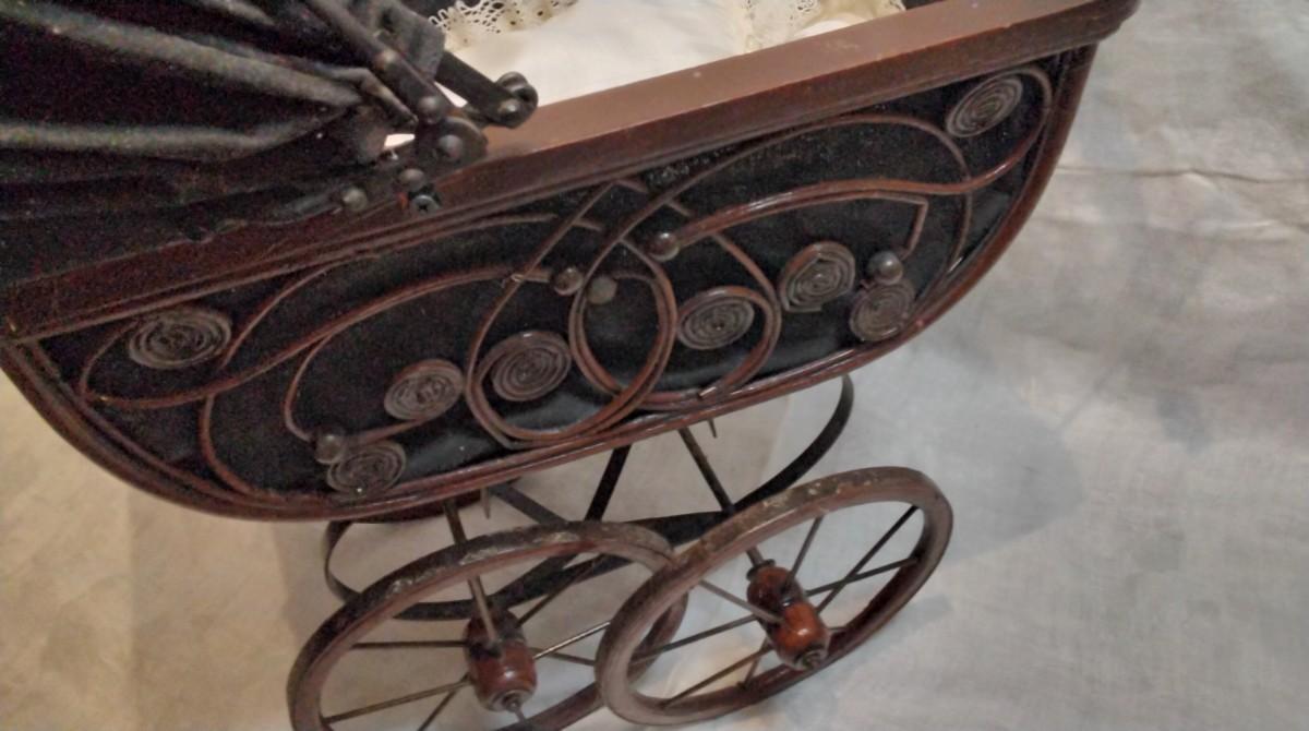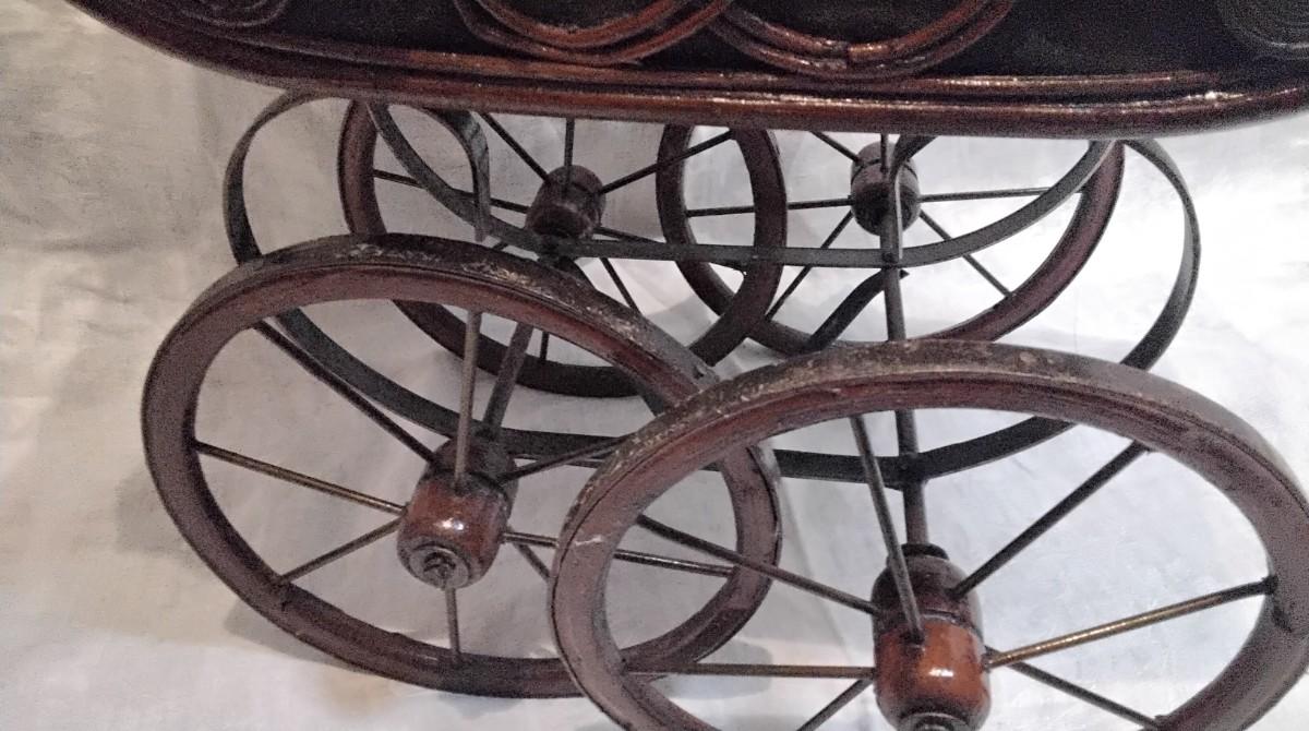 The wealthy families during the Victorian era would order these for their little princesses to roll their dolls around. Everything works and it is in beautiful condition. 20" long 17" tall 10" wide