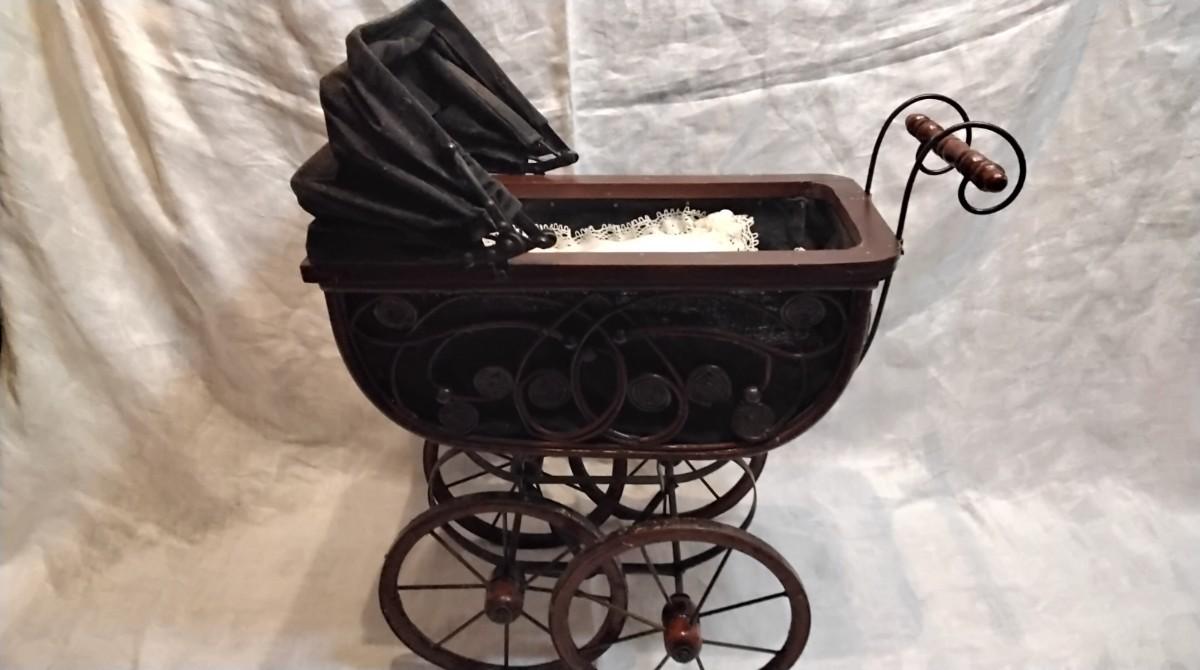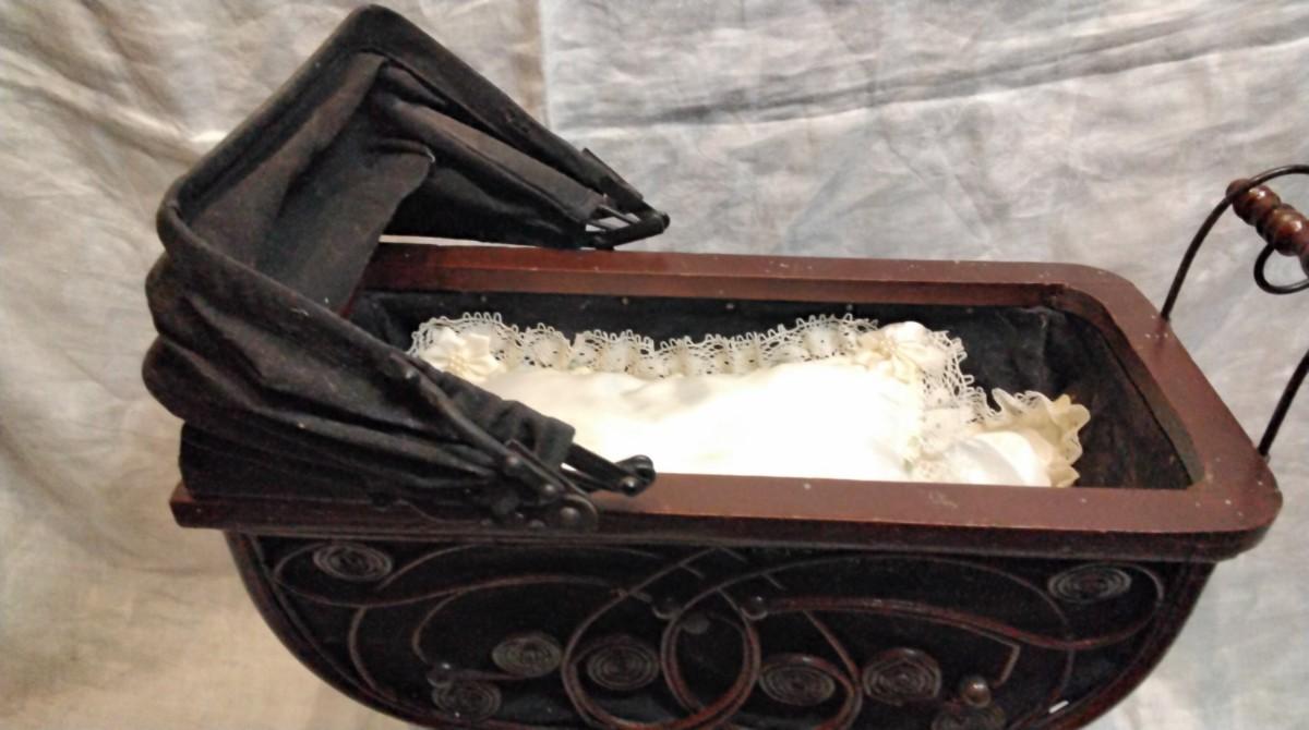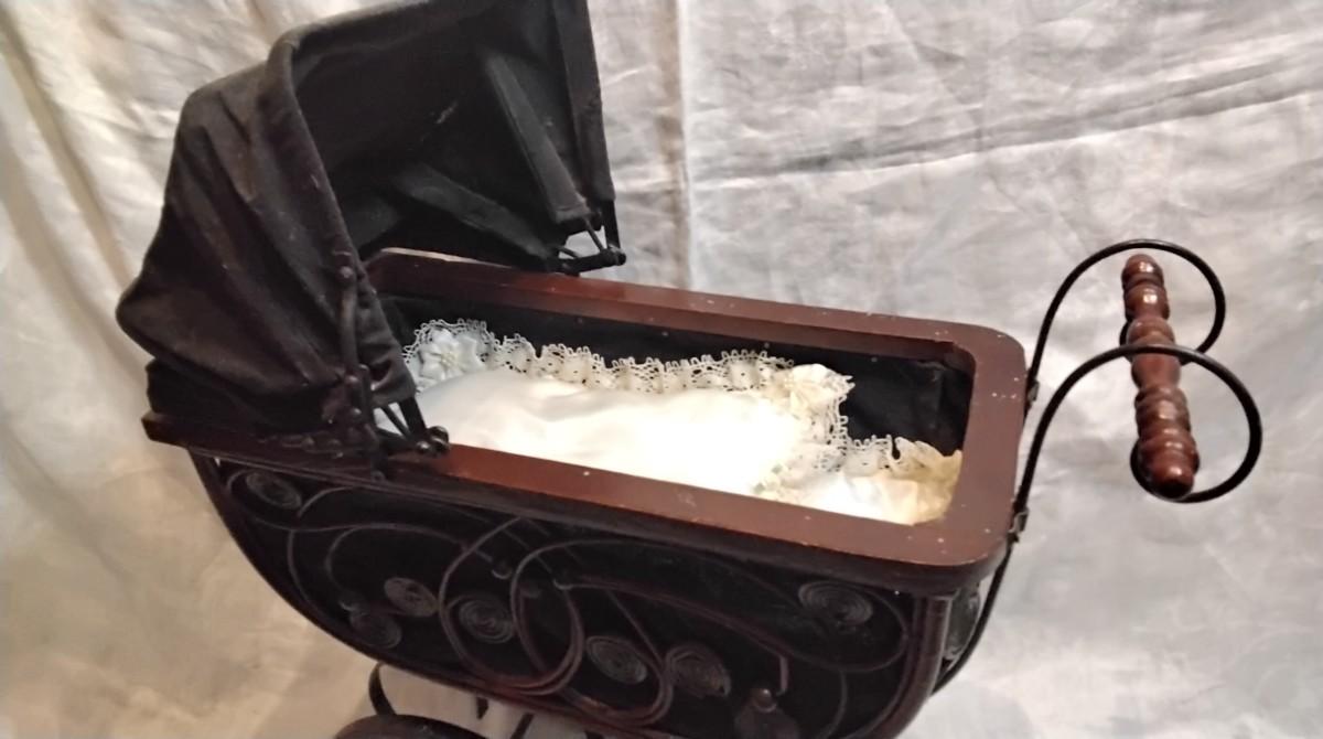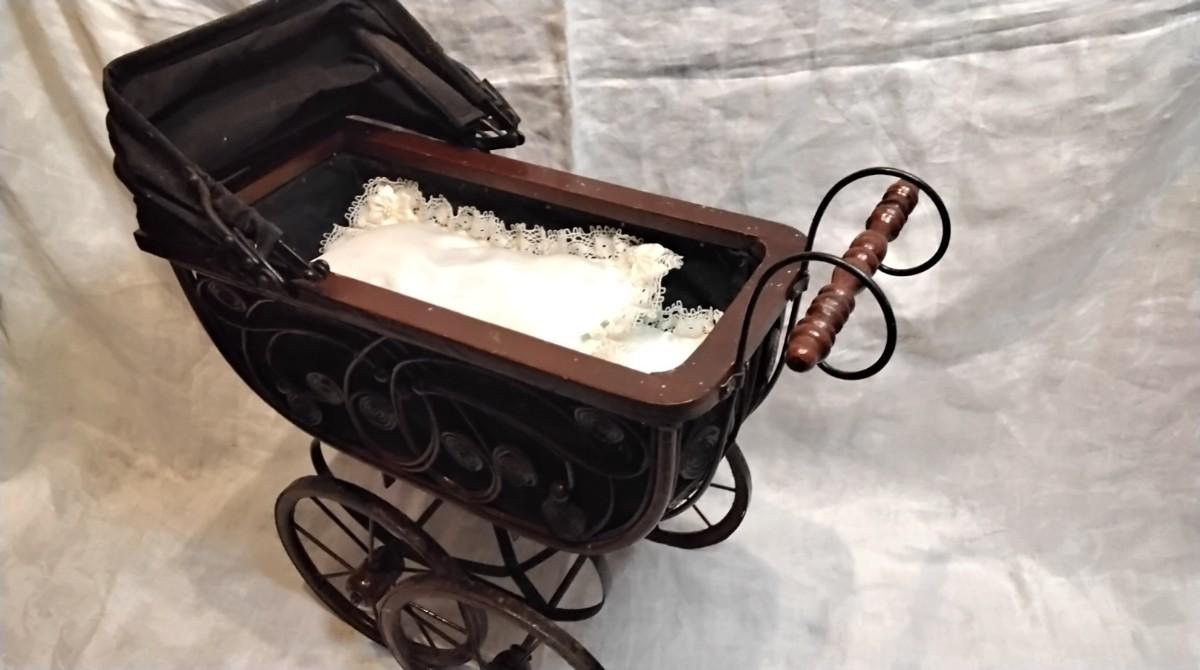 The wealthy families during the Victorian era would order these for their little princesses to roll their dolls around. Everything works and it is in beautiful condition. 20" long 17" tall 10" wide