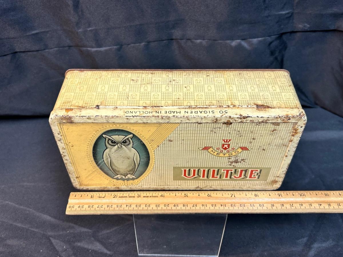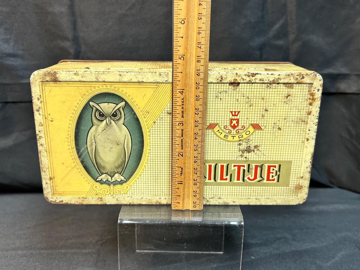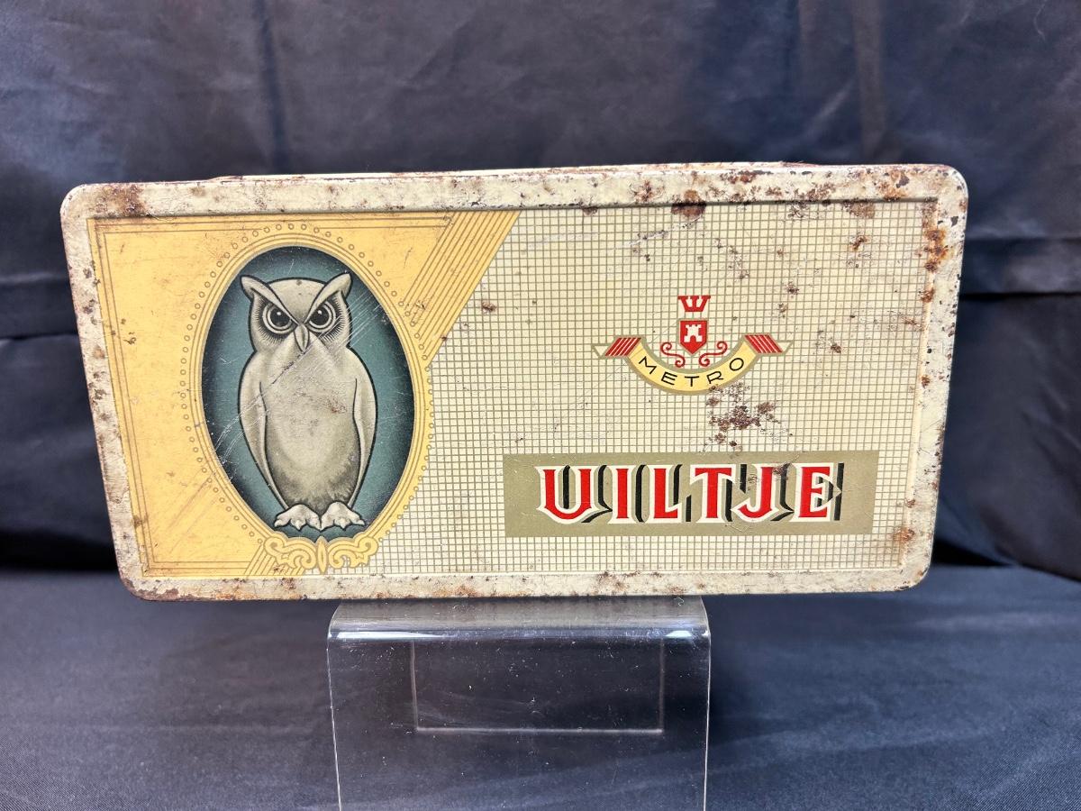 Vintage Metal Tin Cigar Cigarette Box Holland Owl Logo Uiltje Metro. In aged condition, some signs of age and rust but displays well.